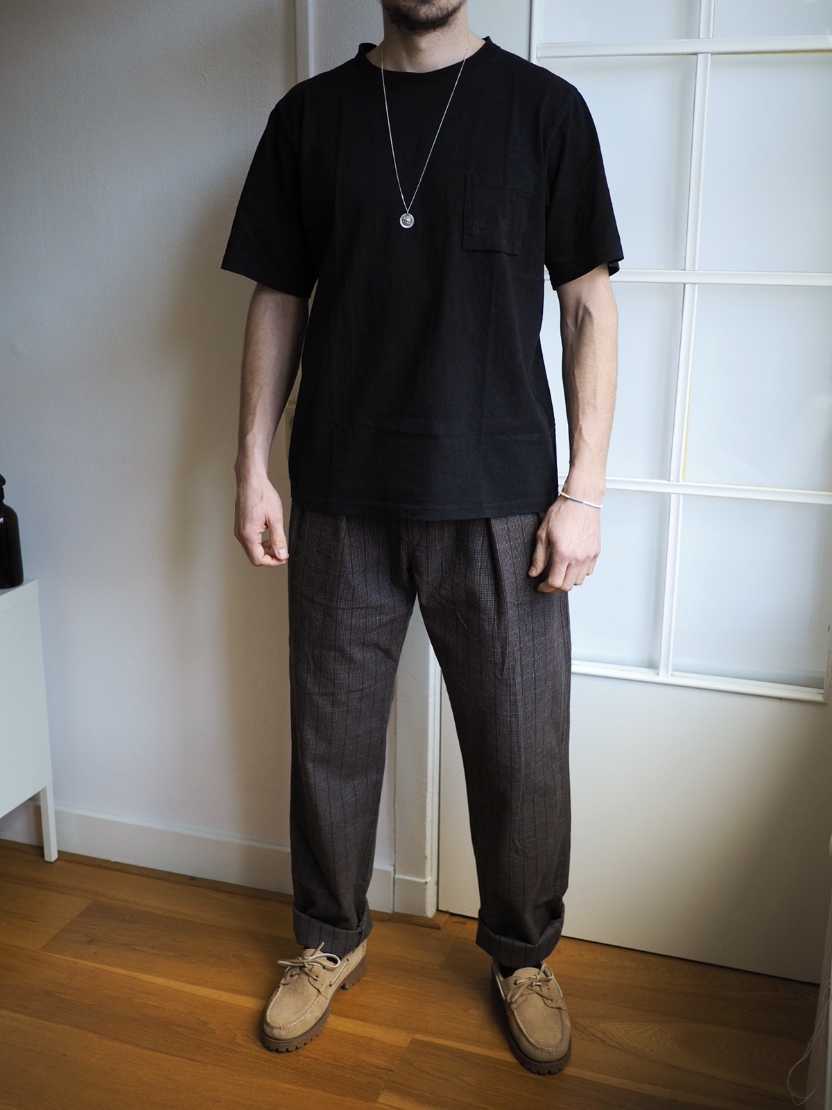 J’ai aussi acheté un pantalon à pinces taille M sur les conseils de @Qube et @cedoceltic (merci les gars). même analyse que pour la veste. Une merveille. Mais toujours un peu surpris par la coupe. J’ai pas mal de place à la taille et la longueur est digne d’un jeans américain. Sur la photo j’ai quand même passé 4 revers. Mais comme sur la veste je pense que ça va le faire en retouchant la taille pour porter sans ceinture. Je me questionne au sujet du bas, avec revers ou faire reprendre. Là aussi je suis très preneur de vos retours