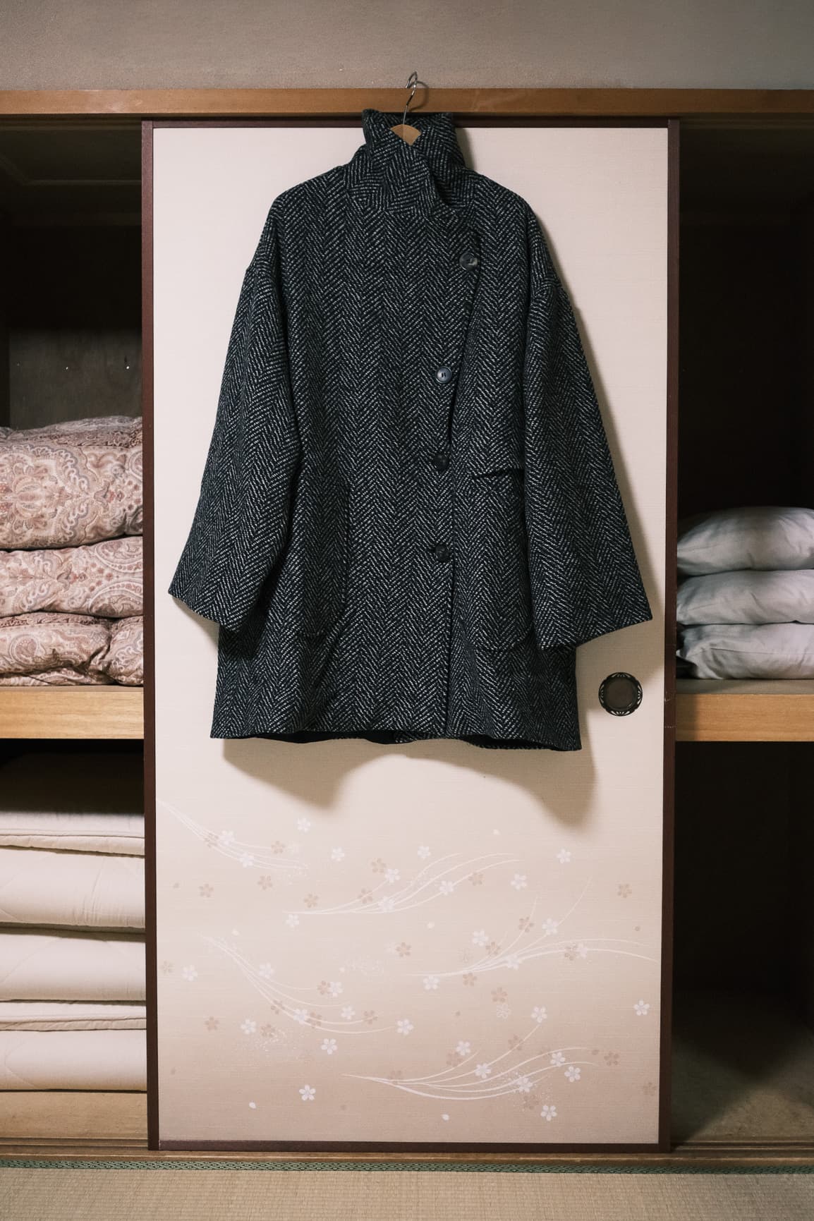 La nouveauté de la saison, c’est le manteau Haori ! Court et croisé, il se ferme par des boutons et s’ajuste à la taille grâce à des pattes au dos. À l’avant : deux poches plaquées et une poche à rabat ton sur ton pour un rendu épuré et minimaliste.