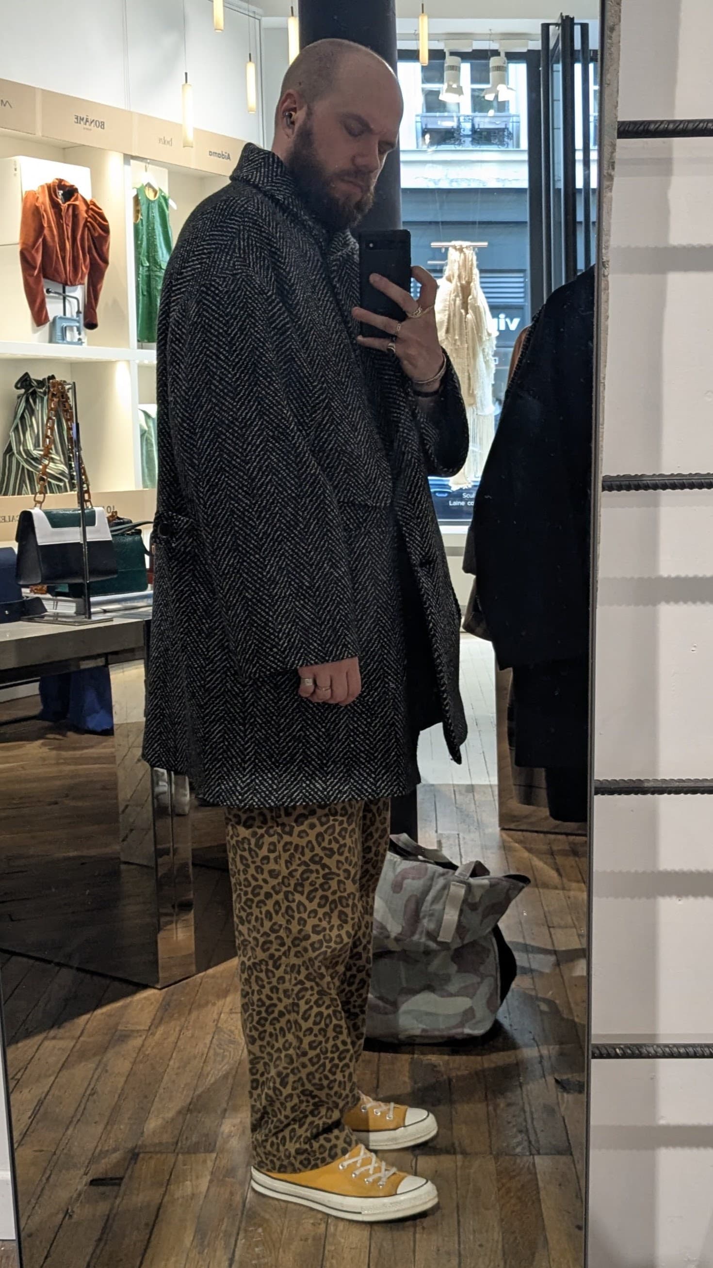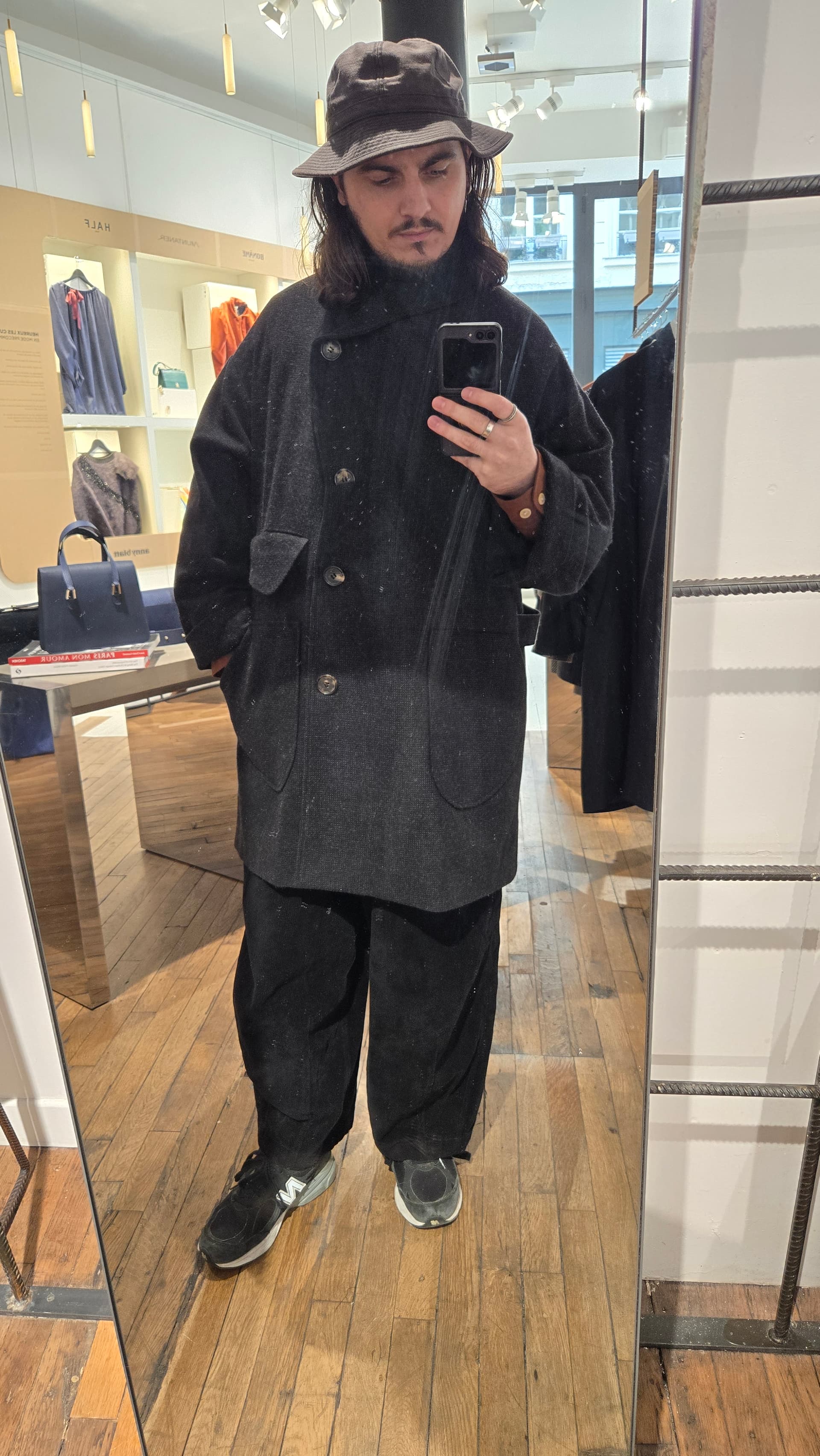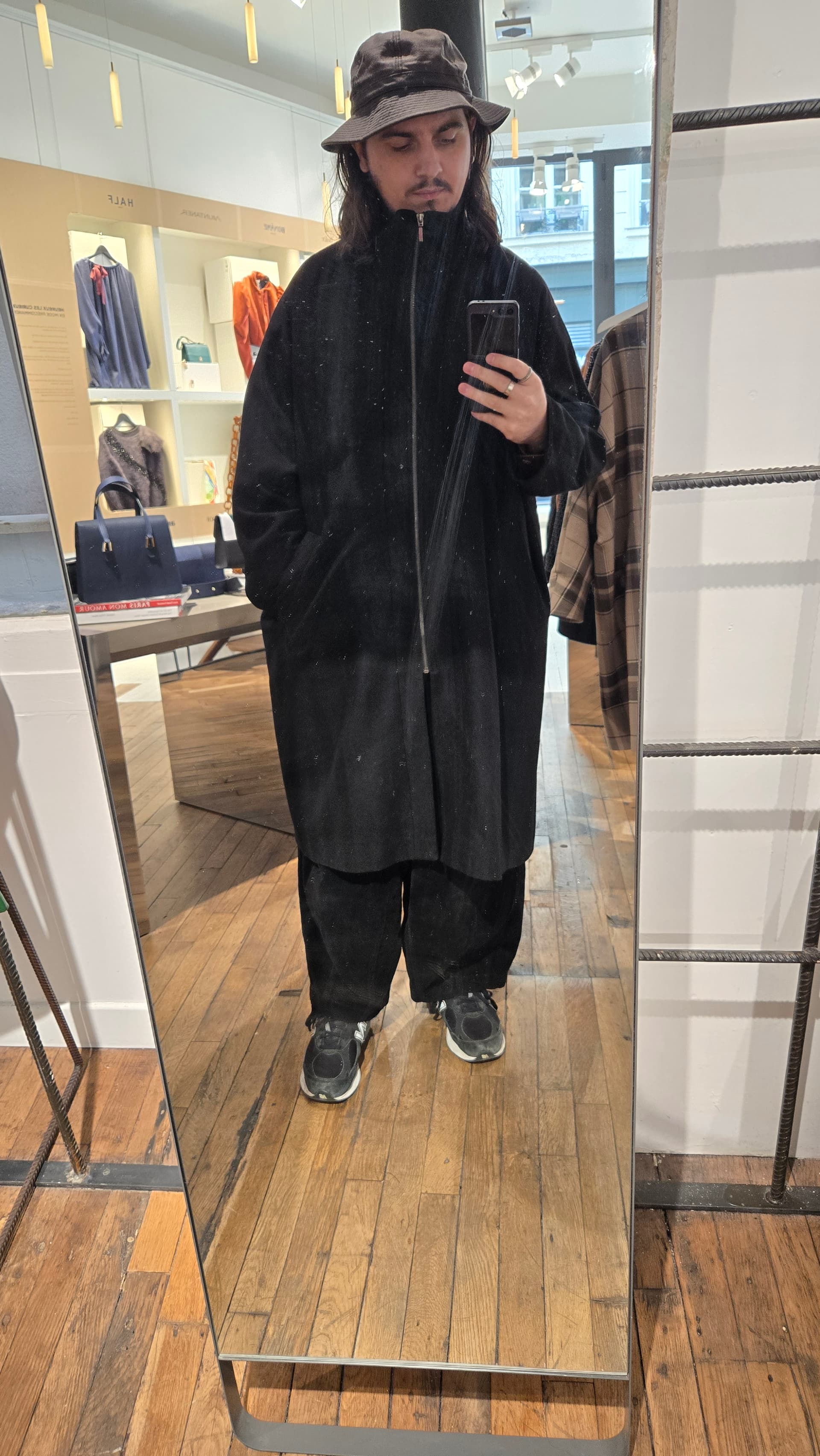 Je trouve la coupe approximative. Ok je vois toujours le délire oversize mais pour moi oversize ne signifie pas forcément avoir un rendu qui a juste l’impression d’être trop grand et pas super bien proportionné. Peut être aussi le fait qu’il ne soit pas fermé sur la photo avec le côté évasé du bas ça n’aide pas ?