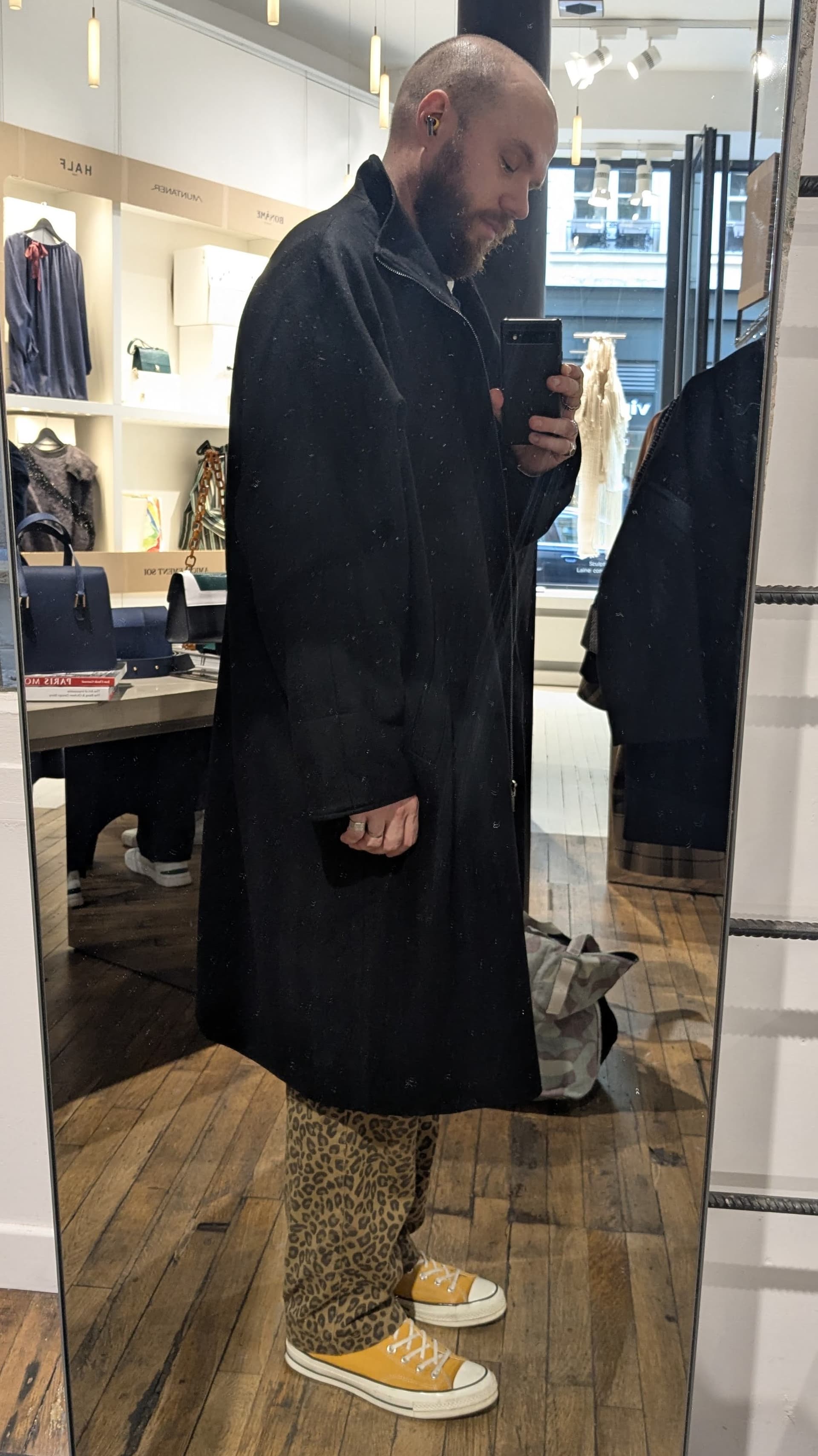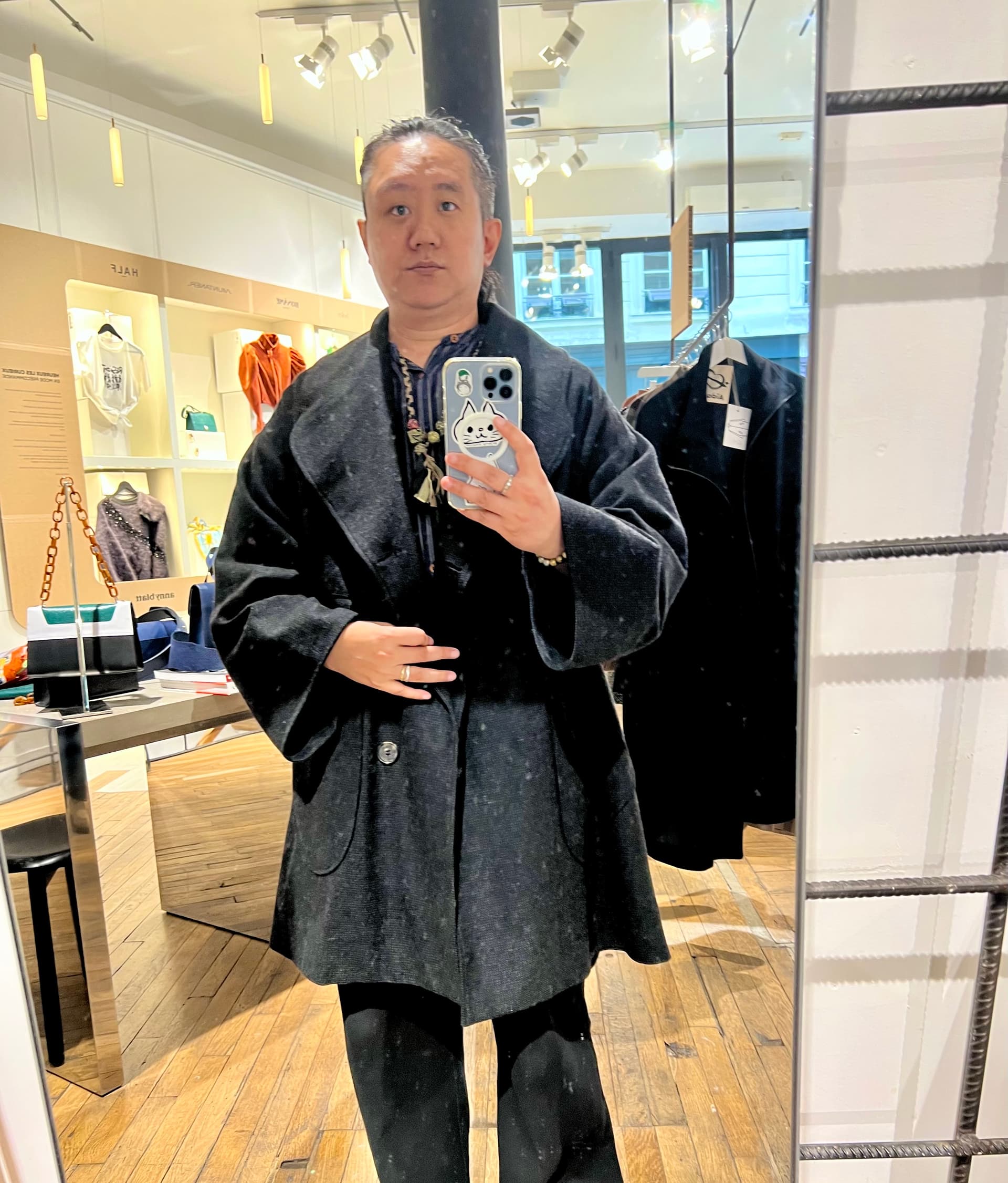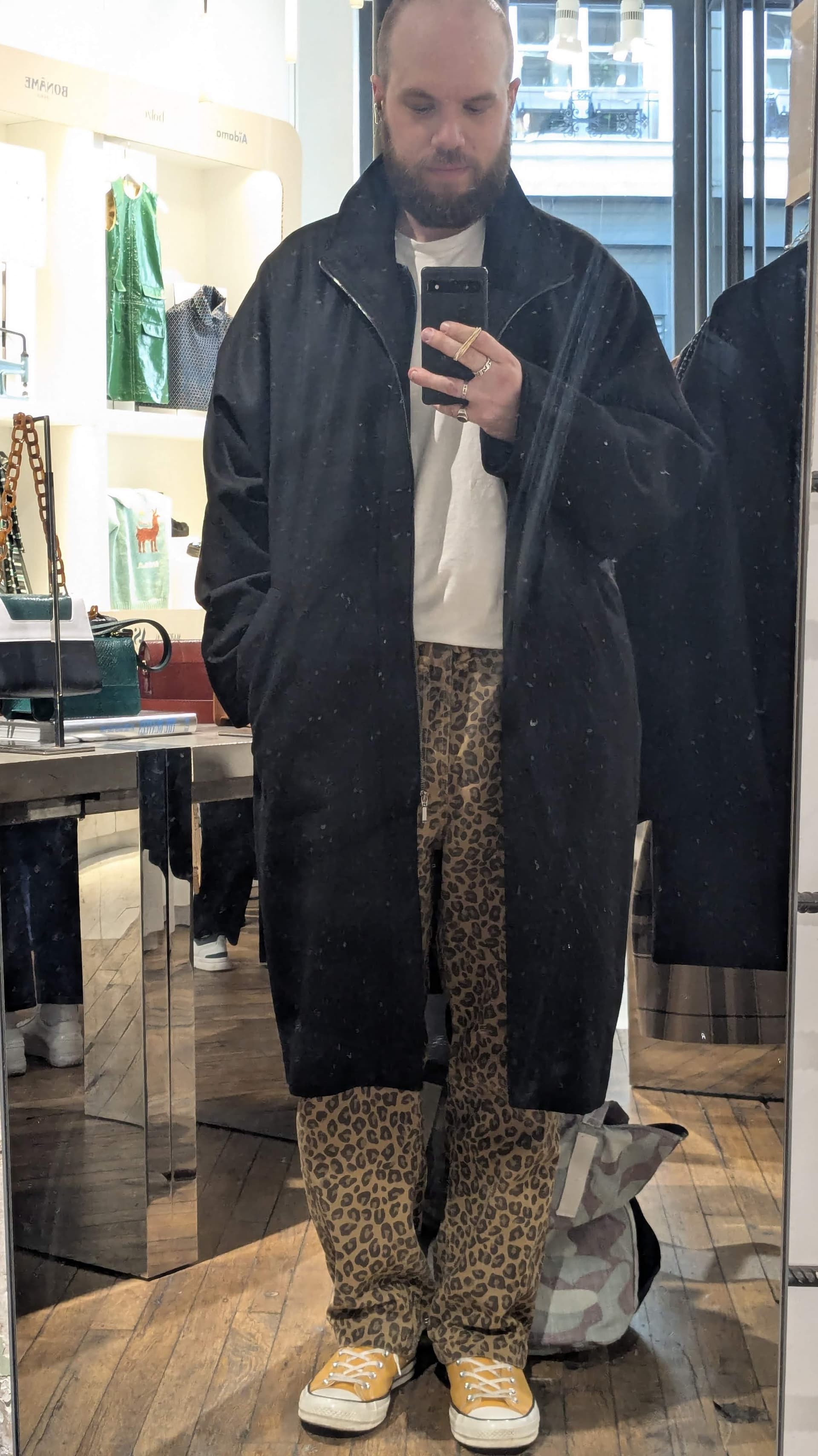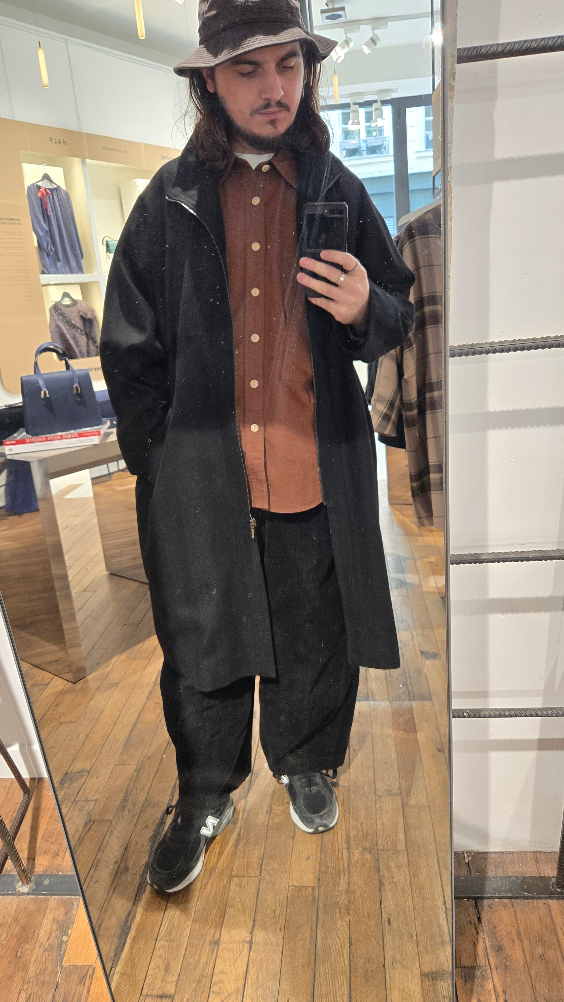 Je trouve la coupe approximative. Ok je vois toujours le délire oversize mais pour moi oversize ne signifie pas forcément avoir un rendu qui a juste l’impression d’être trop grand et pas super bien proportionné. Peut être aussi le fait qu’il ne soit pas fermé sur la photo avec le côté évasé du bas ça n’aide pas ?