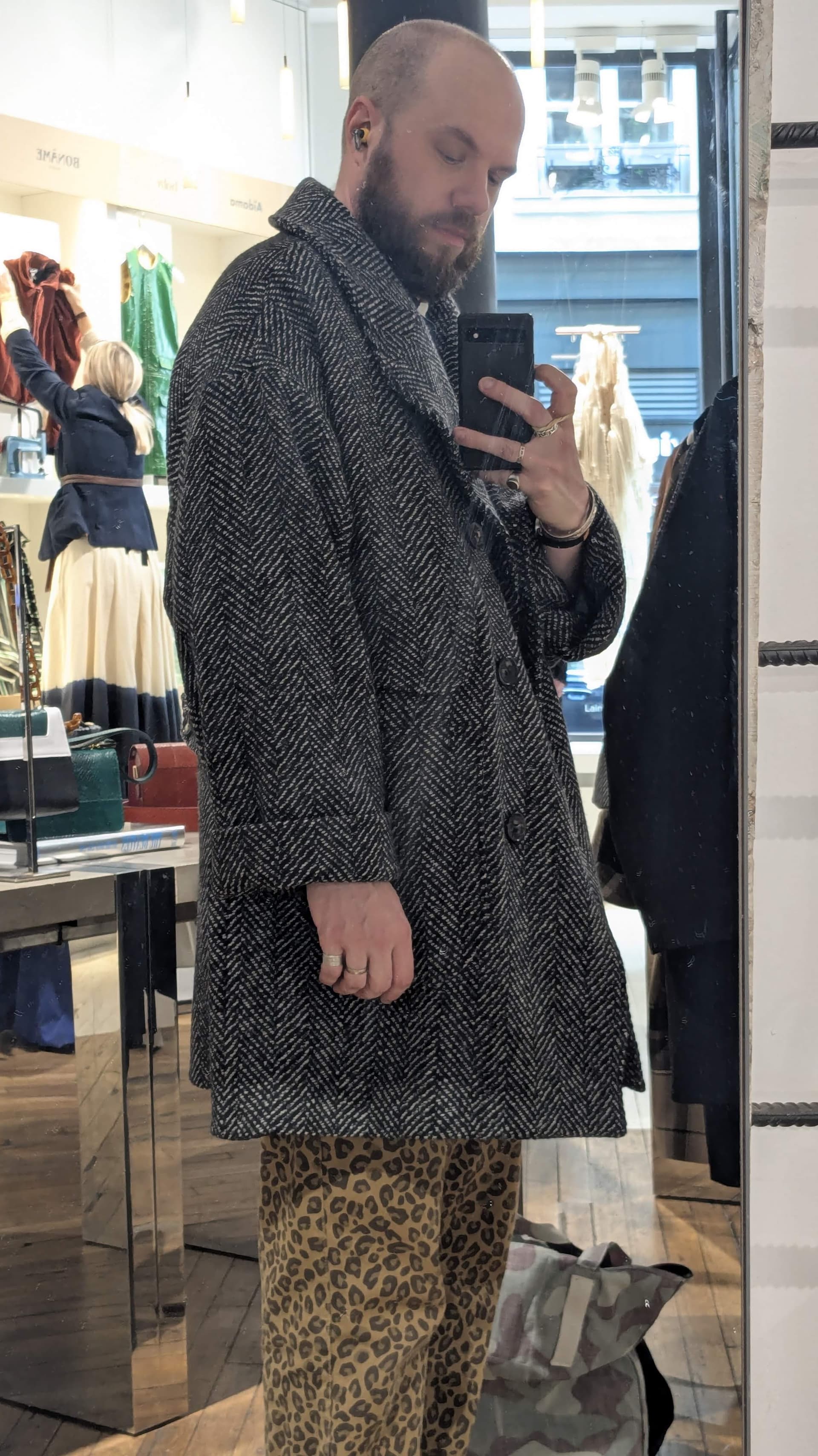 Hello, le premier manteau est un proto. La version finale est en double curseur avec zip canon de fusil pour plus de discrétion. Mais ça donne une idée du volume. Le Tanzen à carreau dispo à l’essayage est quand à lui la version définitive si jamais.