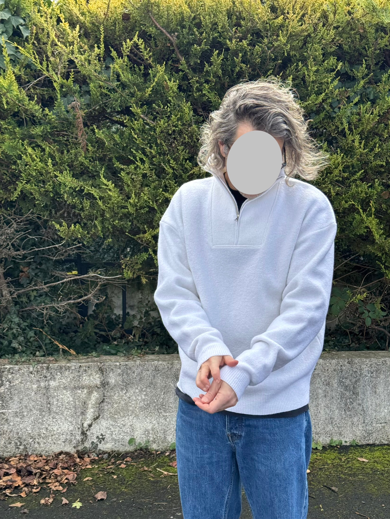 C’est pas dans mon habitude d’émettre des critiques négatives, mais je trouve que le rendu de ces manches n’est pas top sur toi. Je me permet aussi d’émettre des réserves vis a vis de la couleur : un pull blanc optique, je ne vois pas bien l’intérêt. Ça contraste énormément avec a peu près toutes les couleurs de bas (quoi que dans l’association que tu as faite ici, ça passe plutôt bien) et je doute que ça se porte régulièrement. Le but n’est pas de te plomber le moral hein ^^ … juste de te donner mon avis honnête.