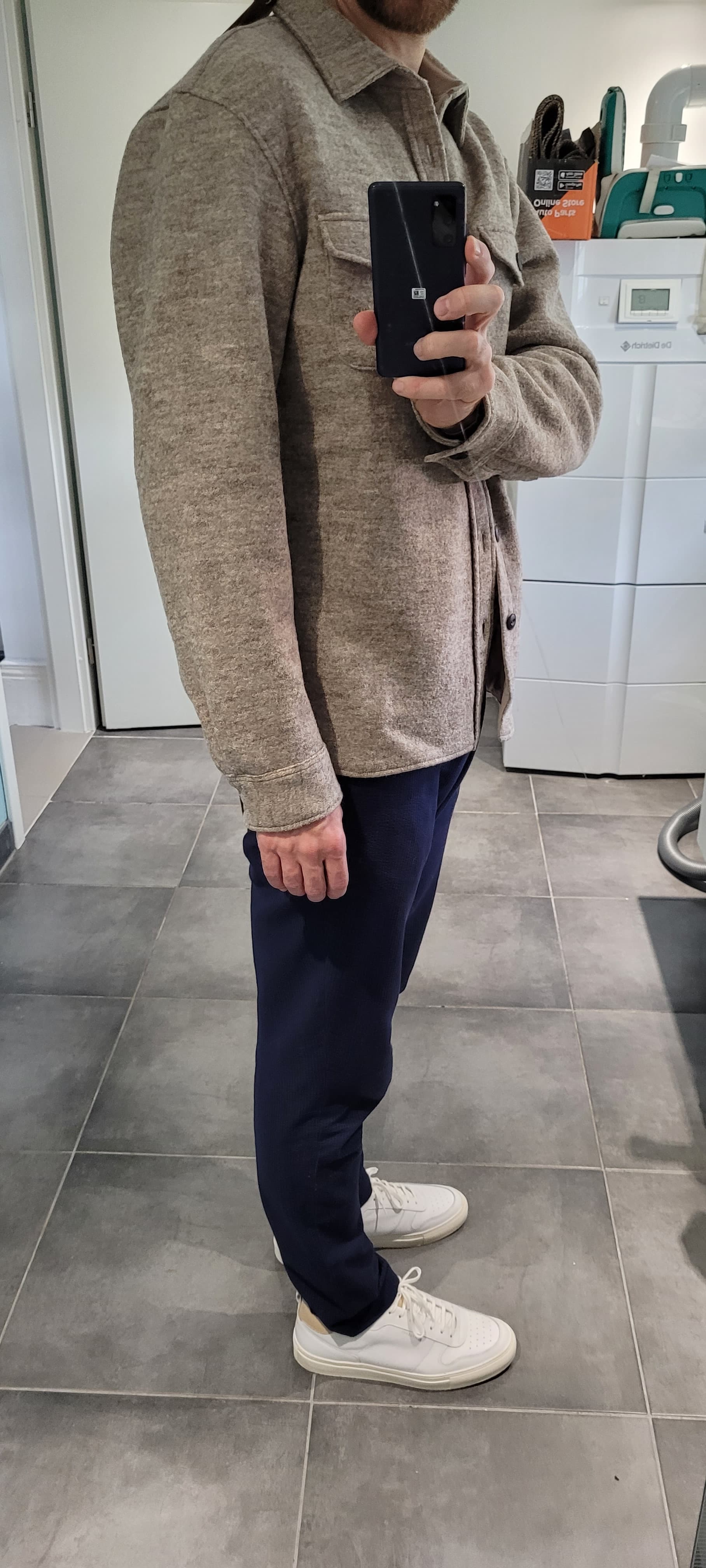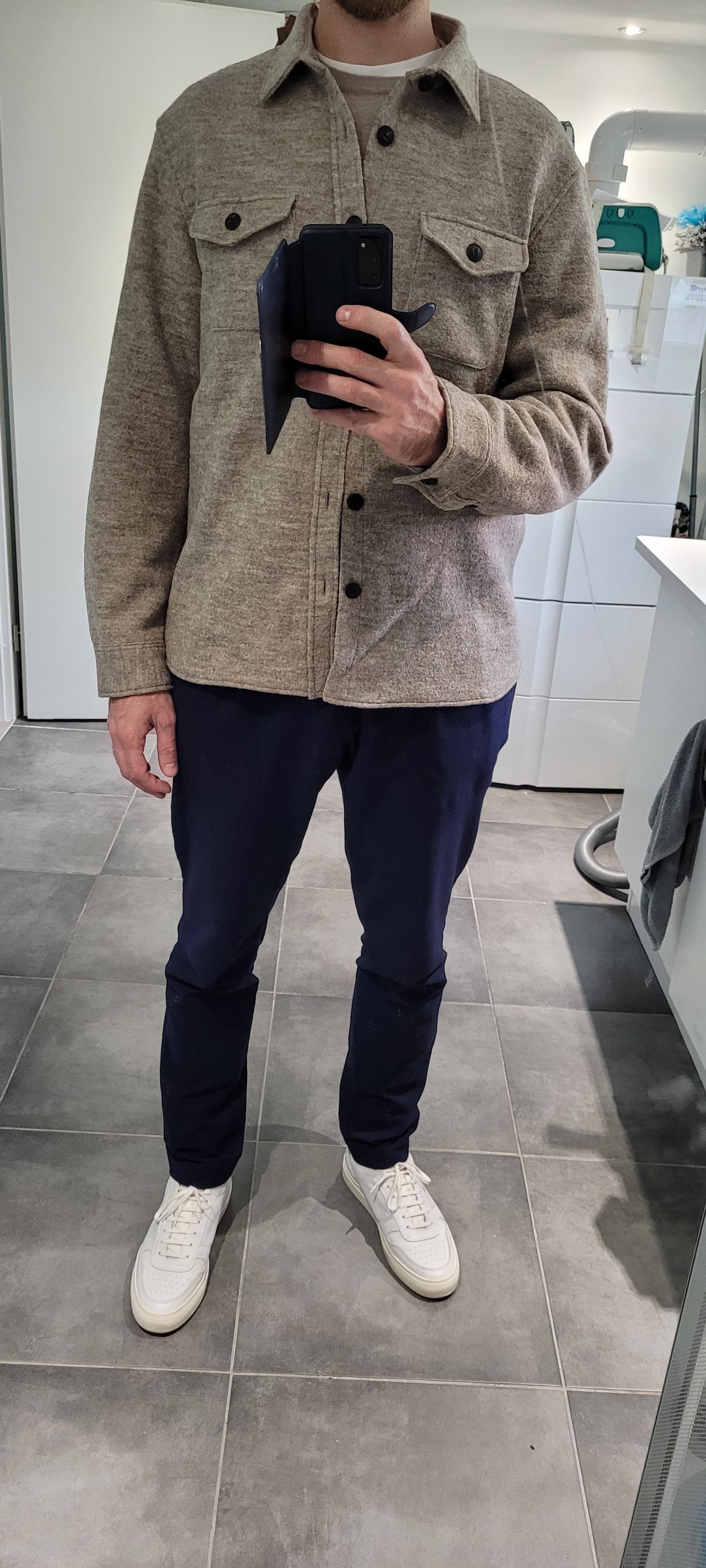 Perso je suis resté sur ma taille habituelle car j’aime bien le rendu ajusté avec le port d’une chemise ou d’un pull fin.