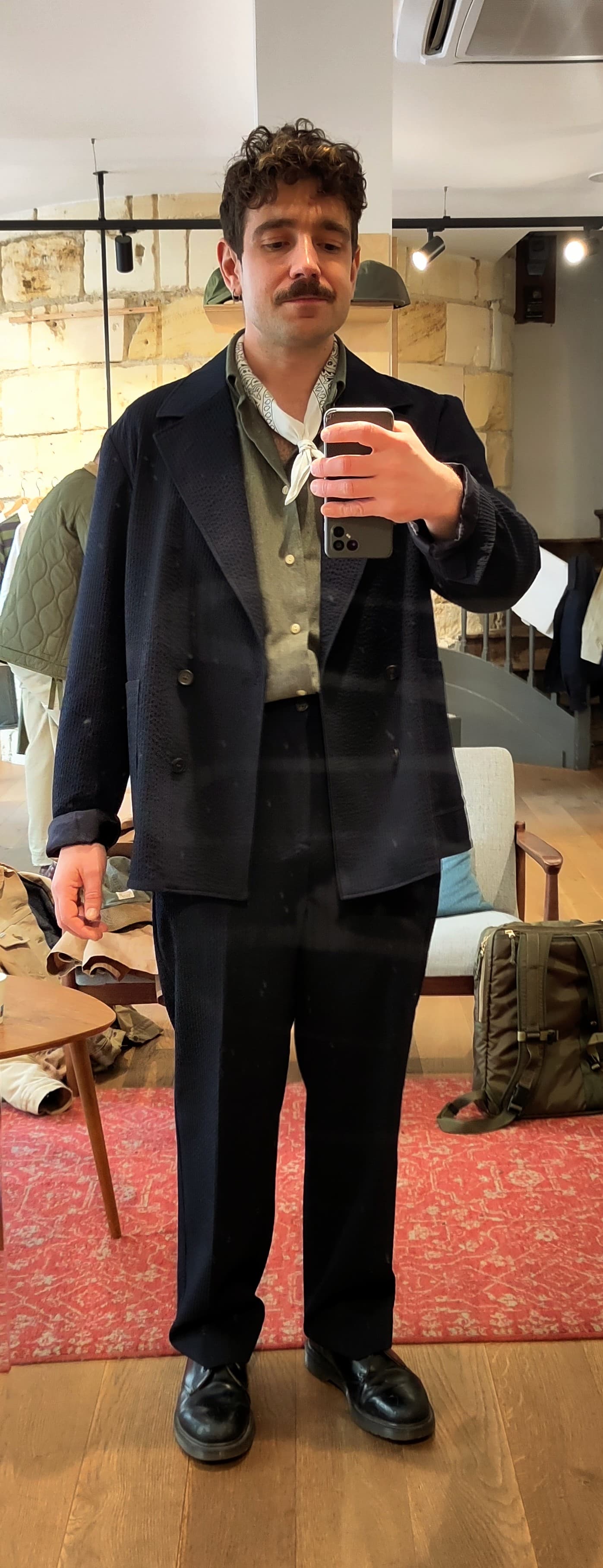 - La veste, c’est dur de ce faire une opinion parce que sur la photo ou tu as la main dans la poche, j’ai l’impression que c’est un peu grand mais sur les autres ça me semble bien meme si un peu loose. Perso, j’aime bien quand une épaules destructuré tombe un peu (comme certains costume Officine Générale ou les costumes Coltesse) mais c’est un gout perso. Sinon, size down