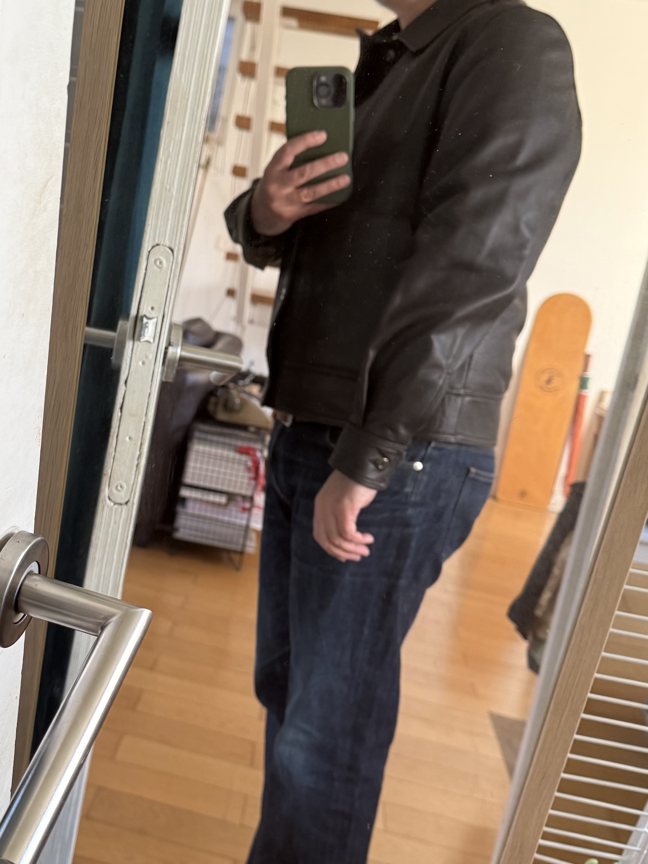 Je trouve que le fit est légèrement engoncé buste/épaules ici, mais c’est peut être à cause du pull en dessous. Et comme tu l’as dit c’est du cuir donc ca va bouger et s’adapter :). Elle tombe bien en longueur en tout cas.