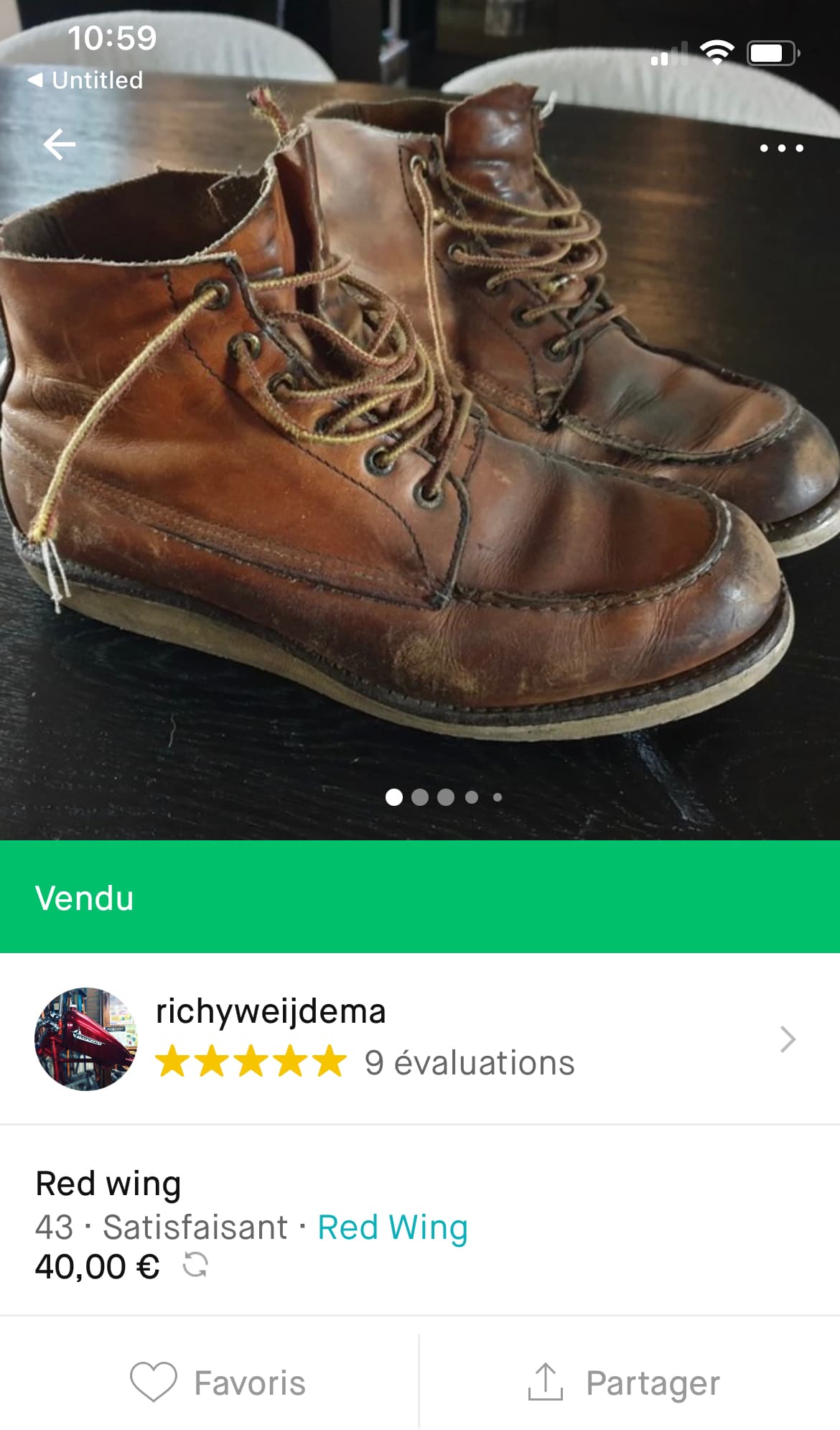 Je suis dĂ©goĂ»tĂ© !!! Jâavais mis un lien pour des red wing 877 un peu defoncĂ© et surtout oĂč le mec avait dĂ©coupĂ© la hauteur des boots mais vendu Ă 40âŹ