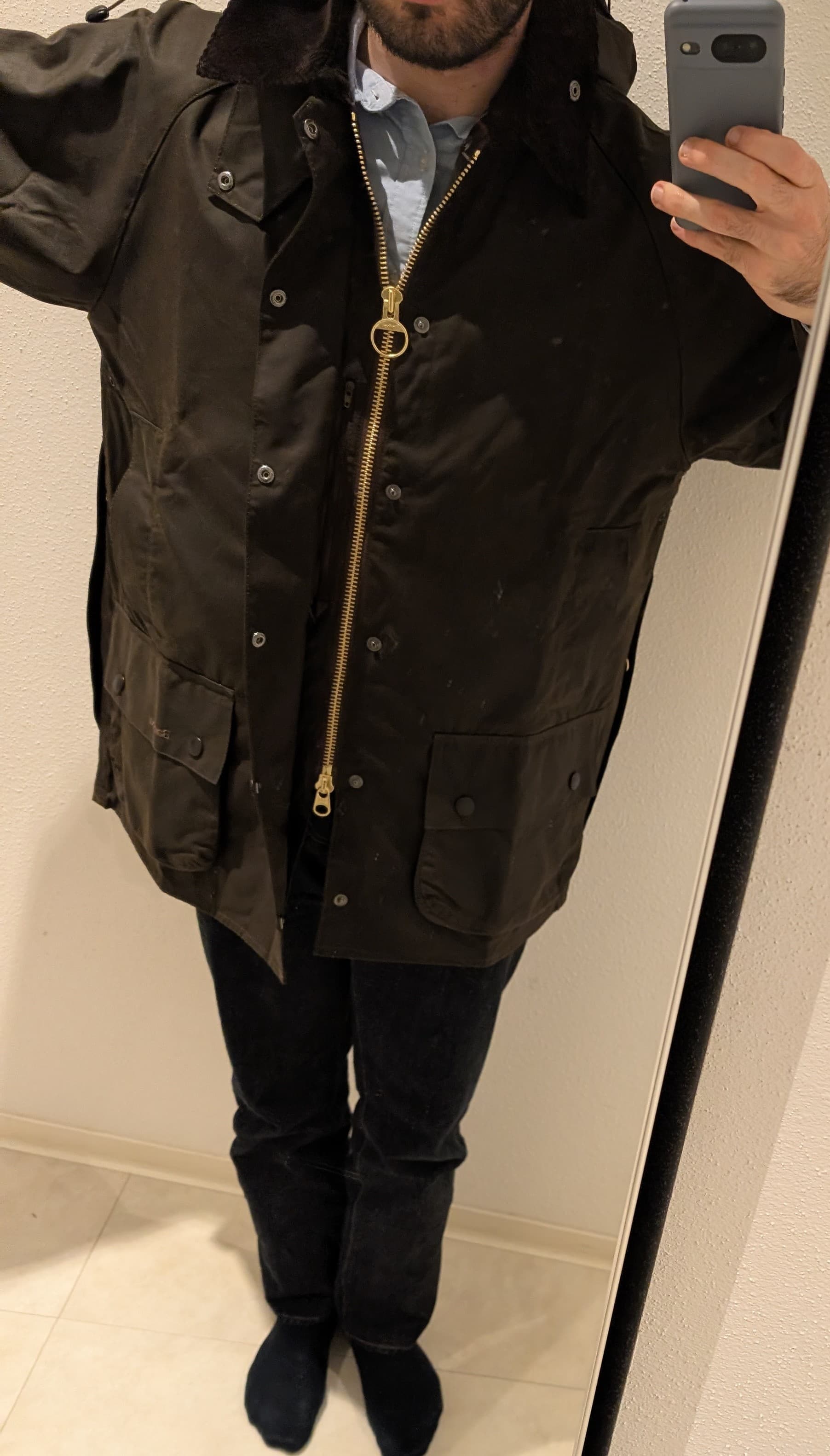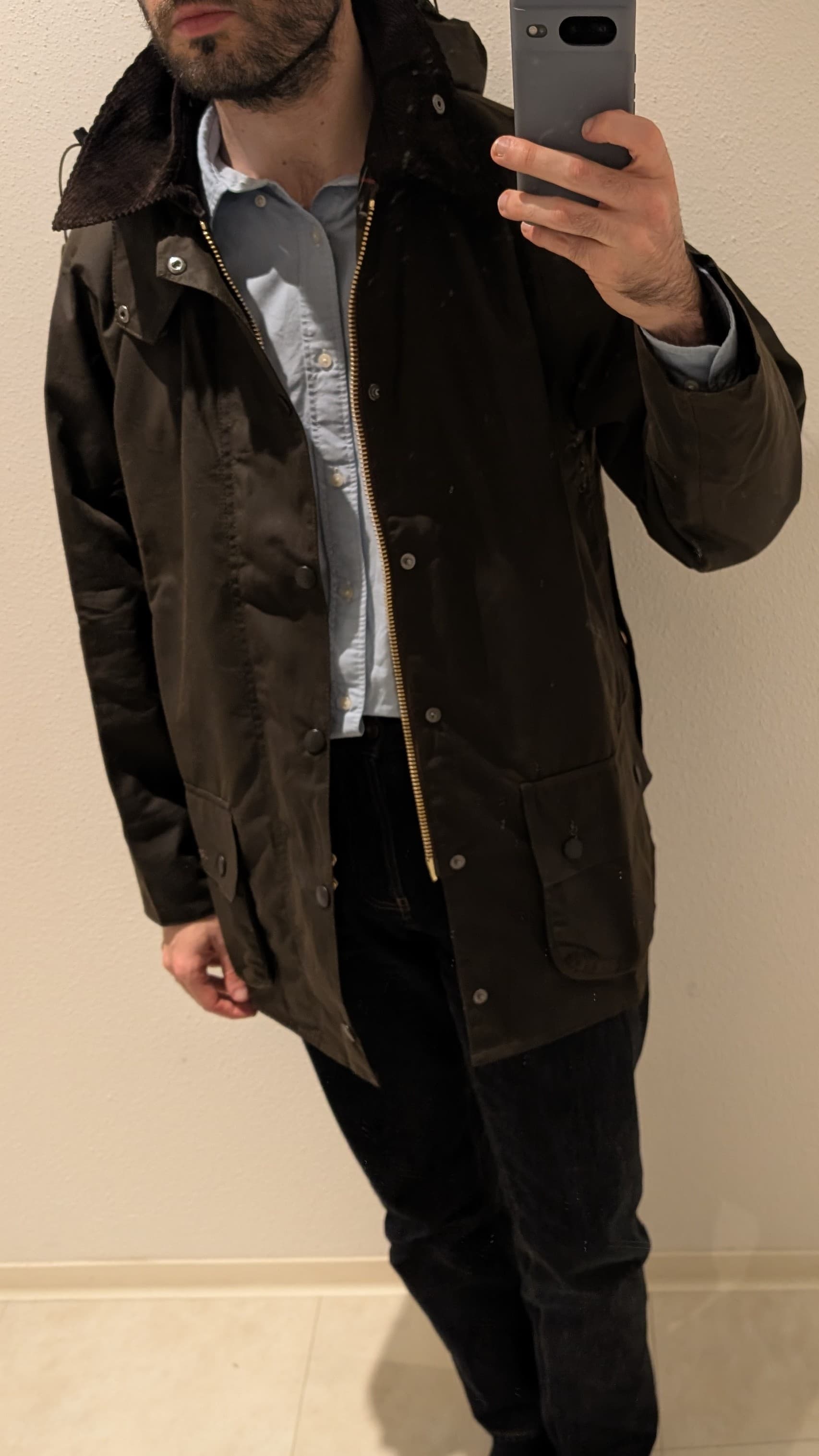 Avec une grosse maille/ cardi / ou mĂȘme le liner Barbour ça sera mieux .