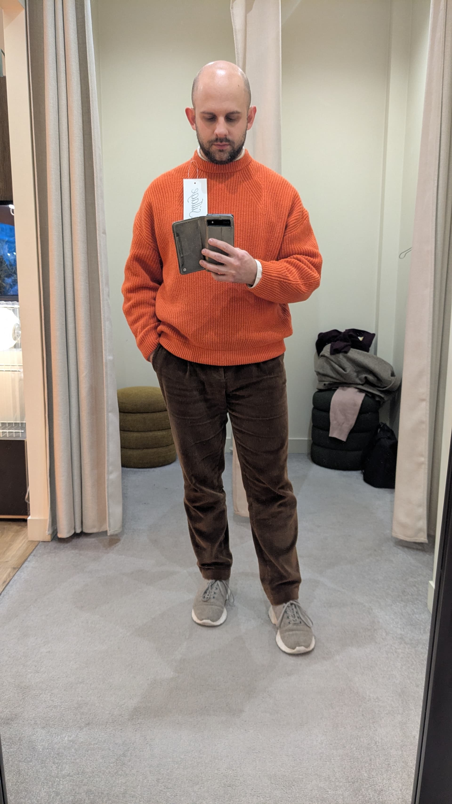Quelques pantalons, câest chouette, je trouve ça court mais ça me va (merci les jambes courtes pour le coup). Et un petit pull orange qui ne me tapait pas spĂ©cialement dans lâoeil au dĂ©but⊠et puis le coup de cĆur, je nâarrive plus Ă lâenlever⊠