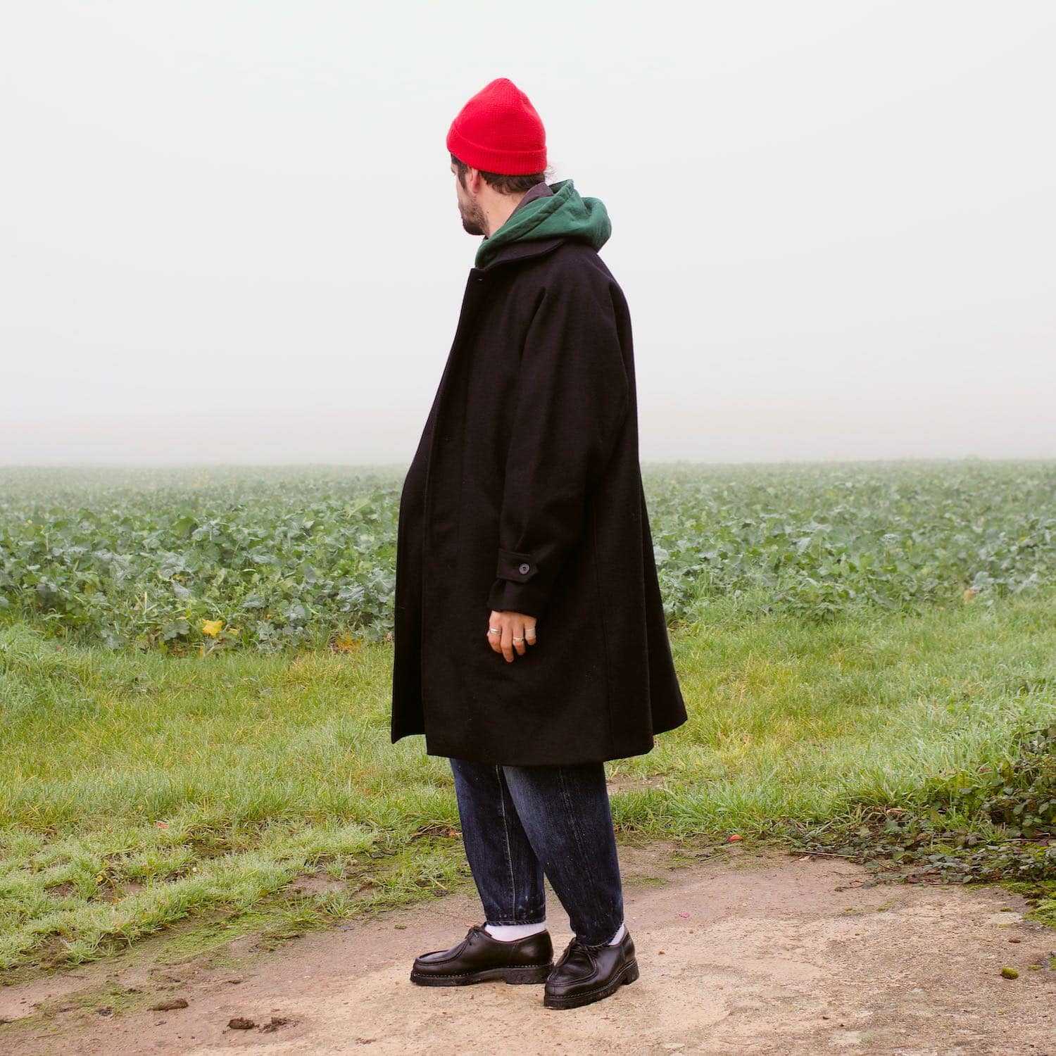 faut que le manteau soit généreux, qu’il enveloppe, que les manches dégueulent un peu, resrrée ave cla patte