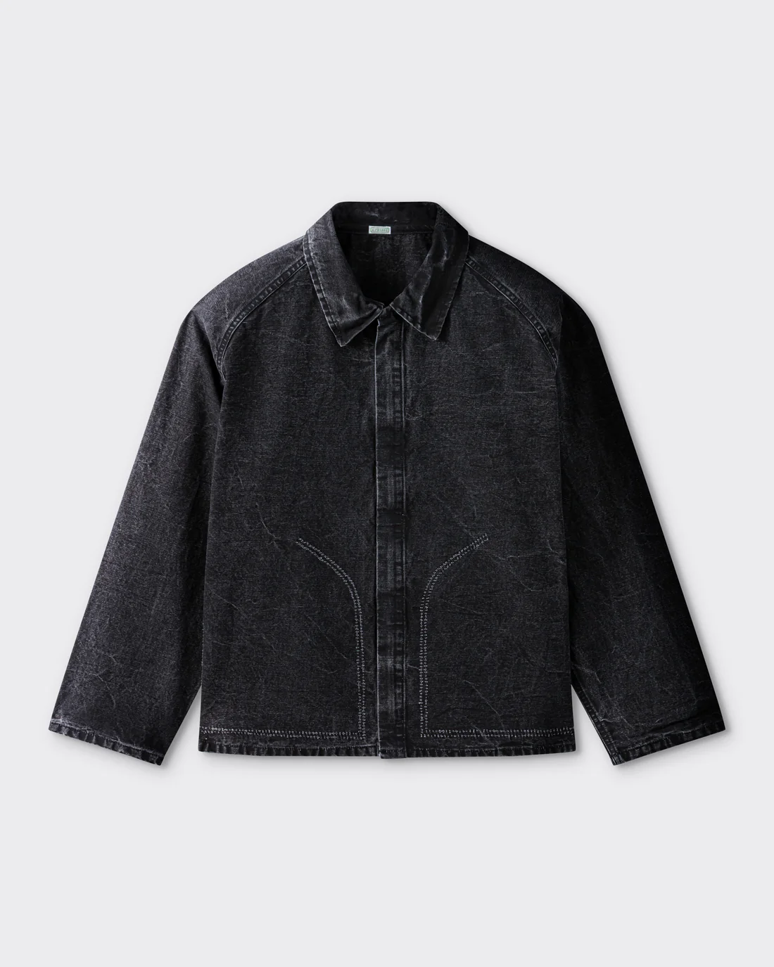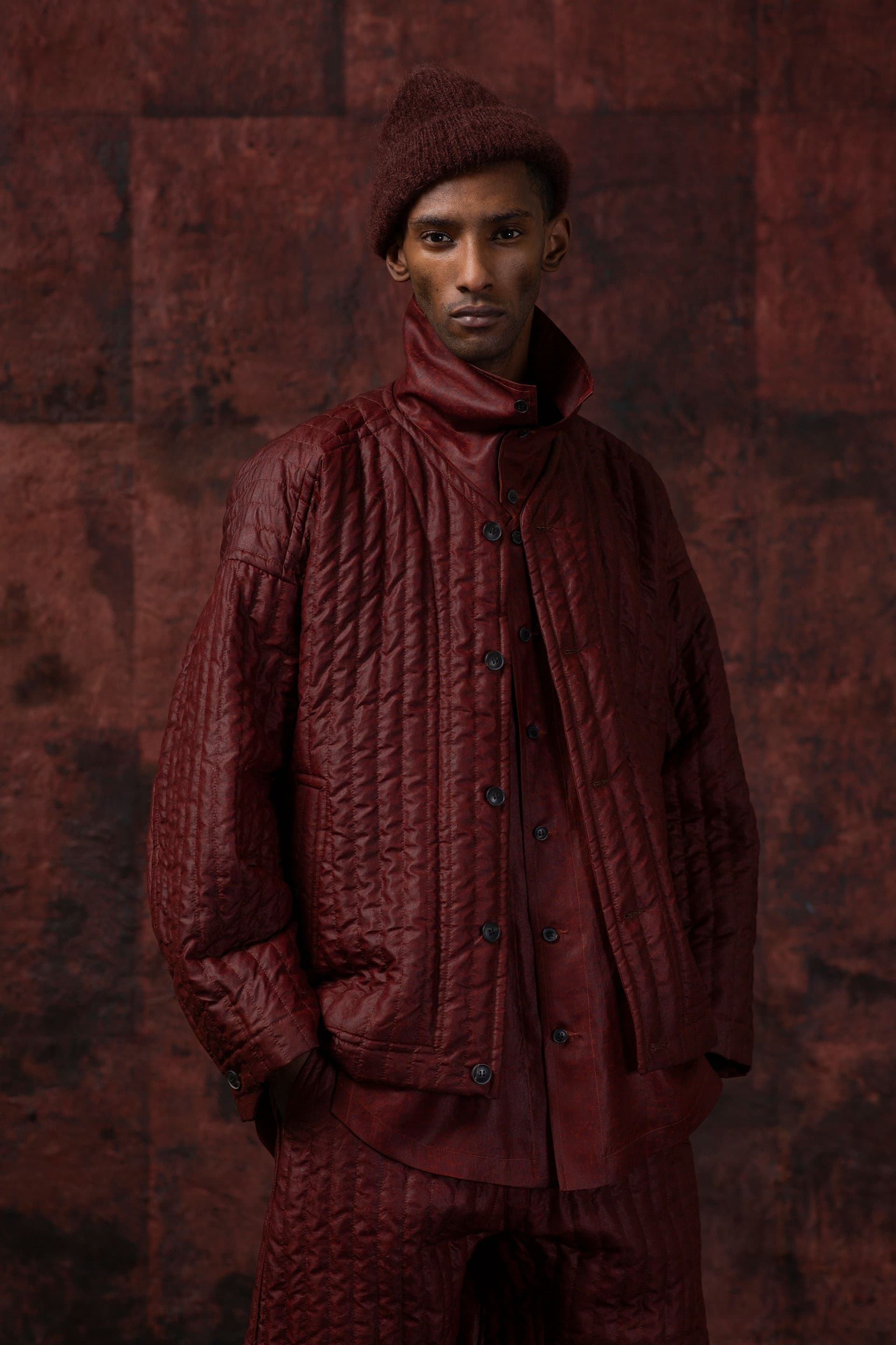 Chez Jan Jan Van Essche, au sein de la collec AW25, on retrouve un même tissu sur plusieurs vêtements : une soie teinte au jus d’igname (shuliang) dans une province au sud de la Chine. La teinture s’oxyde ensuite au soleil, ce qui donne cette apparence très particulière au tissu. En photo, c’est assez canon. Combiné au design unique de JJVE, cela donne un truc vraiment spécial et visuellement puissant.