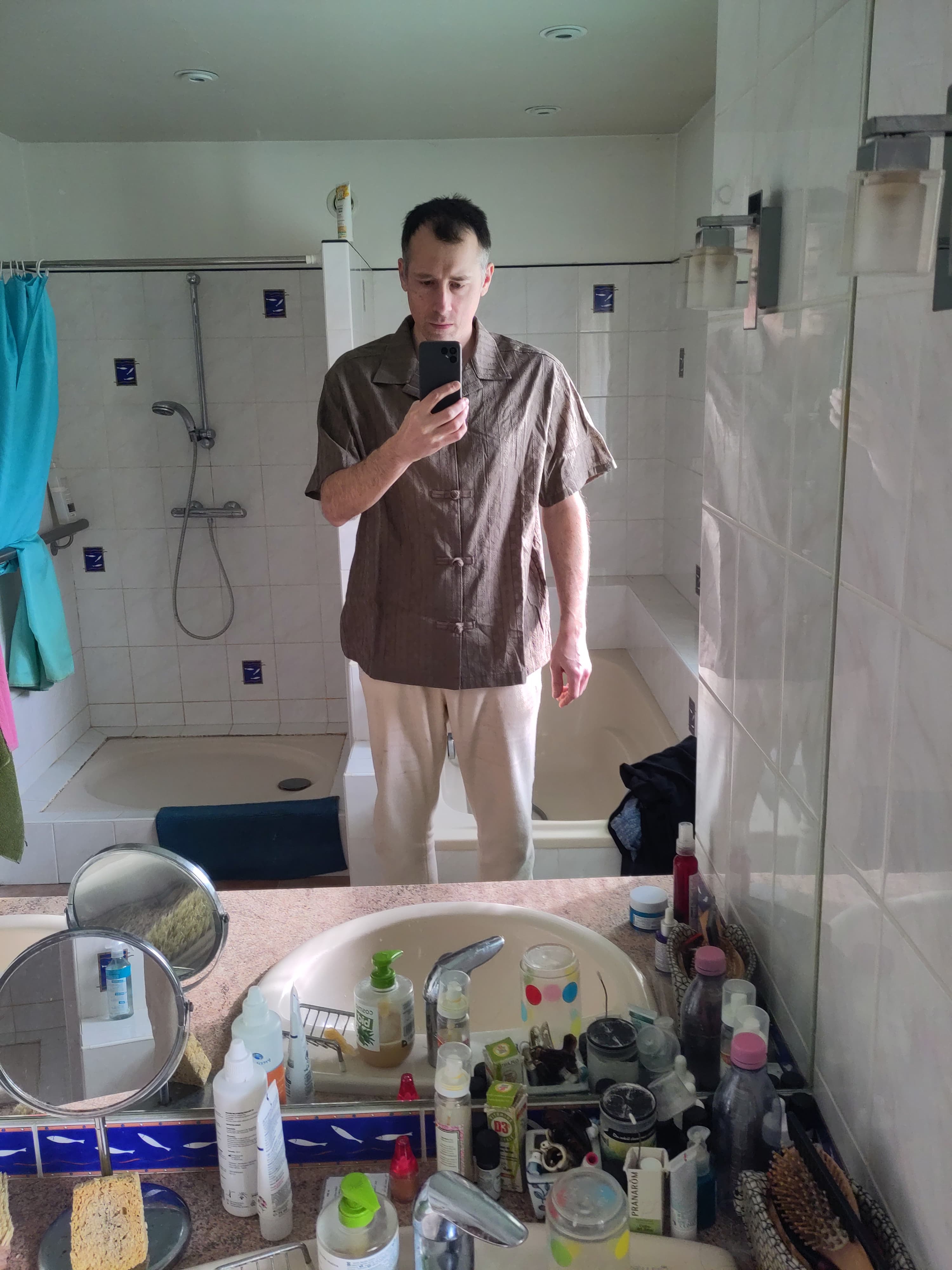 Pour montrer la finesse du tissu, et le petit soucis que j’ai avec les boutons kungfu (il faut réajuster pour que les deux pans de tissu ne se chevauchent pas comme sur la photo)