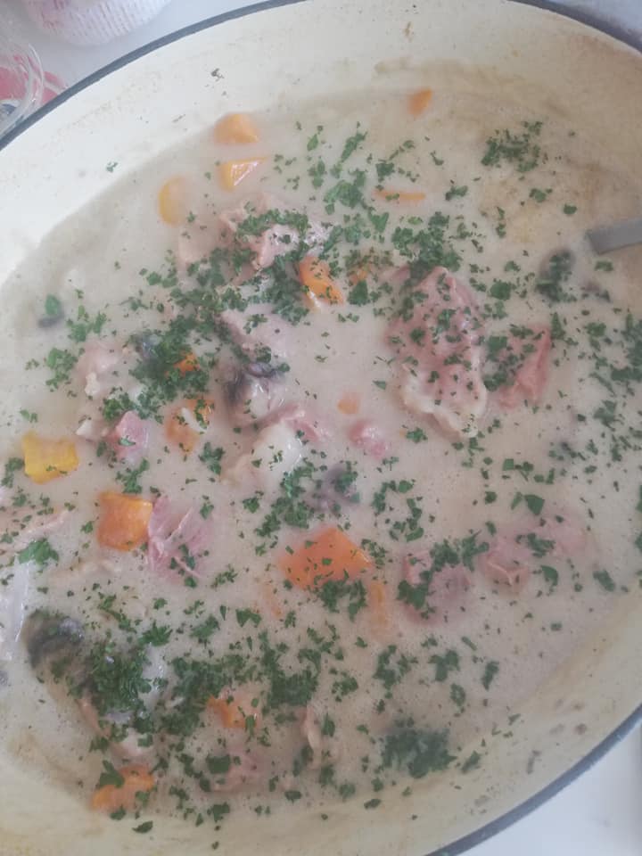 ça câest ma spĂ©cialitĂ© câest la blanquette de veau, avec du riz blanc, beurre, sels, persils.