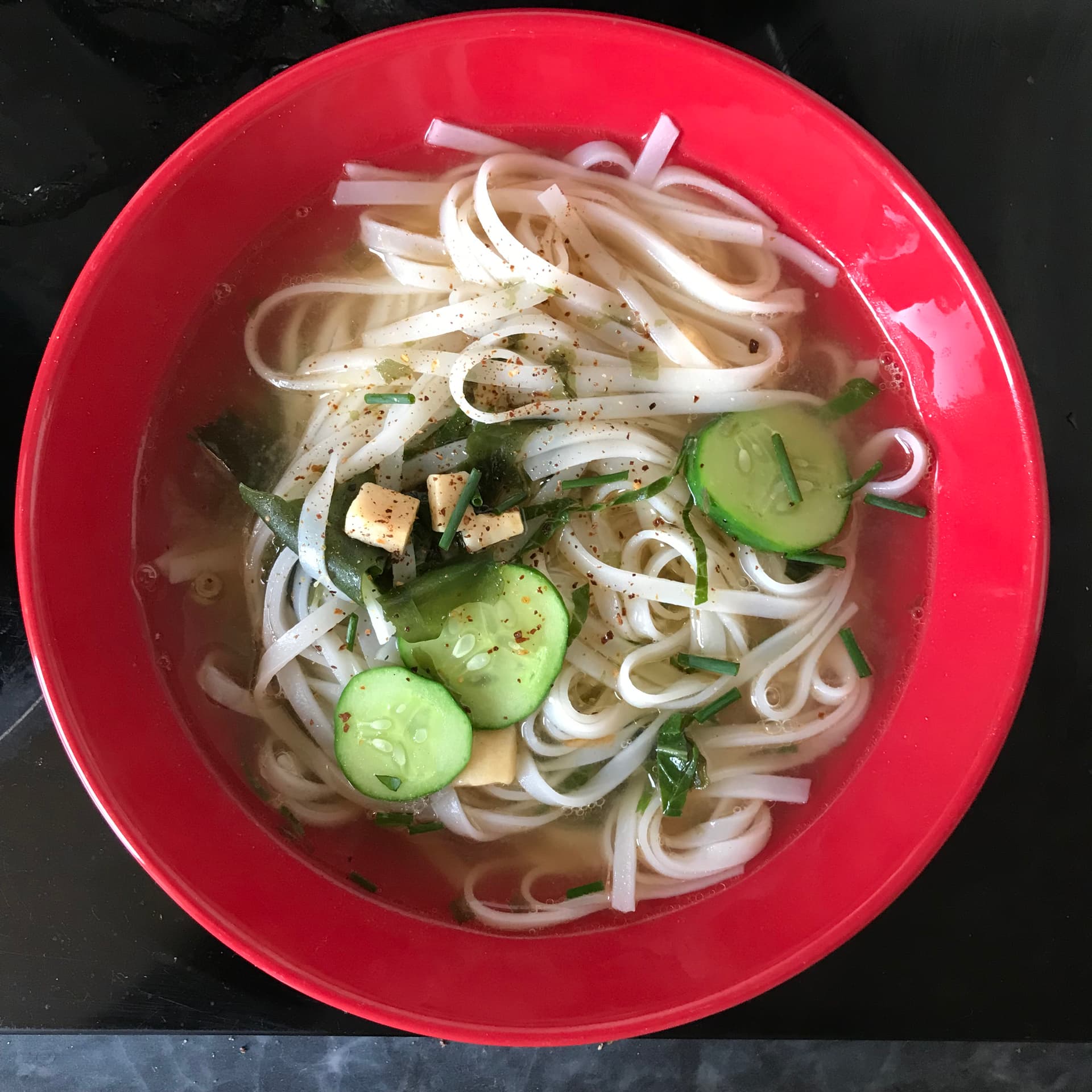 Du coup j’arrive comme un cheveu sur la soupe (notez le jeu de mots) avec ma première soupe d’inspi japonaise (miso/dashi/huile de sesame/piment d’espelette) agrémentée de nouilles de riz, concombre, vert de bettes et ciboulette du jardin