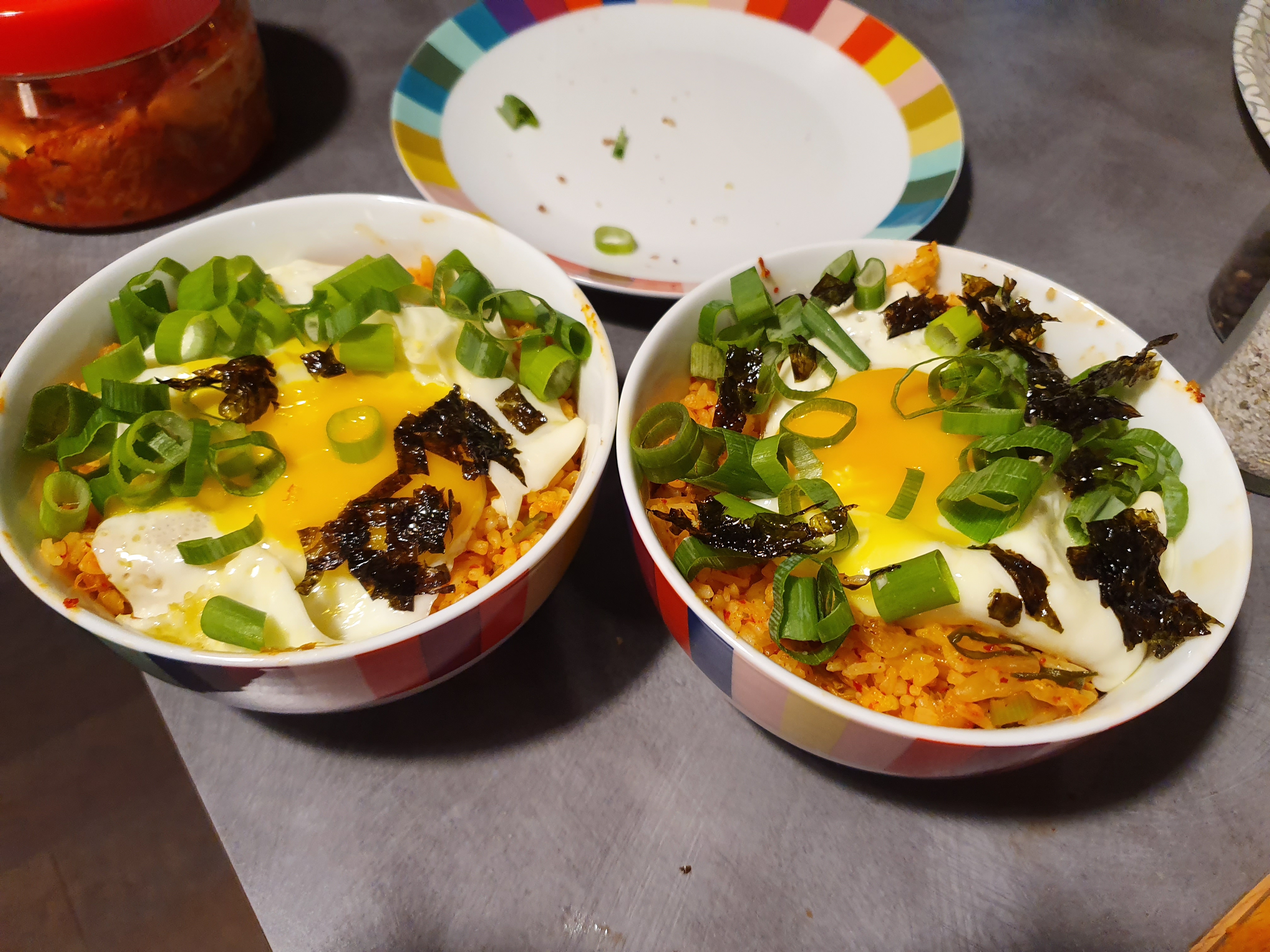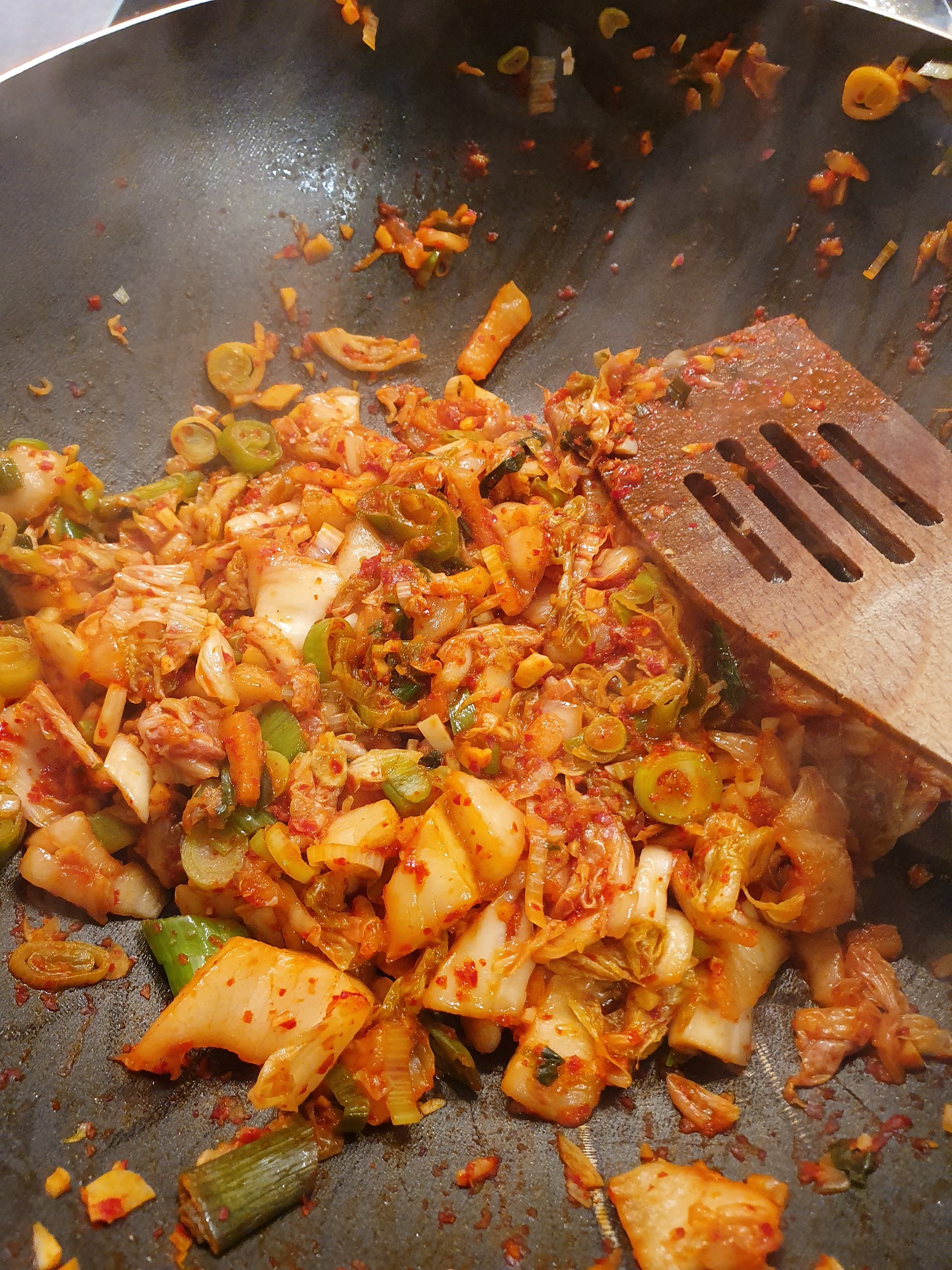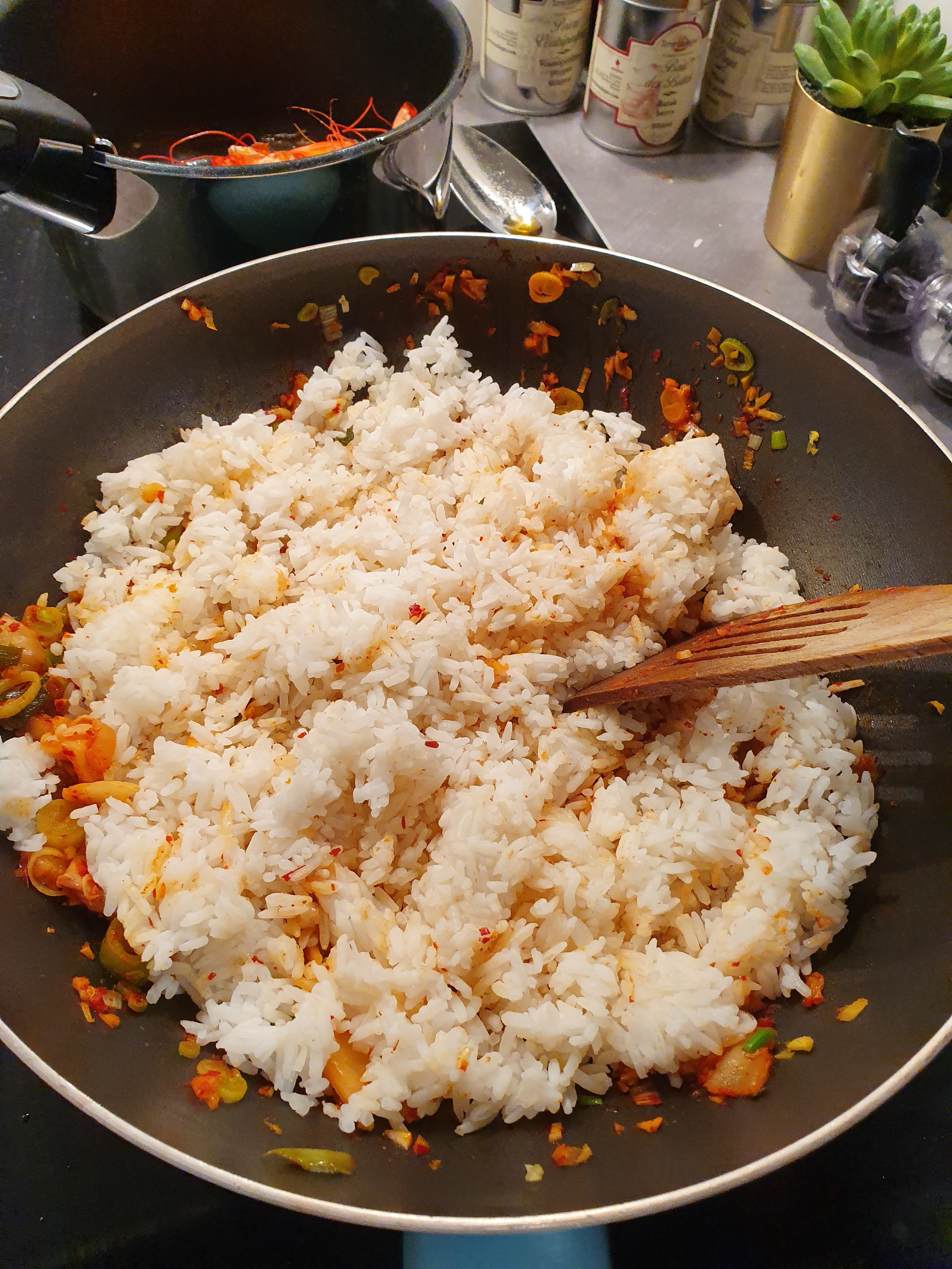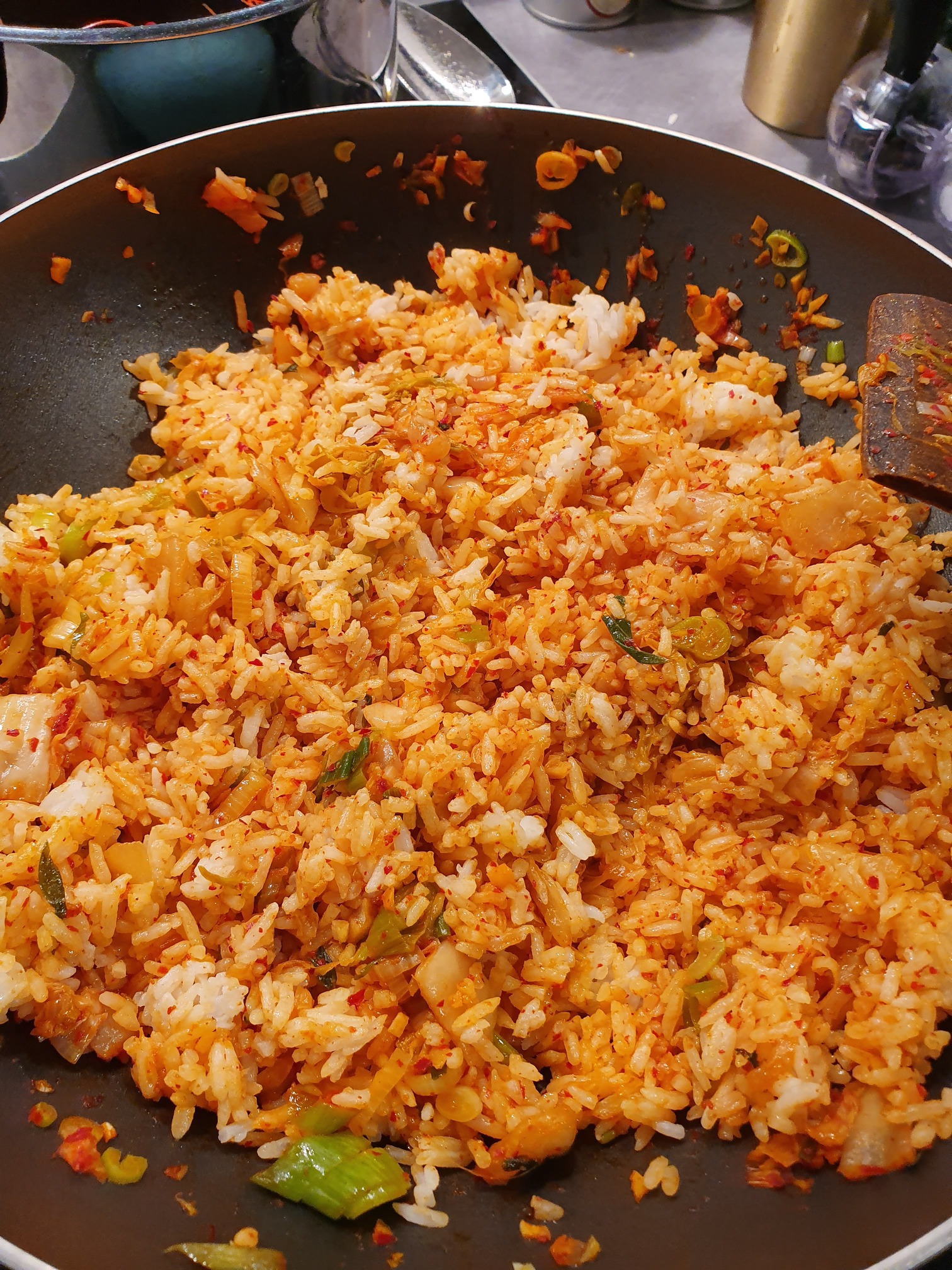 Ensuite on « casse » le riz et on mĂ©lange tout jusquâĂ ce que les grains soient bien sĂ©parĂ©s, on rajoute le jus du kimchi, quelques gouttes dâhuile de sĂ©same (y aller progressivement et goĂ»ter ça peut ĂȘtre plus ou moins fort), sel (goĂ»ter le kimchi avant ça peut ĂȘtre suffisament salĂ©) poivre, on mĂ©lange tout ça et on sert dans un bol