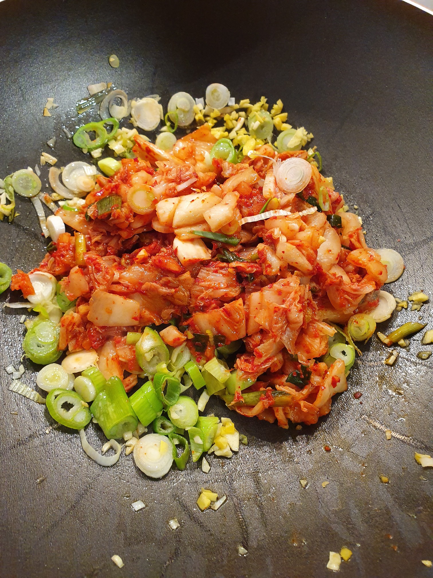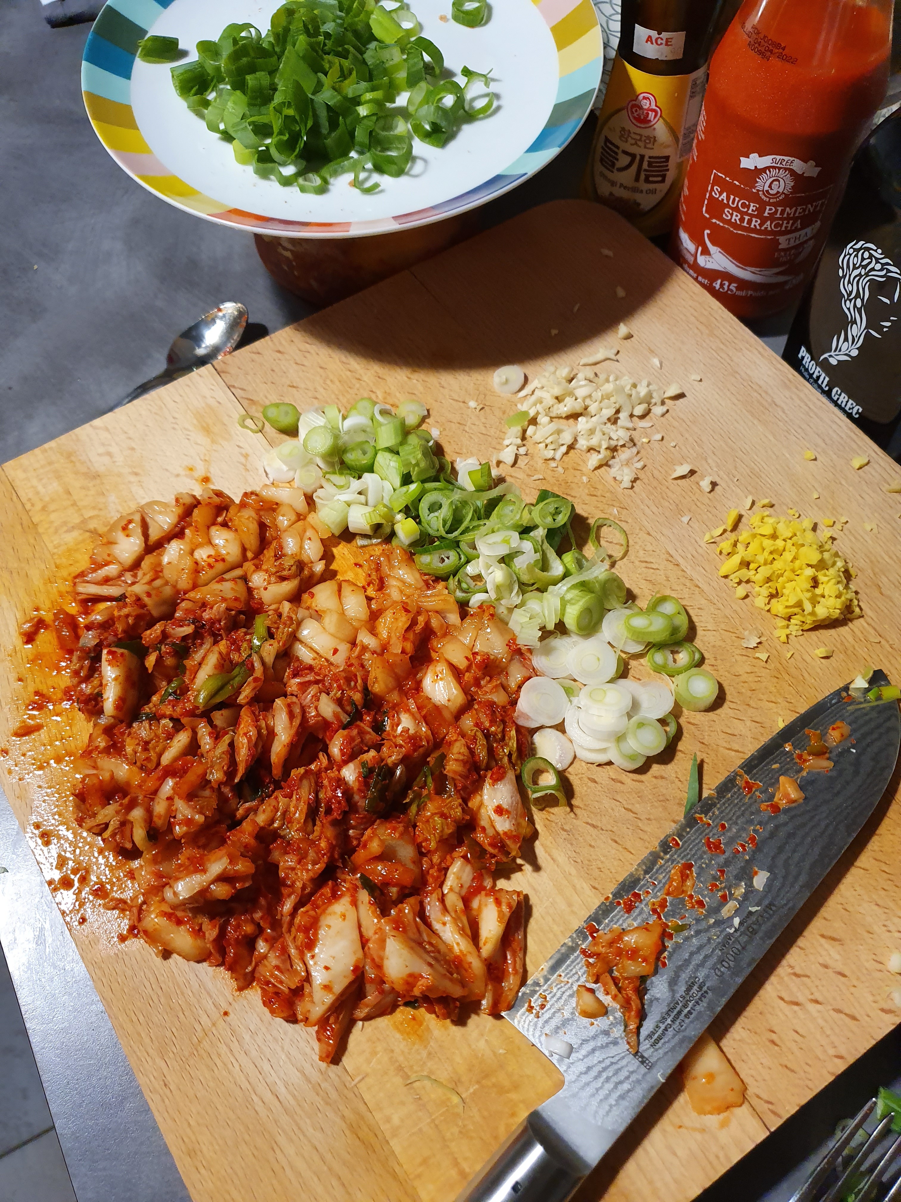 On coupe les pousses dâoignons en tranche (on peut garder une partie de la partie verte de cĂŽtĂ©), jâavais de lâail et des restes de gingembre hachĂ© finement, et on hache grossiĂšrement du kimchi (chou corĂ©en fermentĂ© Ă©picĂ©, plus ou moins piquant)