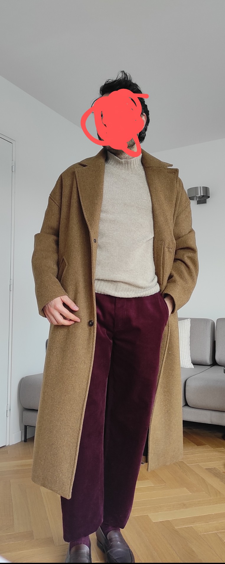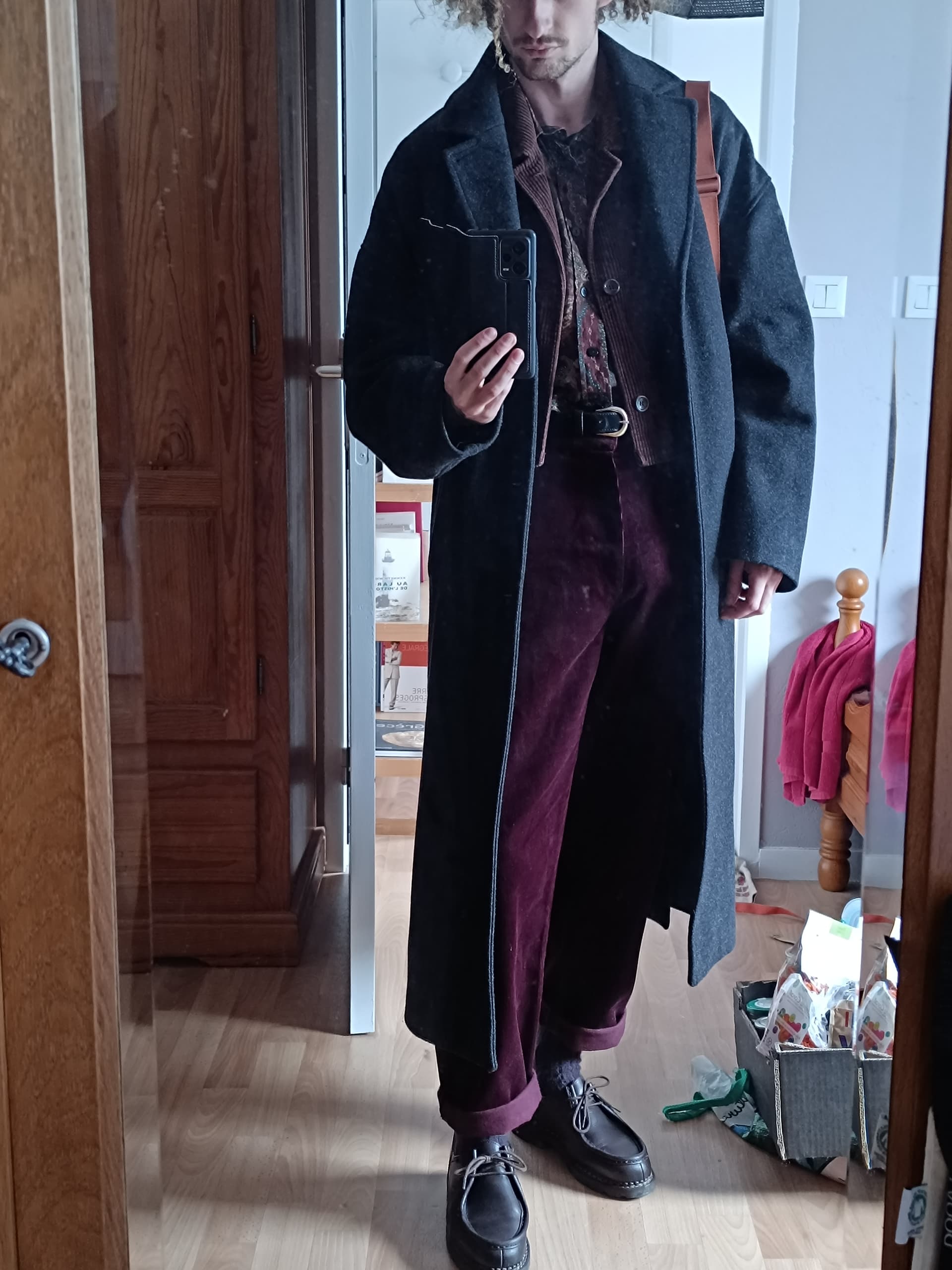 D’autres nuances de violet. Du maron. Des pièces encore plus fortes. Du velours en haut également. Un manteau qui encadre le tout avec une couleur plus sombre et sobre.