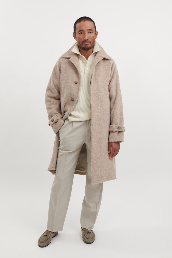 Il y a de la laine de chameau chez Suit Supply (https://suitsupply.com/fr-fr/men/coats/manteau-marron-moyen/J926.html), mais même en customisant tu n’auras pas la combinaison croisé / raglan du manteau DBF. J’ai acheté chez Atelier Loden une combinaison croisé / raglan que tu peux voir ici : https://forum.borasification.com/t/outfit-of-the-day-part-3/5357/10060 C’est une belle laine mais ce n’est pas du chameau.