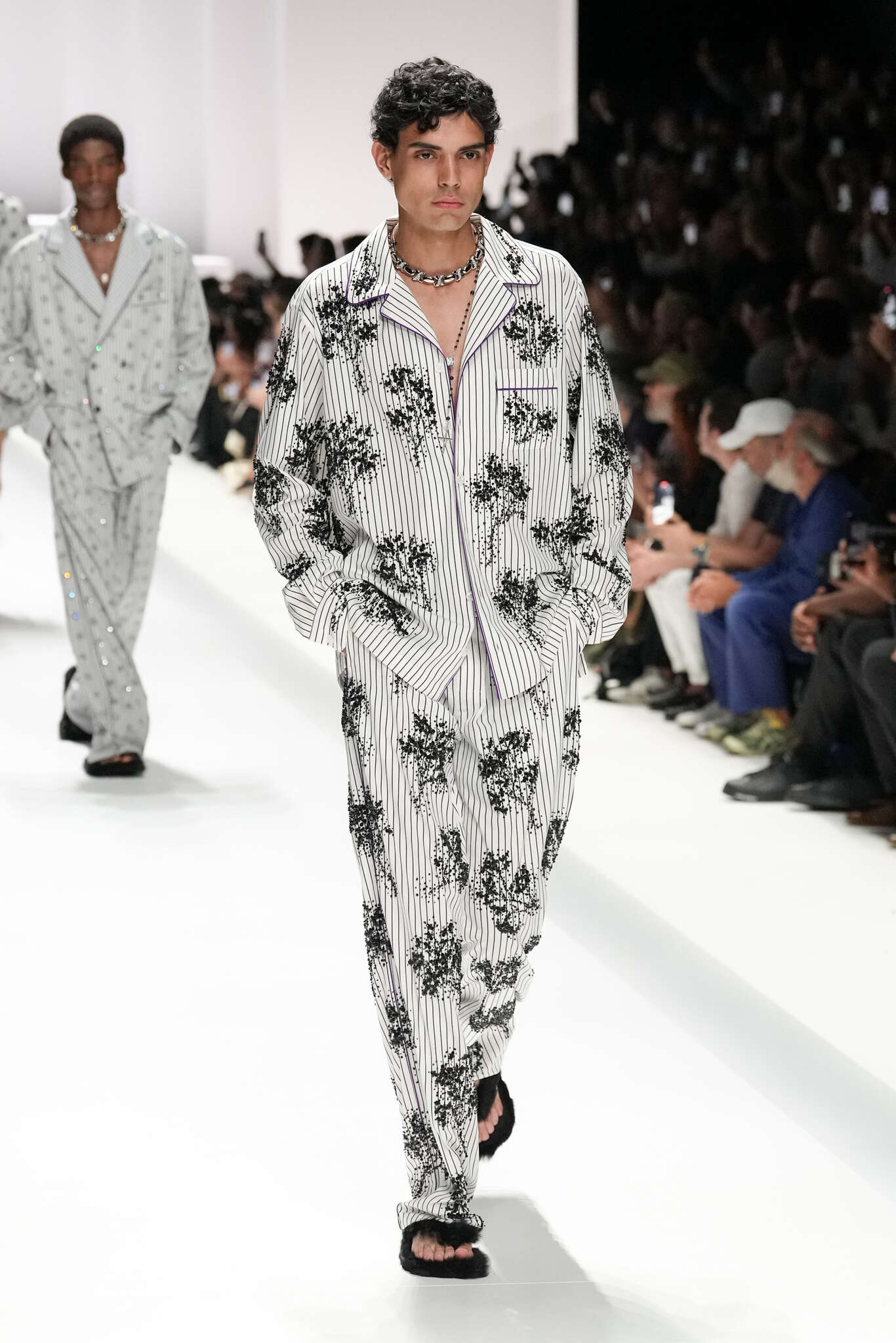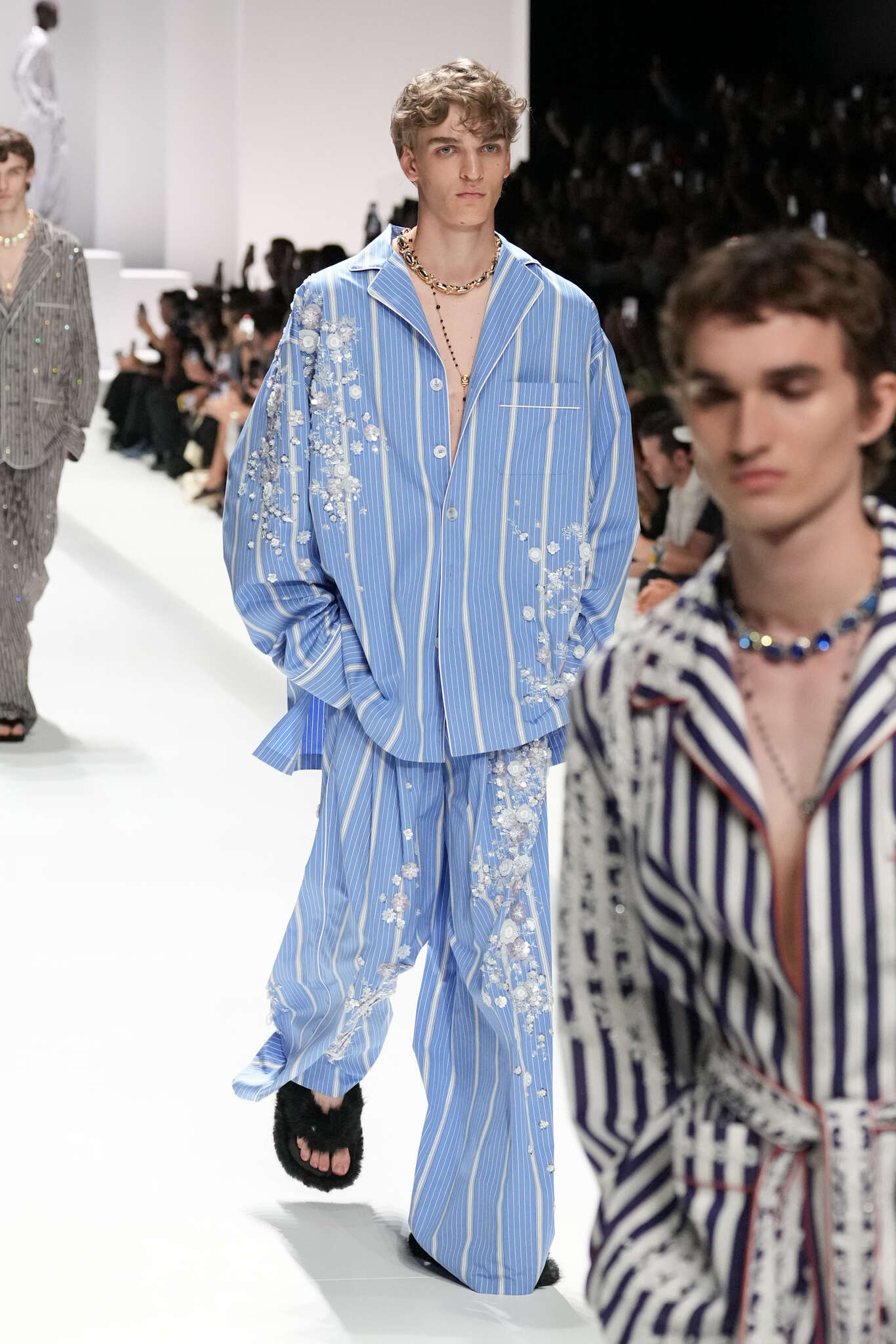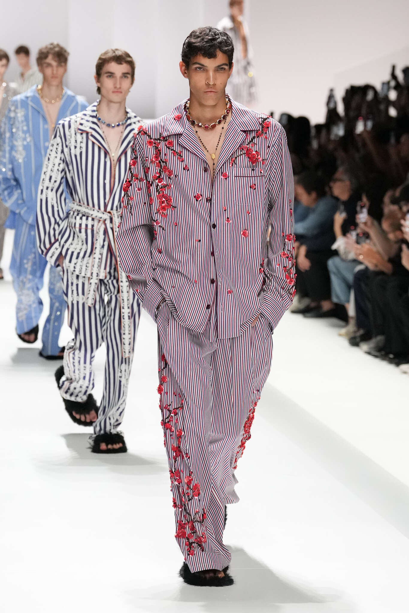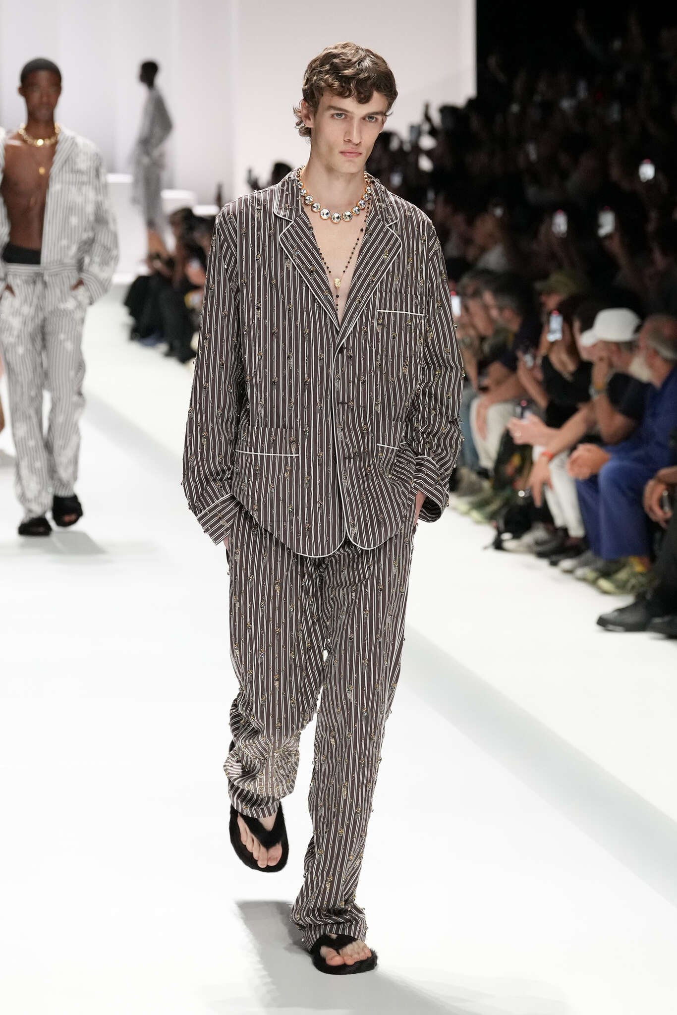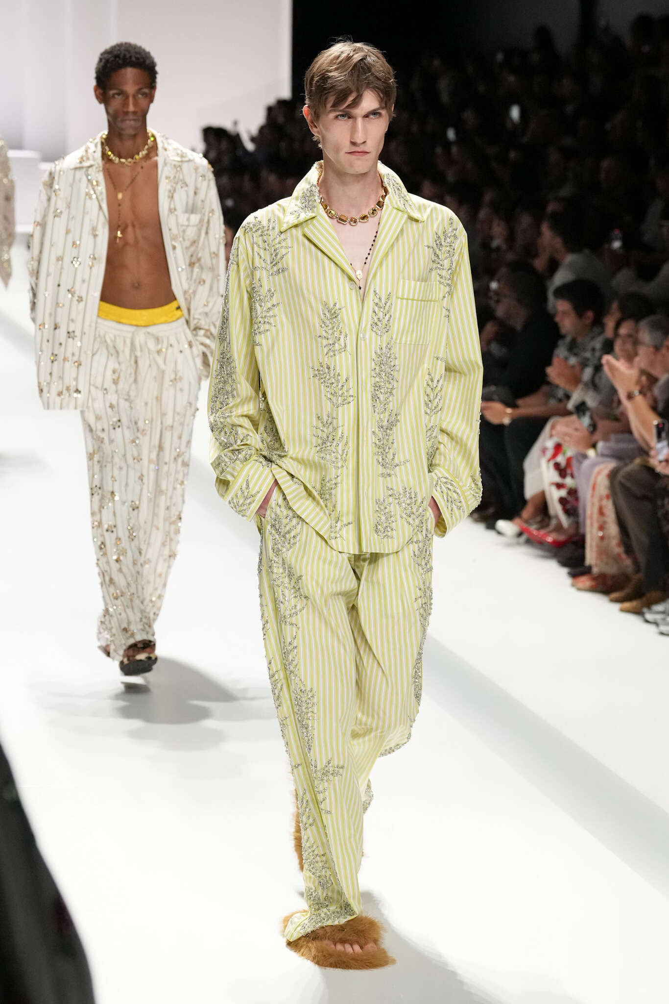 On évoquait un aspect loungewear ci-dessus pour Zegna. Chez D&G, c’est carrément le thème central de la collection, intitulée « Pyjama Boys ». Bien sûr, il ne s’agit pas de simples pyjamas. Les tissus sont ornés, brodés, décorés, rappelant ce que font certaines marques indiennes à l’aide d’artisanats traditionnels. Conformément à leur goût typique pour l’opulence et le glamour, D&G complètent les ensembles par de la fourrure (manteaux, mules), du cuir, des motifs animaliers, et des colliers ostentatoires. En fin de compte, cette collec cherche à brouiller la frontière entre vêtements d’intérieur et d’extérieur, entre l’intime et le public ; cela fonctionne assez naturellement pour certaines tenues ; et, quand cela échoue, le pyjama y gagne tout de même en charisme et raffinement.