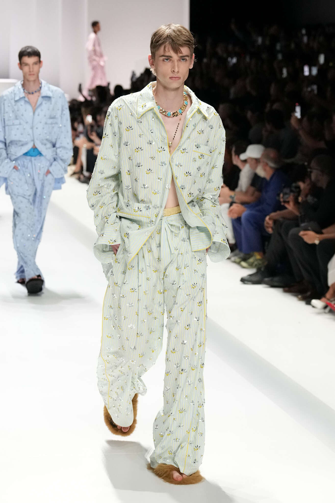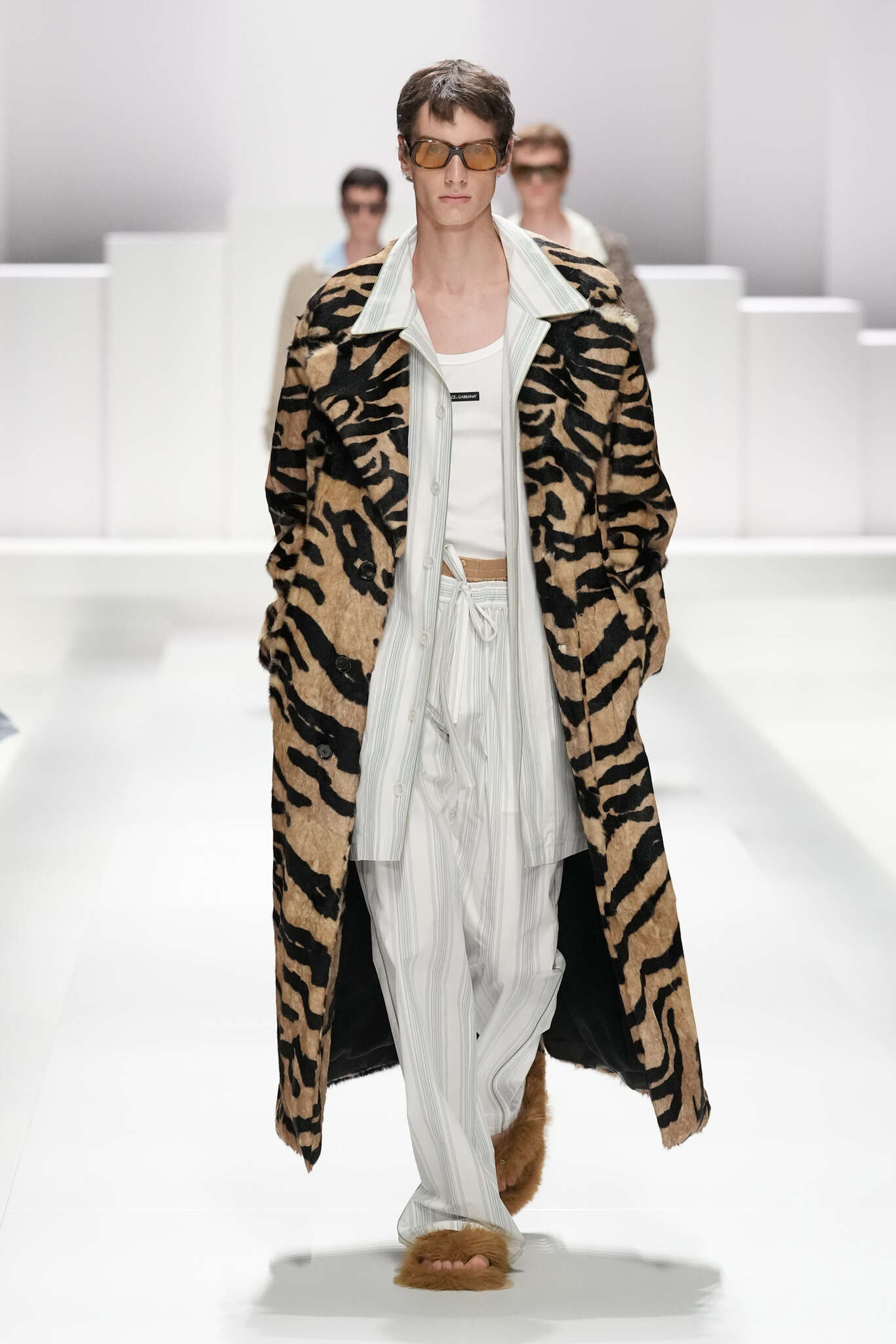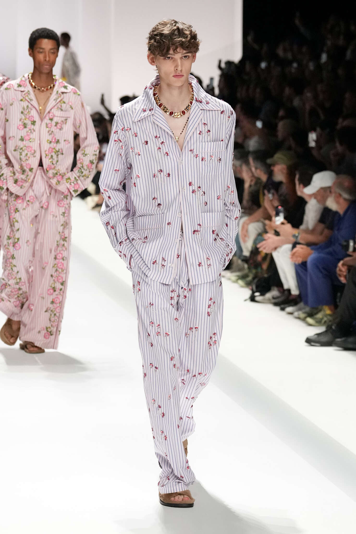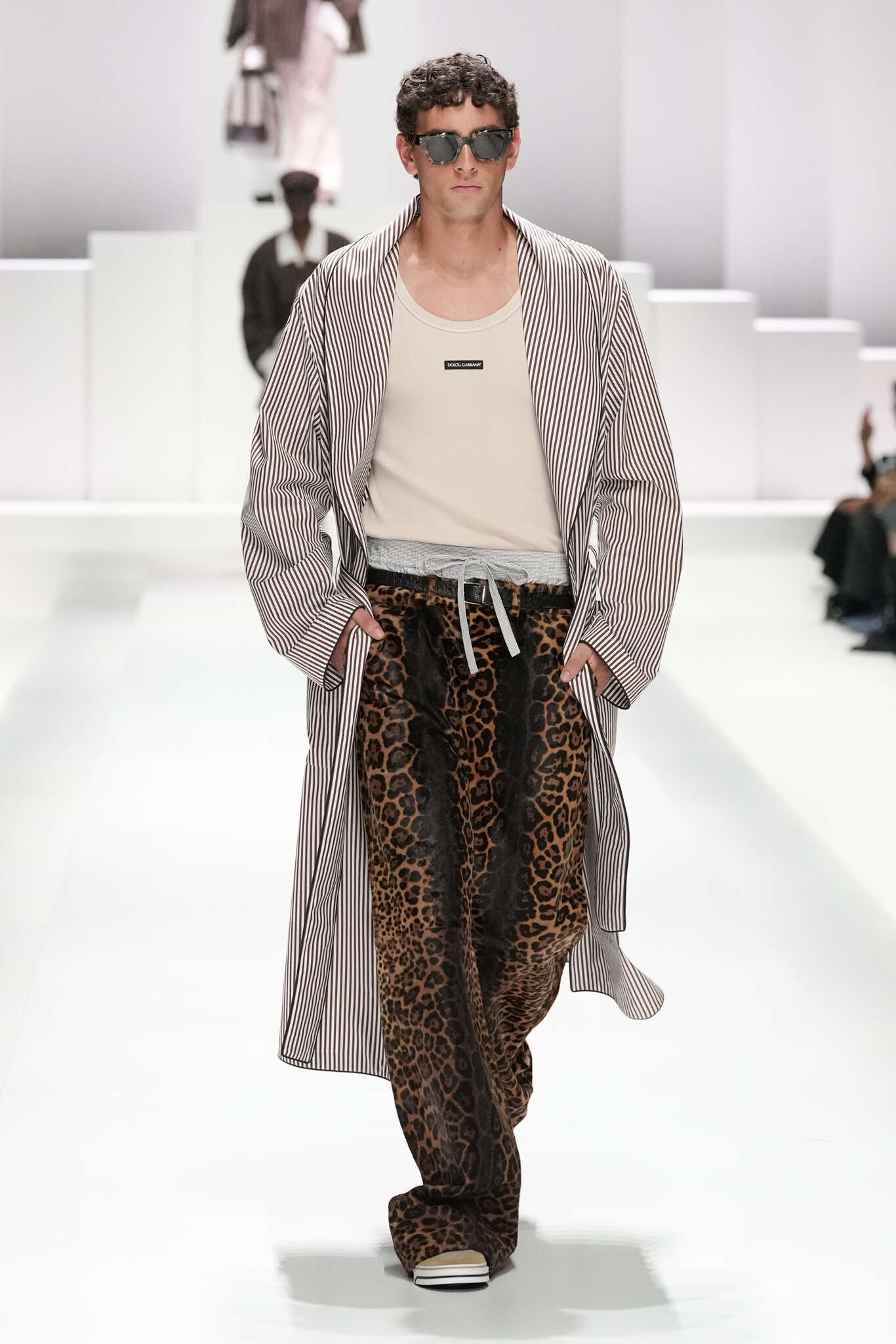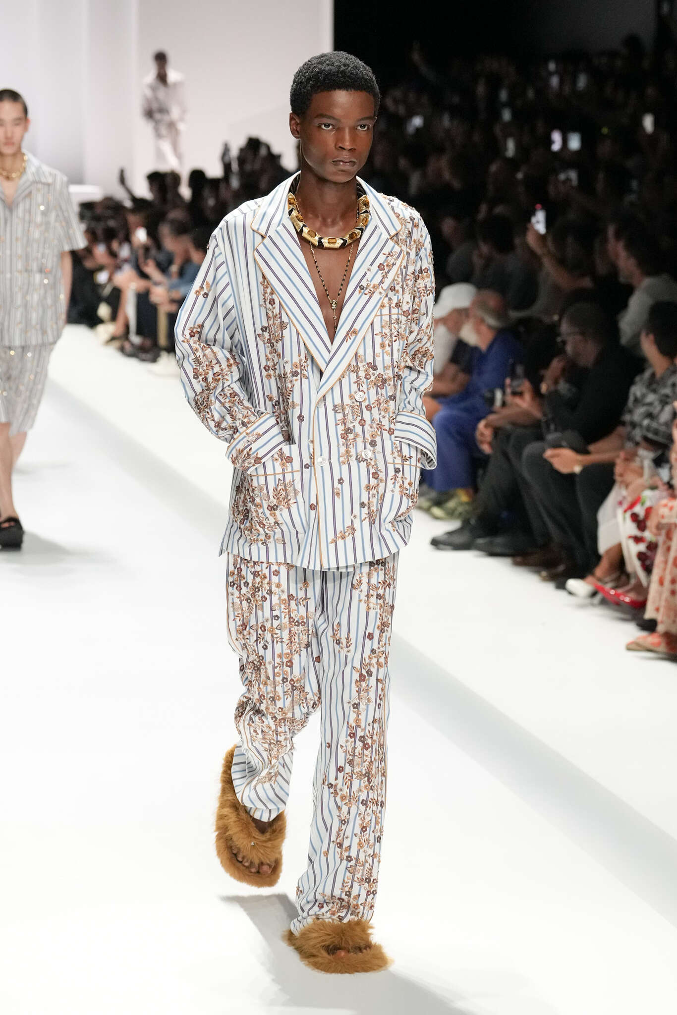 On évoquait un aspect loungewear ci-dessus pour Zegna. Chez D&G, c’est carrément le thème central de la collection, intitulée « Pyjama Boys ». Bien sûr, il ne s’agit pas de simples pyjamas. Les tissus sont ornés, brodés, décorés, rappelant ce que font certaines marques indiennes à l’aide d’artisanats traditionnels. Conformément à leur goût typique pour l’opulence et le glamour, D&G complètent les ensembles par de la fourrure (manteaux, mules), du cuir, des motifs animaliers, et des colliers ostentatoires. En fin de compte, cette collec cherche à brouiller la frontière entre vêtements d’intérieur et d’extérieur, entre l’intime et le public ; cela fonctionne assez naturellement pour certaines tenues ; et, quand cela échoue, le pyjama y gagne tout de même en charisme et raffinement.