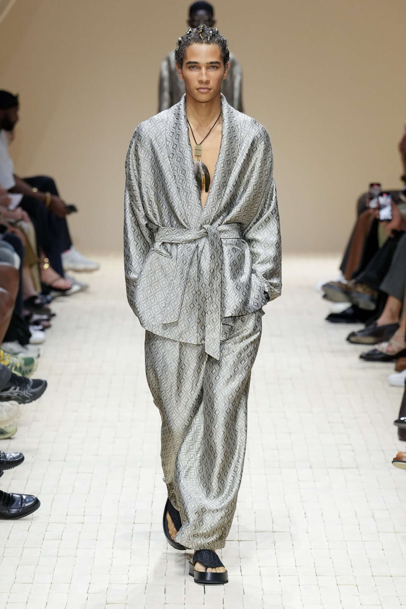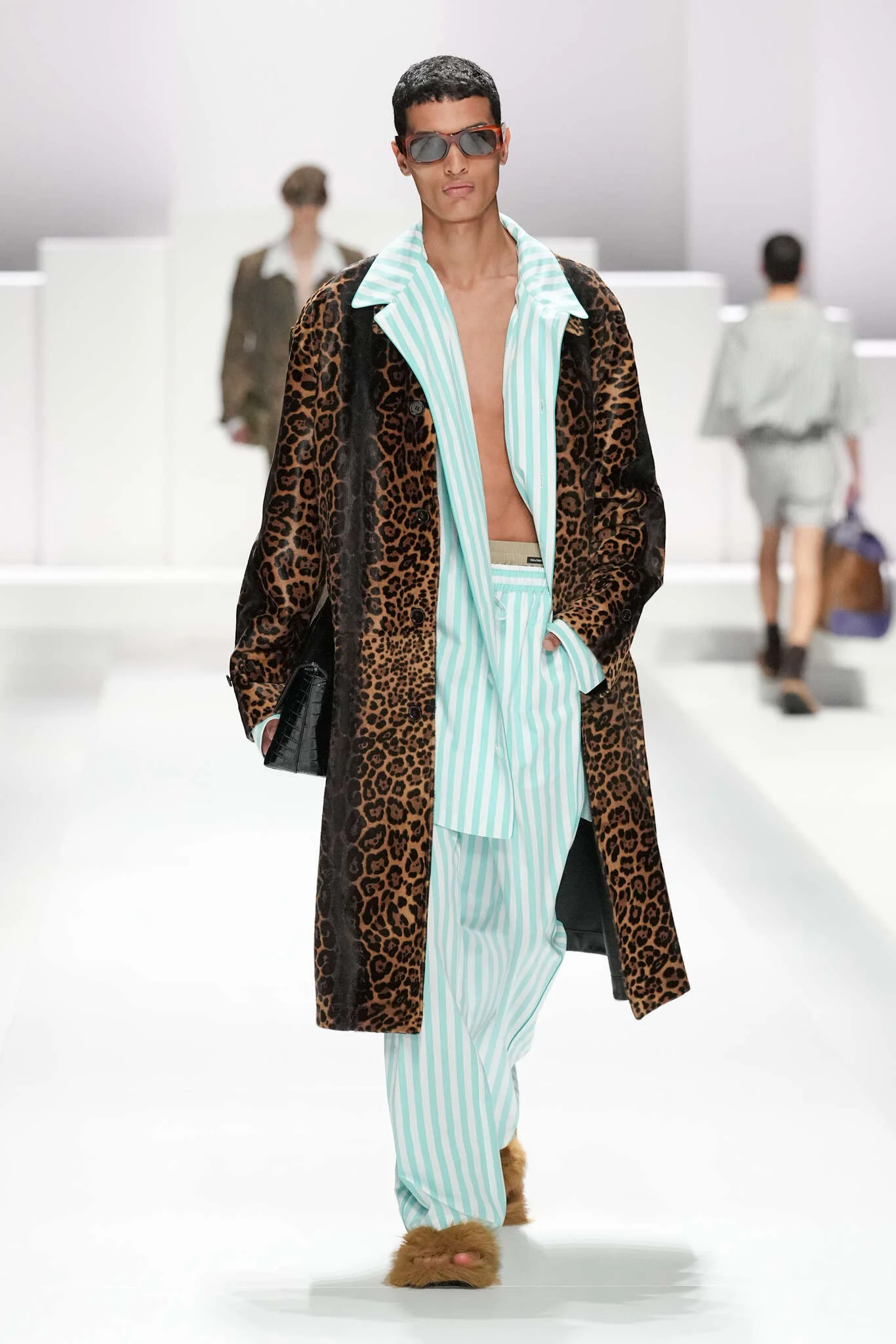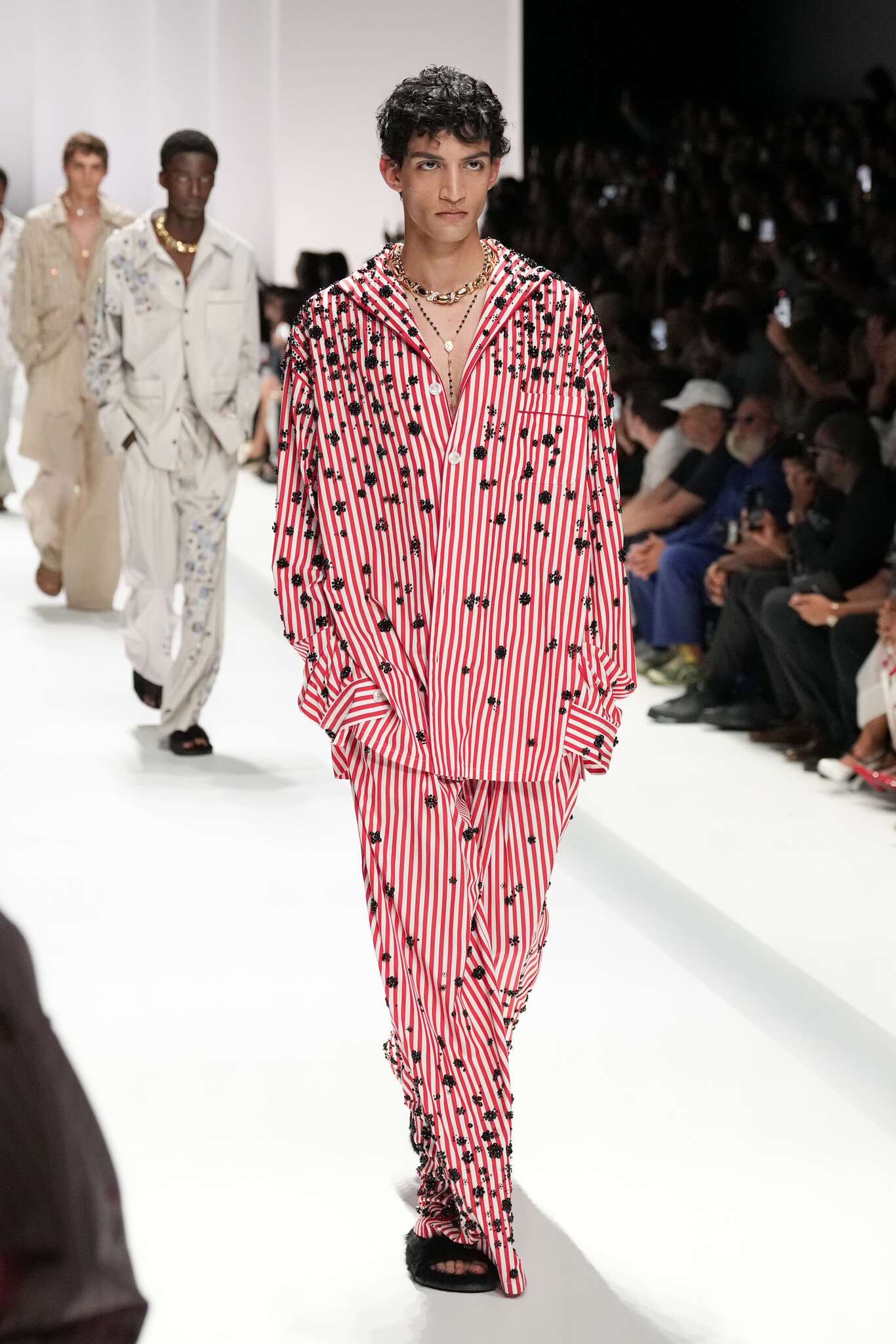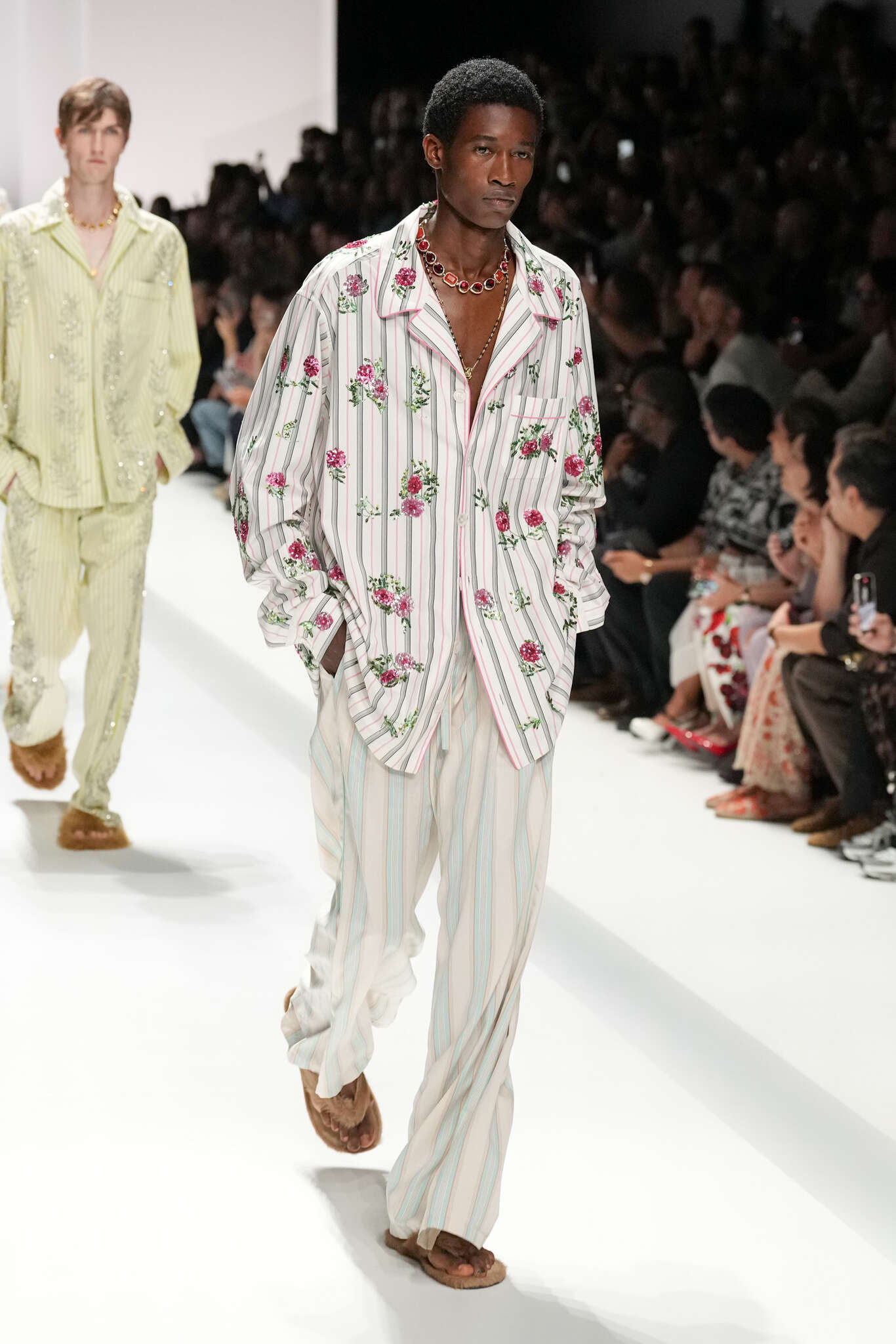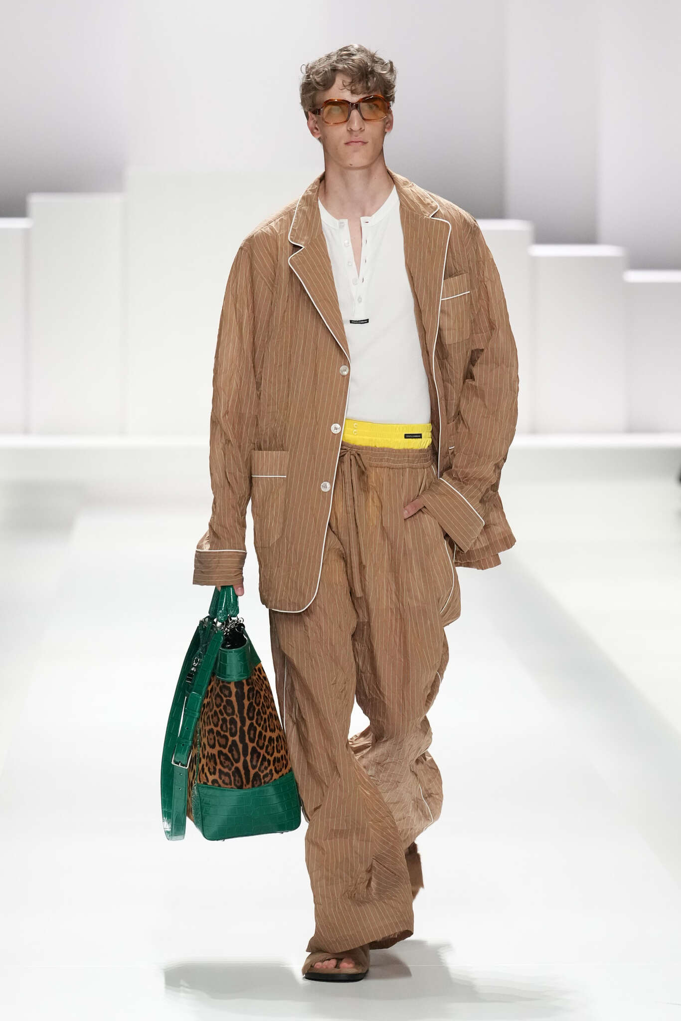 On évoquait un aspect loungewear ci-dessus pour Zegna. Chez D&G, c’est carrément le thème central de la collection, intitulée « Pyjama Boys ». Bien sûr, il ne s’agit pas de simples pyjamas. Les tissus sont ornés, brodés, décorés, rappelant ce que font certaines marques indiennes à l’aide d’artisanats traditionnels. Conformément à leur goût typique pour l’opulence et le glamour, D&G complètent les ensembles par de la fourrure (manteaux, mules), du cuir, des motifs animaliers, et des colliers ostentatoires. En fin de compte, cette collec cherche à brouiller la frontière entre vêtements d’intérieur et d’extérieur, entre l’intime et le public ; cela fonctionne assez naturellement pour certaines tenues ; et, quand cela échoue, le pyjama y gagne tout de même en charisme et raffinement.