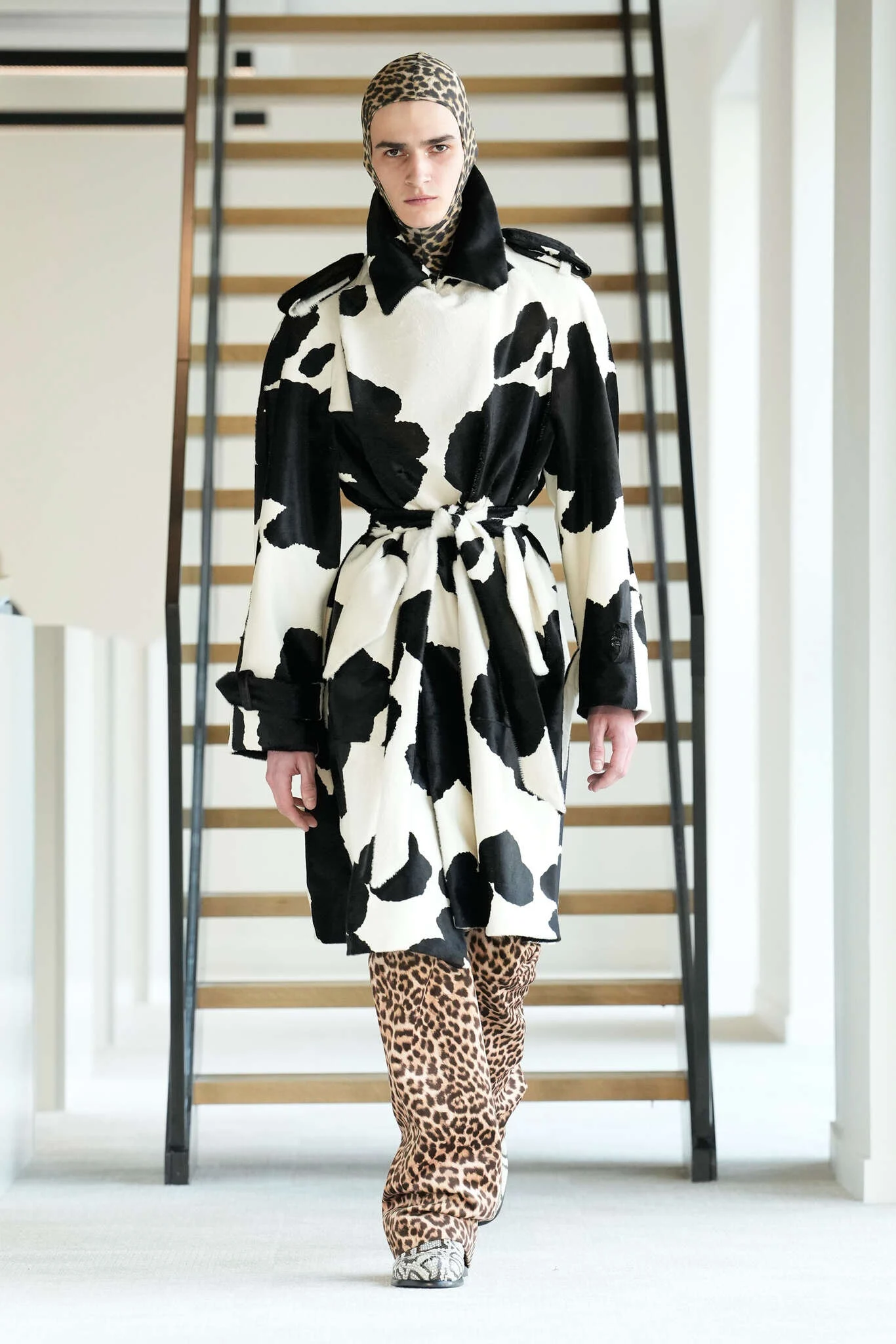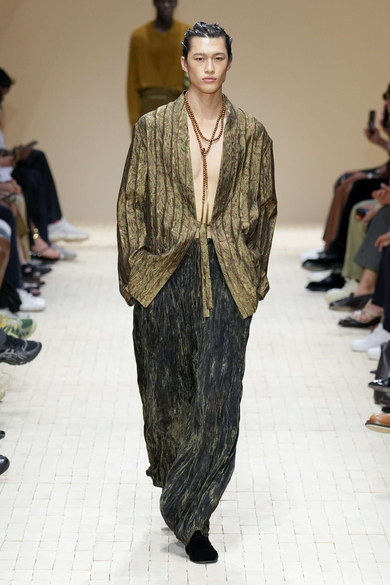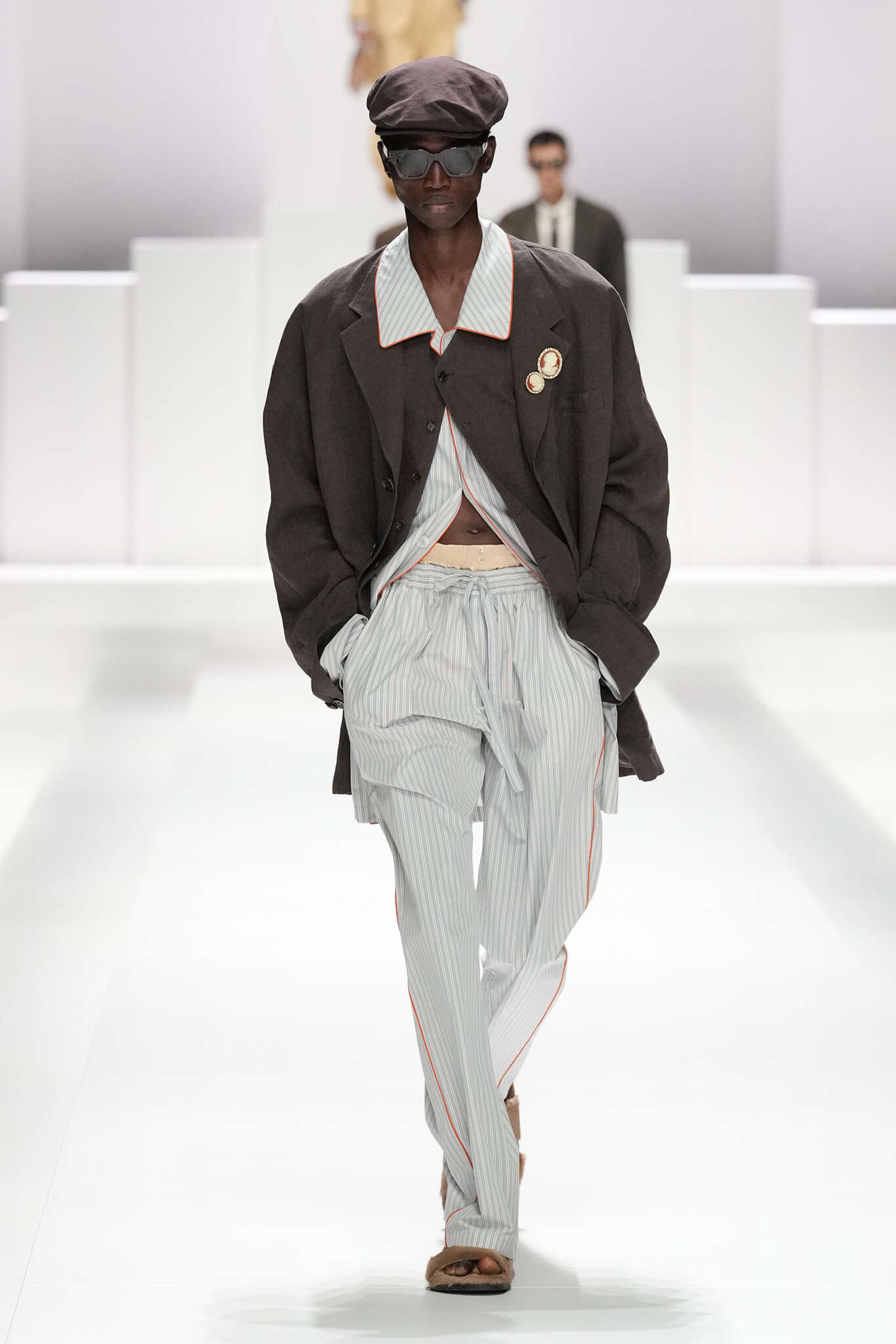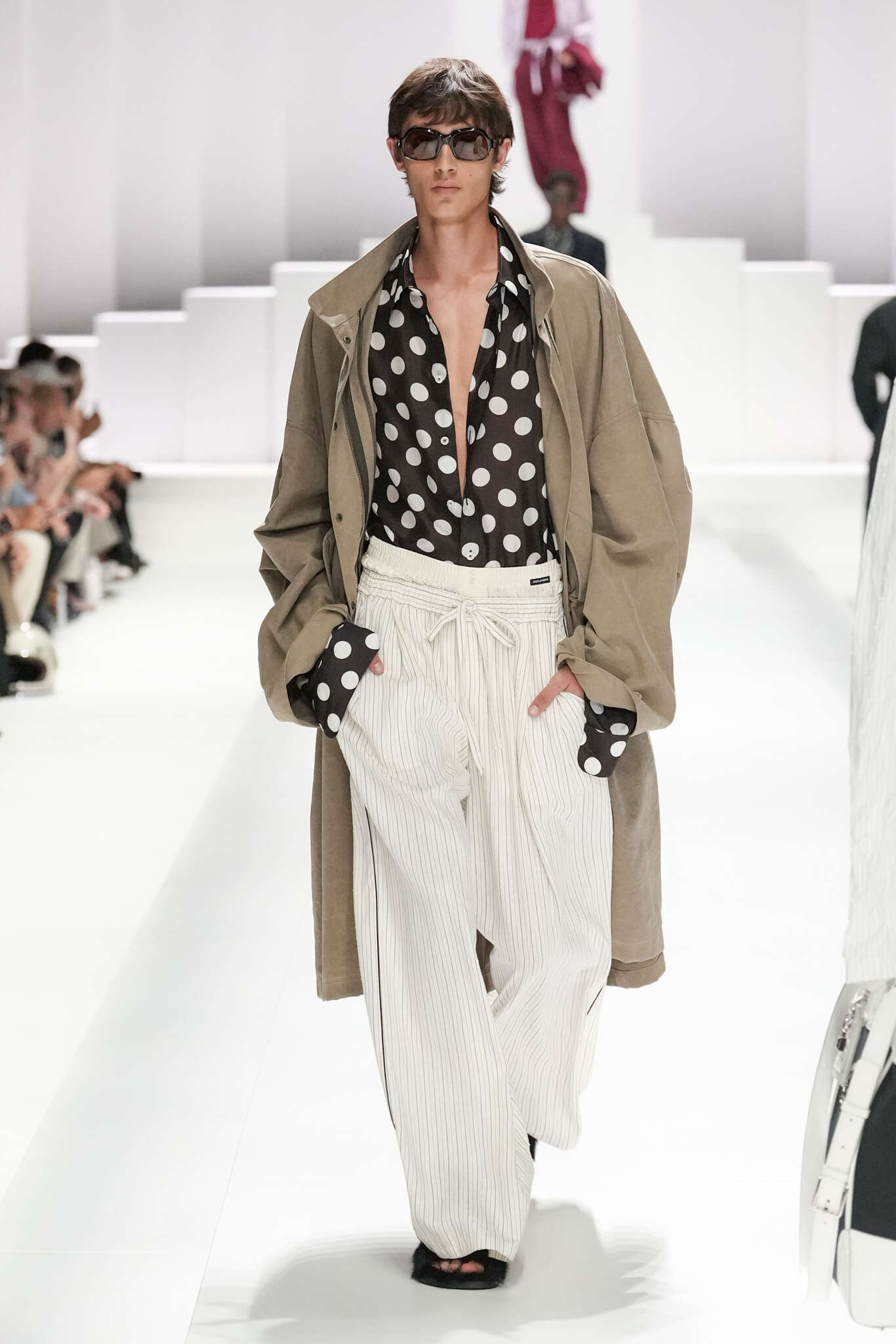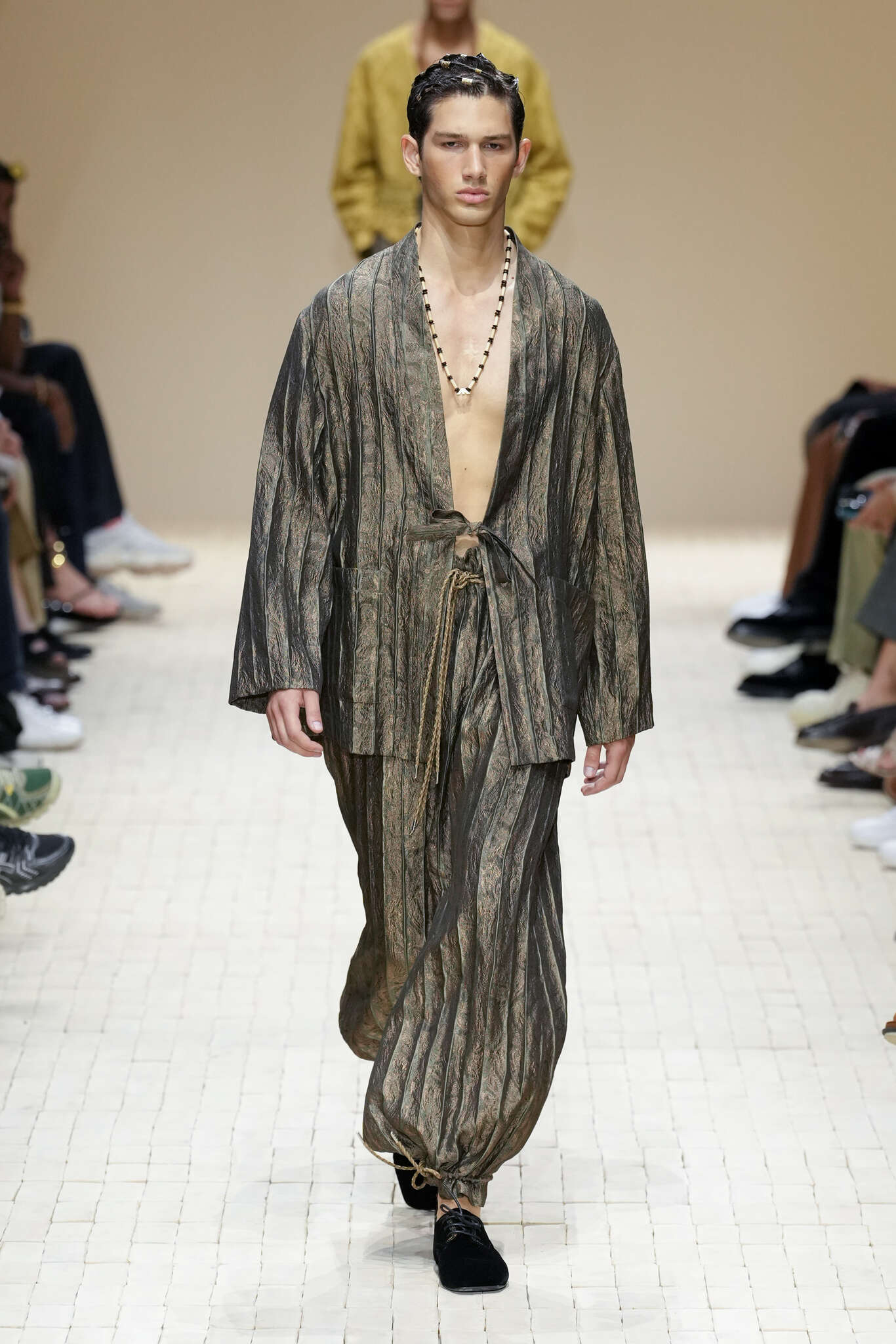 On évoquait un aspect loungewear ci-dessus pour Zegna. Chez D&G, c’est carrément le thème central de la collection, intitulée « Pyjama Boys ». Bien sûr, il ne s’agit pas de simples pyjamas. Les tissus sont ornés, brodés, décorés, rappelant ce que font certaines marques indiennes à l’aide d’artisanats traditionnels. Conformément à leur goût typique pour l’opulence et le glamour, D&G complètent les ensembles par de la fourrure (manteaux, mules), du cuir, des motifs animaliers, et des colliers ostentatoires. En fin de compte, cette collec cherche à brouiller la frontière entre vêtements d’intérieur et d’extérieur, entre l’intime et le public ; cela fonctionne assez naturellement pour certaines tenues ; et, quand cela échoue, le pyjama y gagne tout de même en charisme et raffinement.