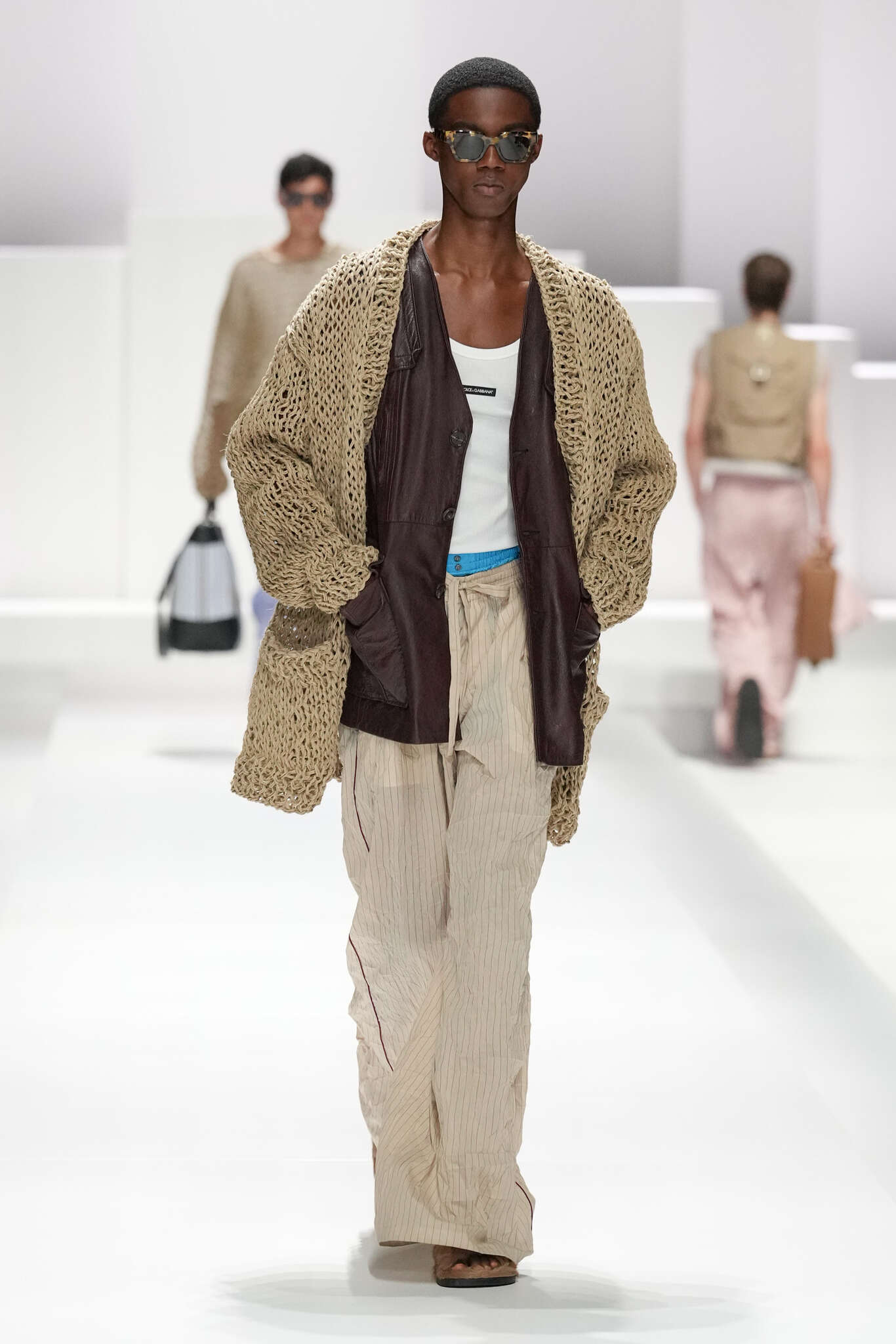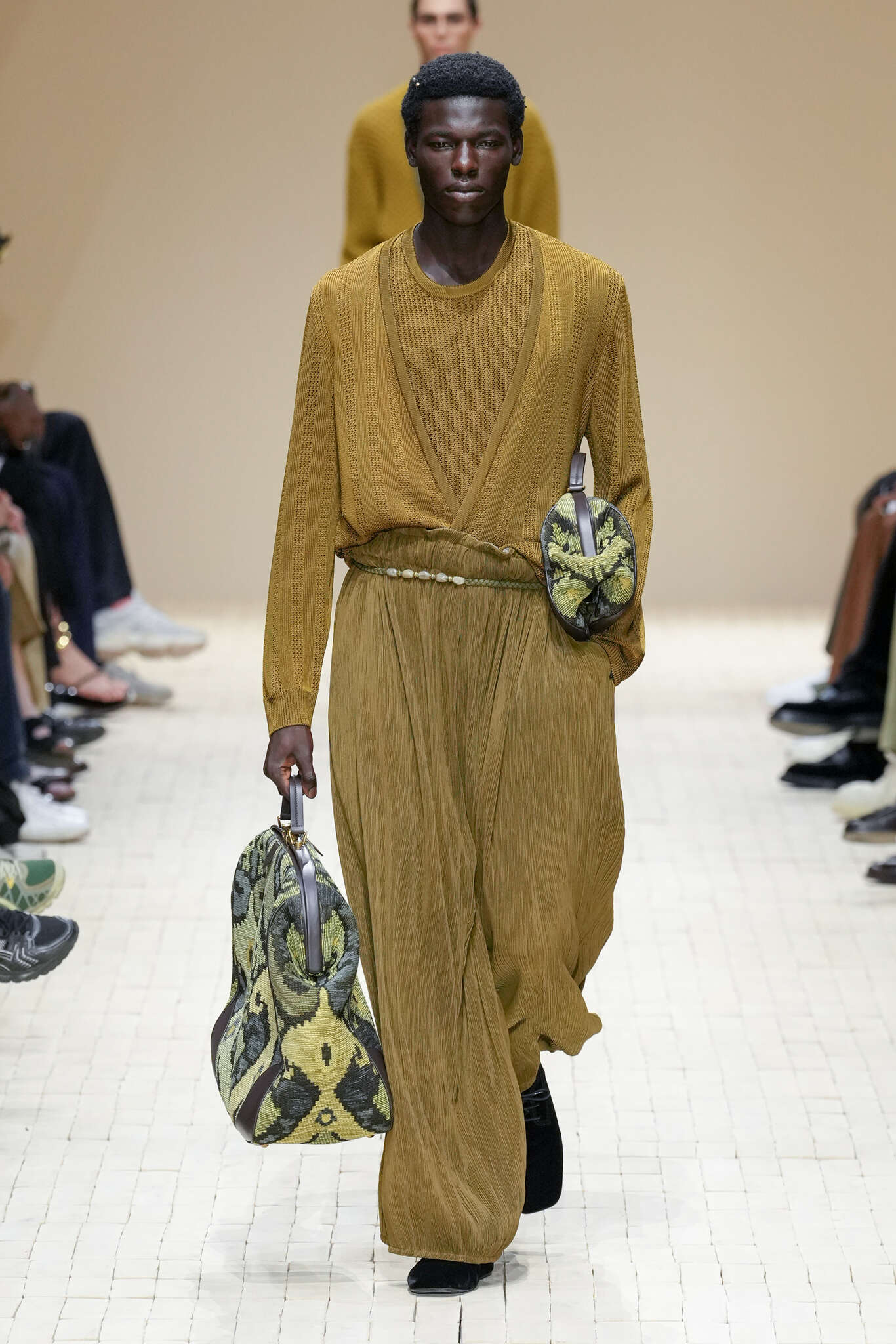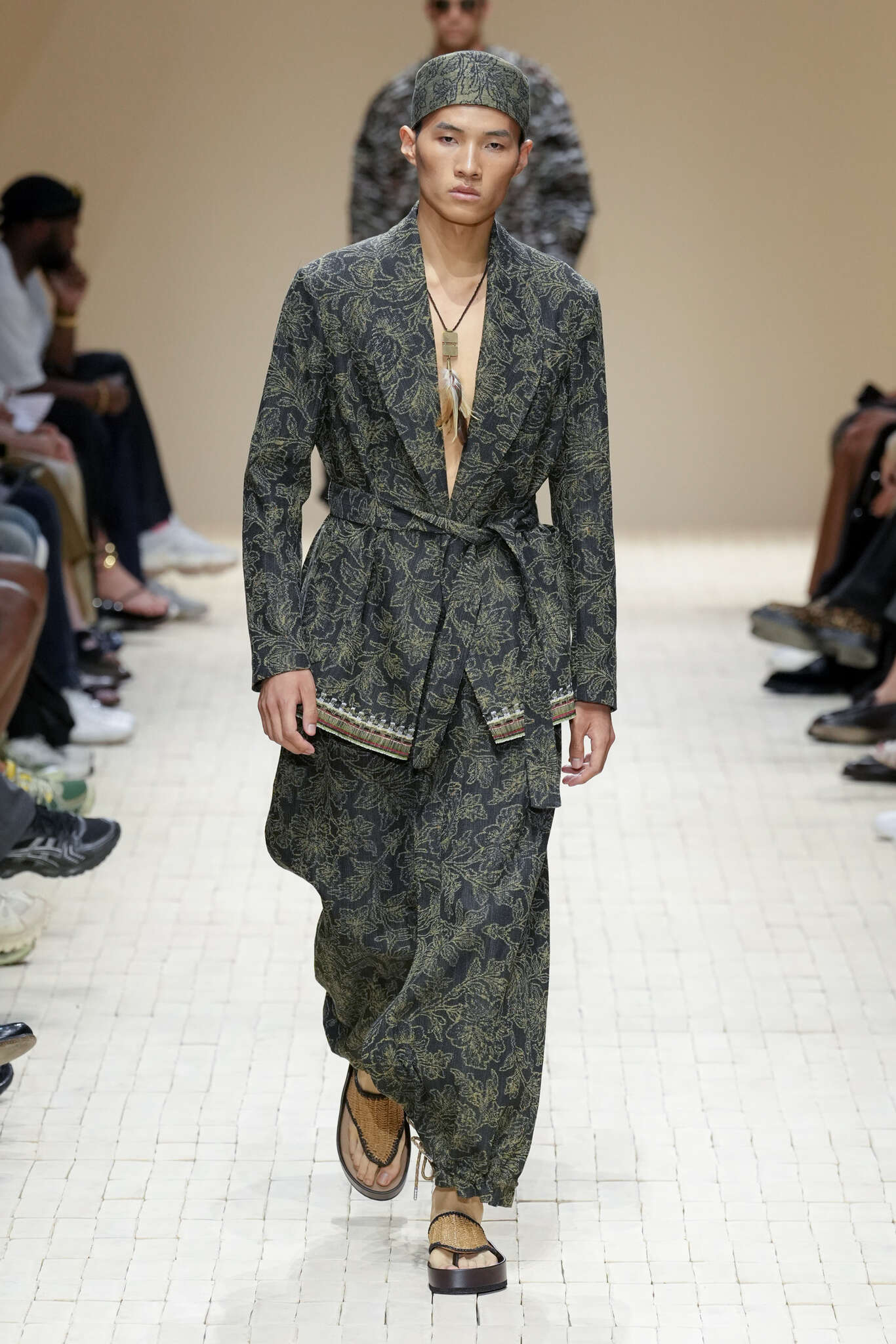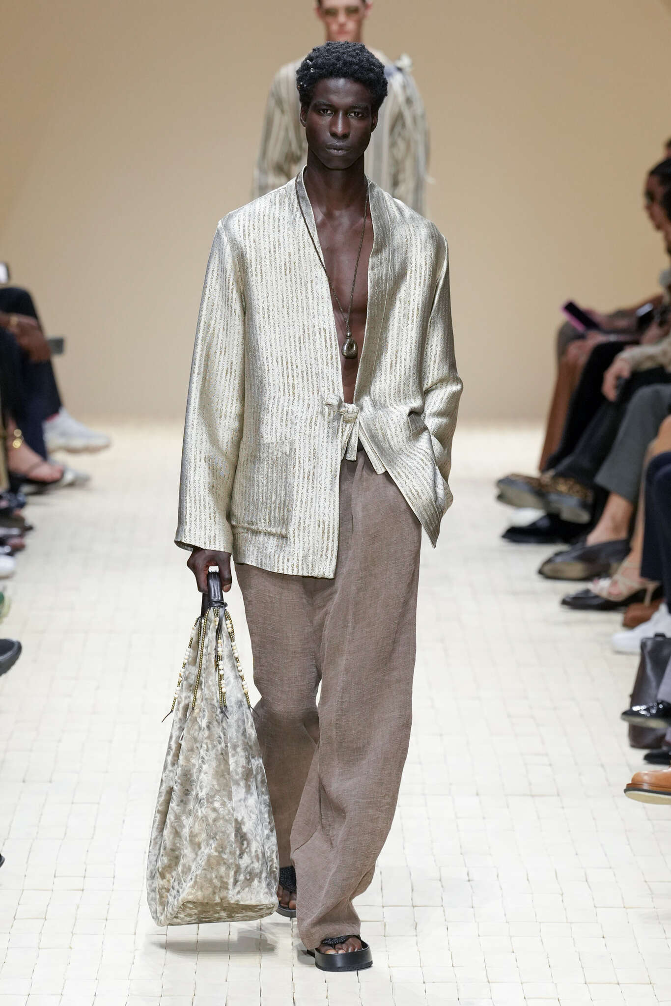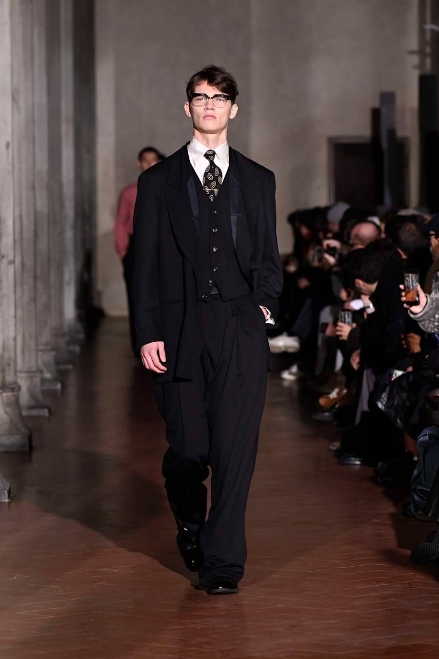 On évoquait un aspect loungewear ci-dessus pour Zegna. Chez D&G, c’est carrément le thème central de la collection, intitulée « Pyjama Boys ». Bien sûr, il ne s’agit pas de simples pyjamas. Les tissus sont ornés, brodés, décorés, rappelant ce que font certaines marques indiennes à l’aide d’artisanats traditionnels. Conformément à leur goût typique pour l’opulence et le glamour, D&G complètent les ensembles par de la fourrure (manteaux, mules), du cuir, des motifs animaliers, et des colliers ostentatoires. En fin de compte, cette collec cherche à brouiller la frontière entre vêtements d’intérieur et d’extérieur, entre l’intime et le public ; cela fonctionne assez naturellement pour certaines tenues ; et, quand cela échoue, le pyjama y gagne tout de même en charisme et raffinement.