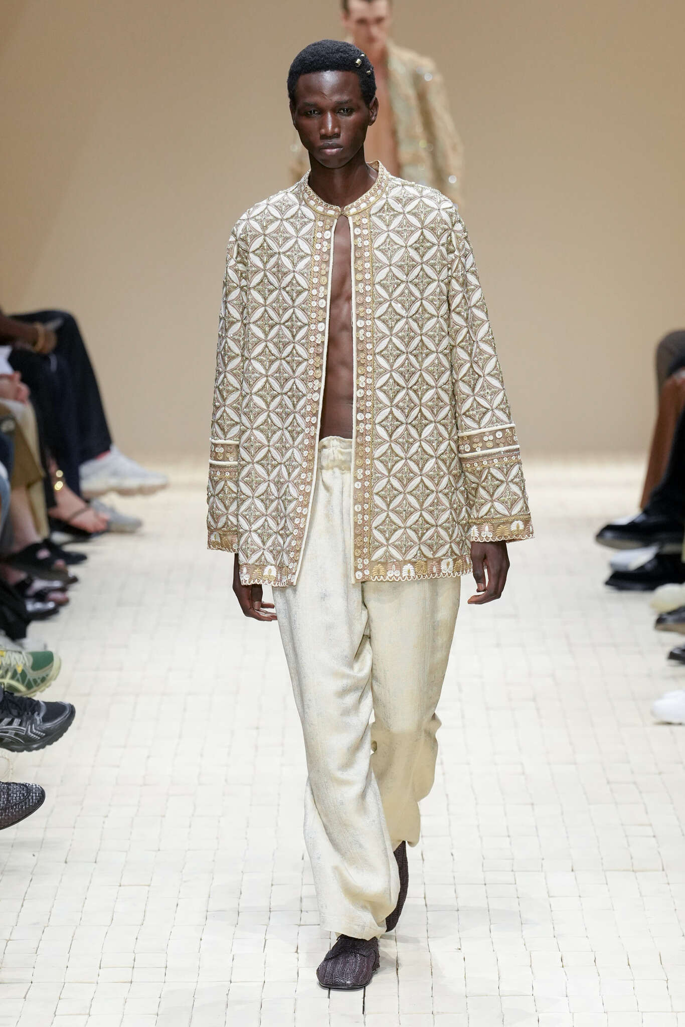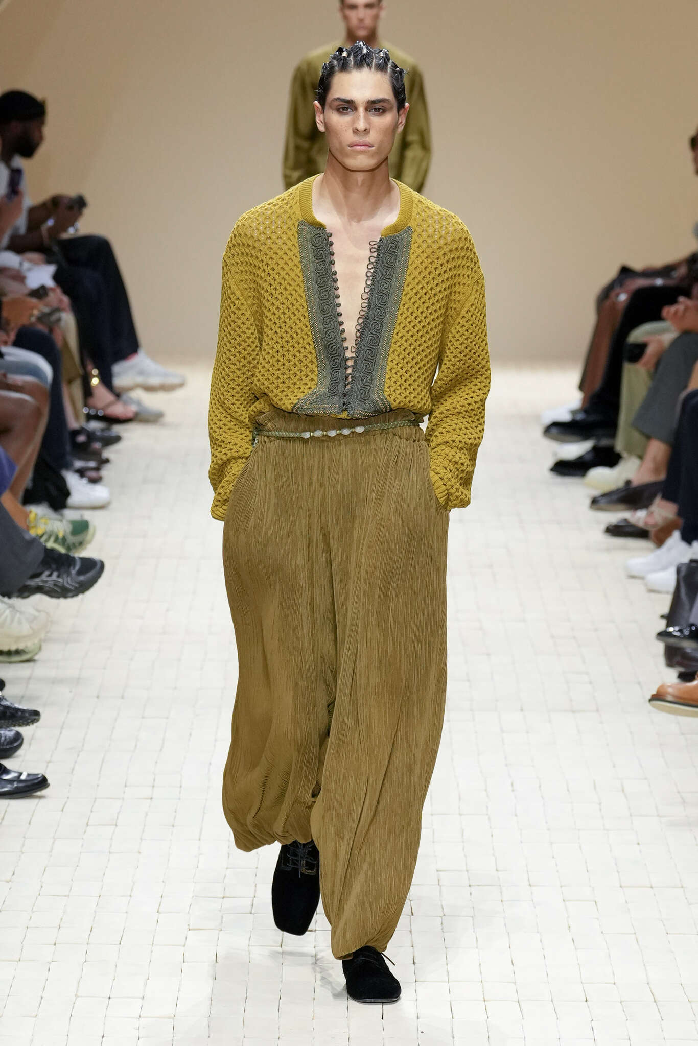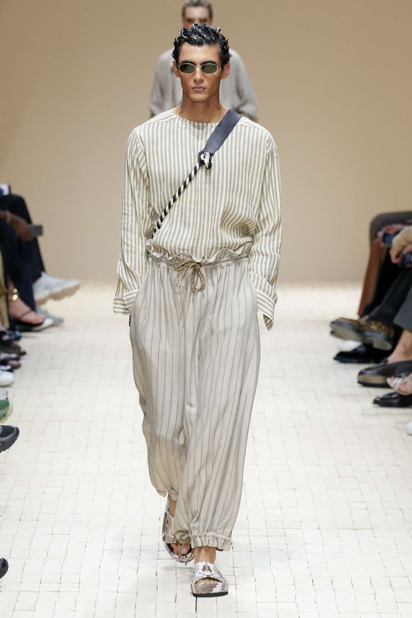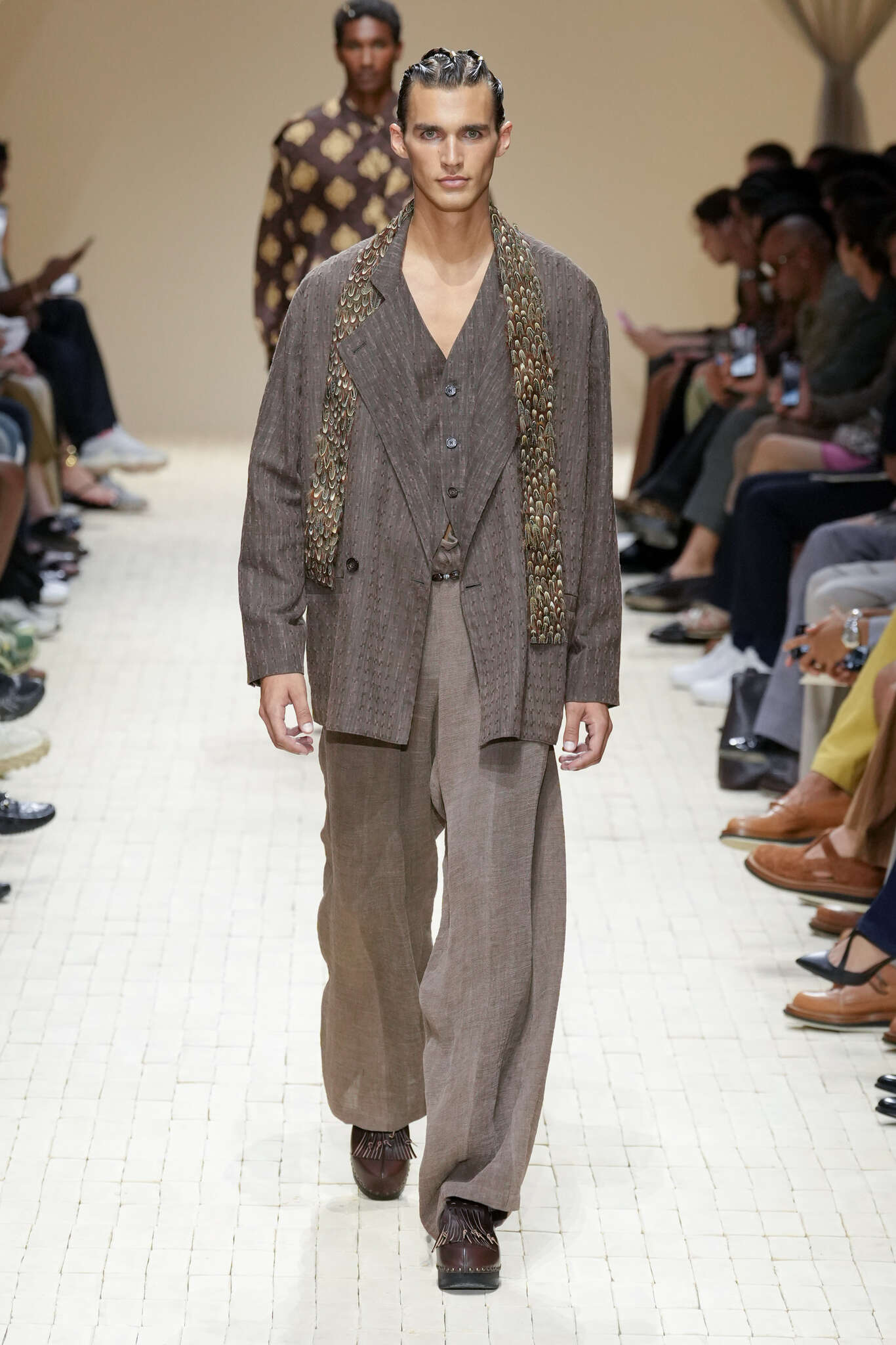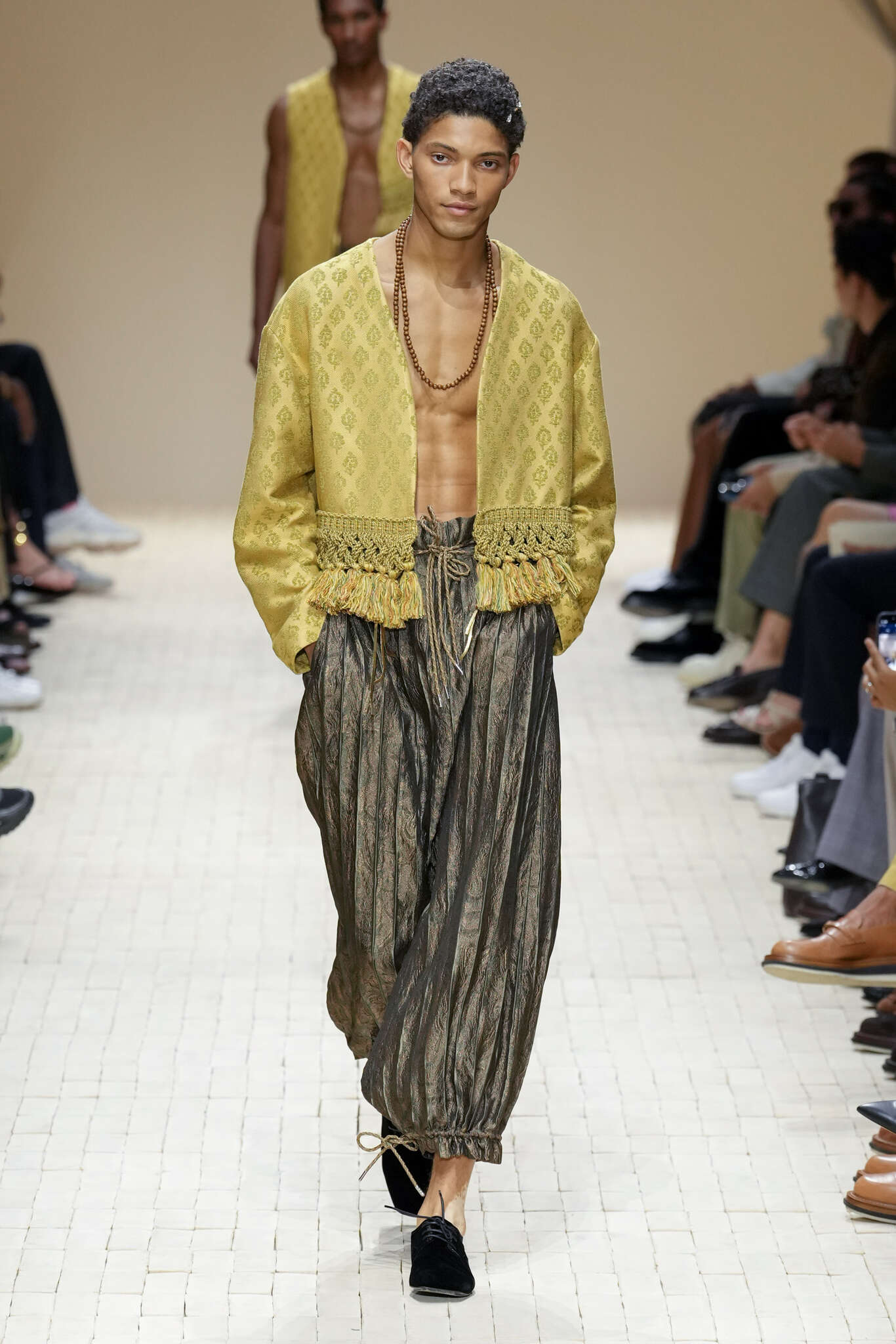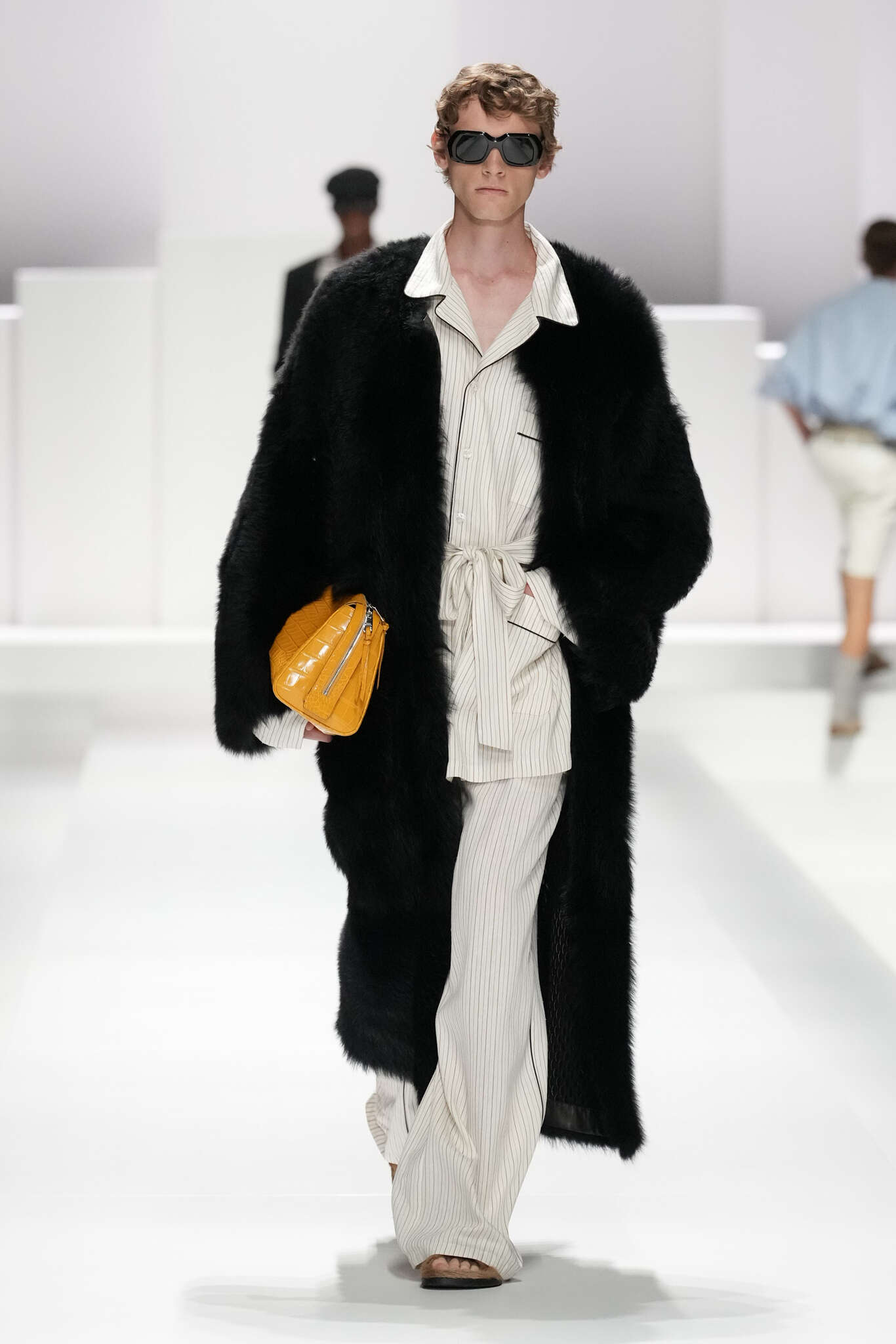 On évoquait un aspect loungewear ci-dessus pour Zegna. Chez D&G, c’est carrément le thème central de la collection, intitulée « Pyjama Boys ». Bien sûr, il ne s’agit pas de simples pyjamas. Les tissus sont ornés, brodés, décorés, rappelant ce que font certaines marques indiennes à l’aide d’artisanats traditionnels. Conformément à leur goût typique pour l’opulence et le glamour, D&G complètent les ensembles par de la fourrure (manteaux, mules), du cuir, des motifs animaliers, et des colliers ostentatoires. En fin de compte, cette collec cherche à brouiller la frontière entre vêtements d’intérieur et d’extérieur, entre l’intime et le public ; cela fonctionne assez naturellement pour certaines tenues ; et, quand cela échoue, le pyjama y gagne tout de même en charisme et raffinement.