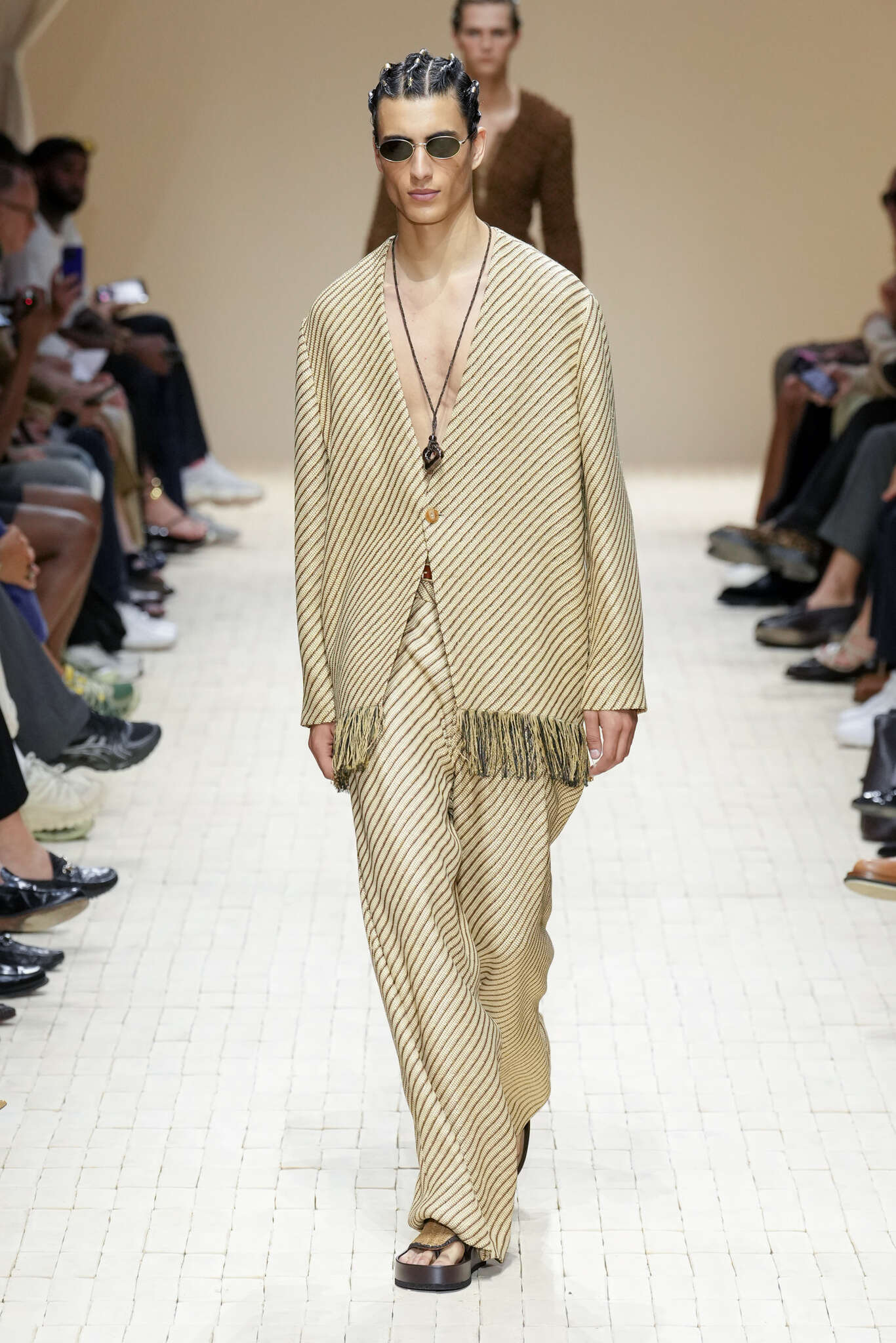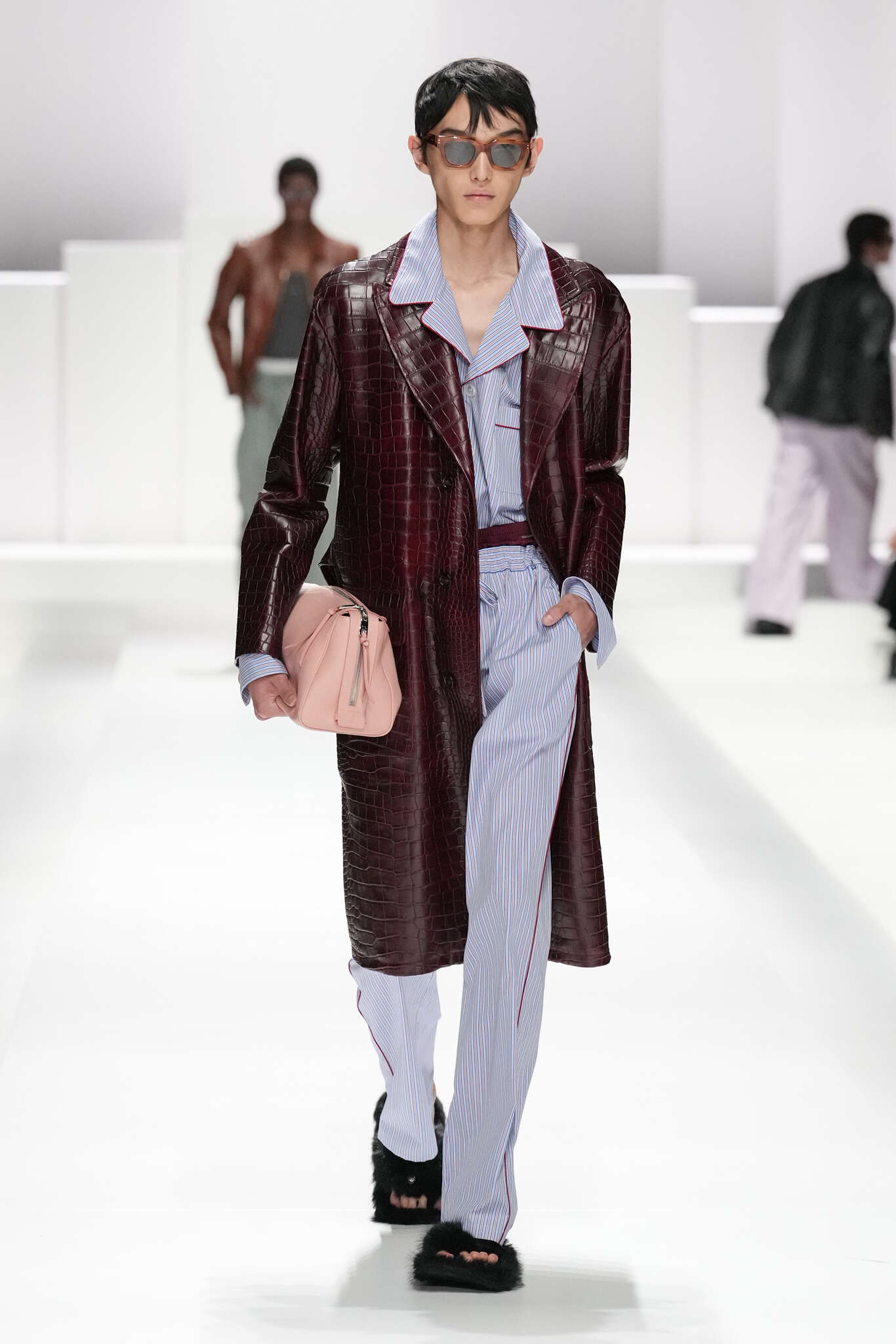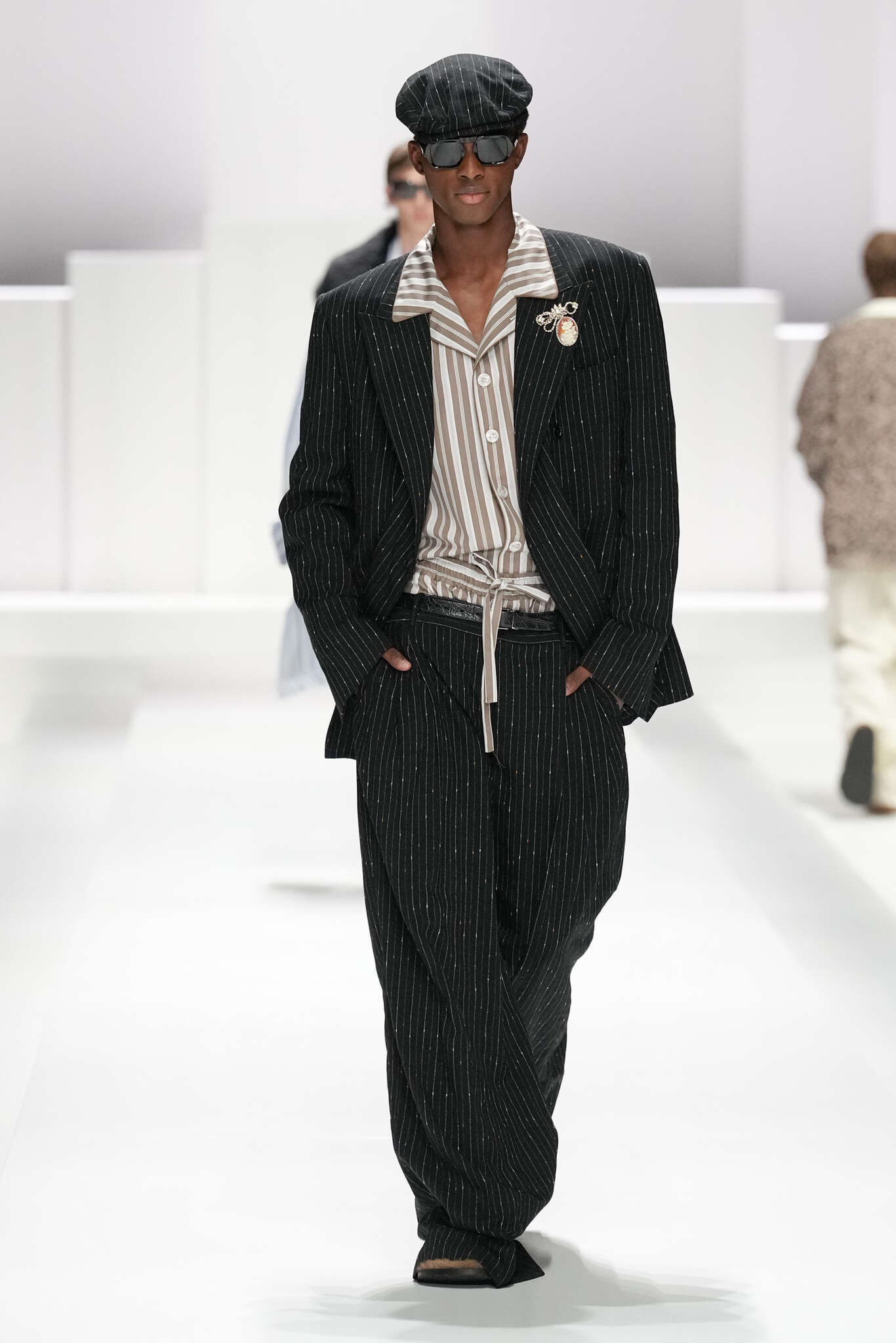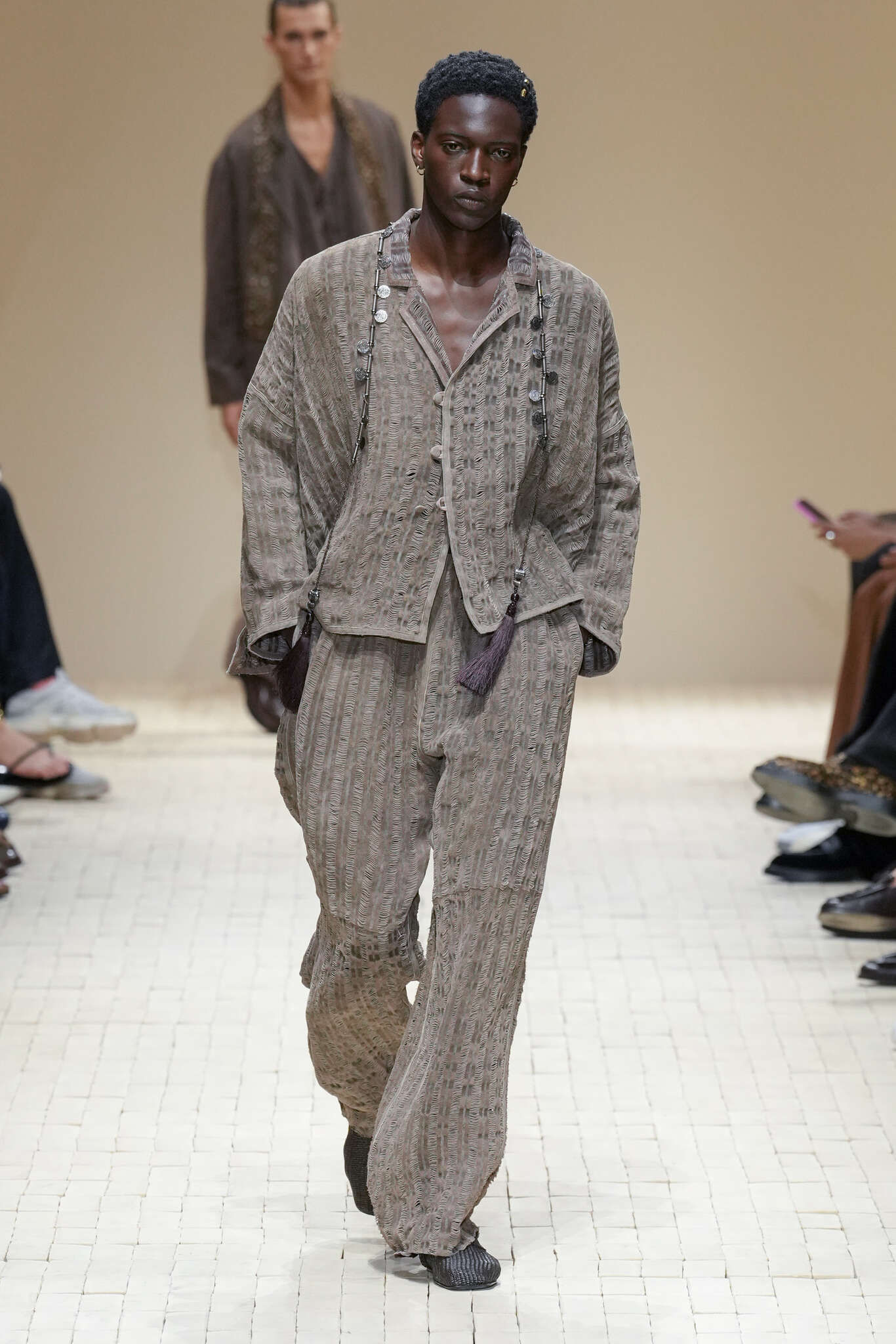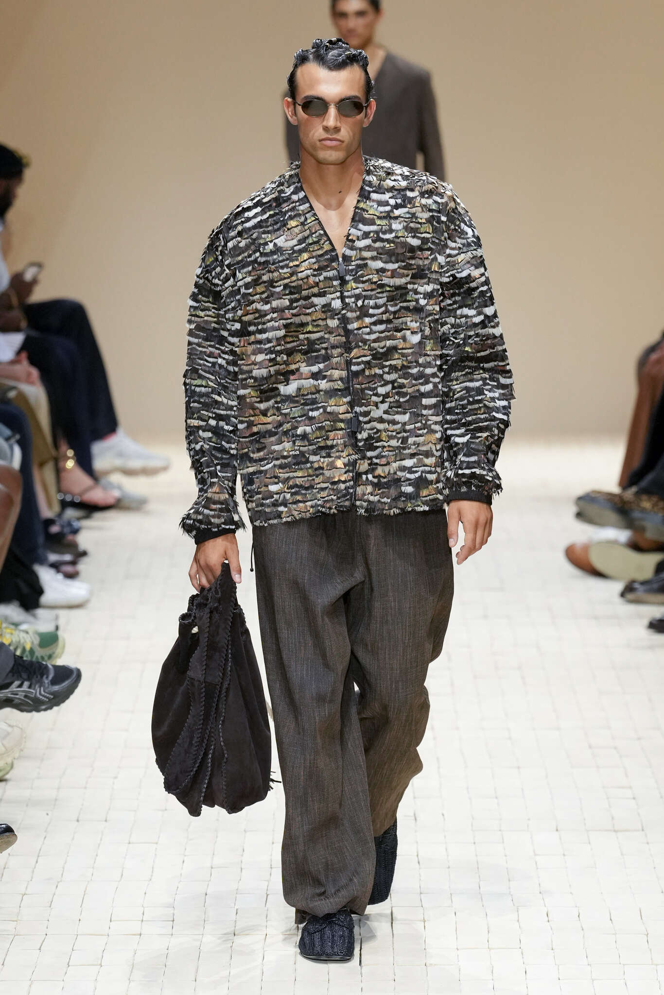 On évoquait un aspect loungewear ci-dessus pour Zegna. Chez D&G, c’est carrément le thème central de la collection, intitulée « Pyjama Boys ». Bien sûr, il ne s’agit pas de simples pyjamas. Les tissus sont ornés, brodés, décorés, rappelant ce que font certaines marques indiennes à l’aide d’artisanats traditionnels. Conformément à leur goût typique pour l’opulence et le glamour, D&G complètent les ensembles par de la fourrure (manteaux, mules), du cuir, des motifs animaliers, et des colliers ostentatoires. En fin de compte, cette collec cherche à brouiller la frontière entre vêtements d’intérieur et d’extérieur, entre l’intime et le public ; cela fonctionne assez naturellement pour certaines tenues ; et, quand cela échoue, le pyjama y gagne tout de même en charisme et raffinement.