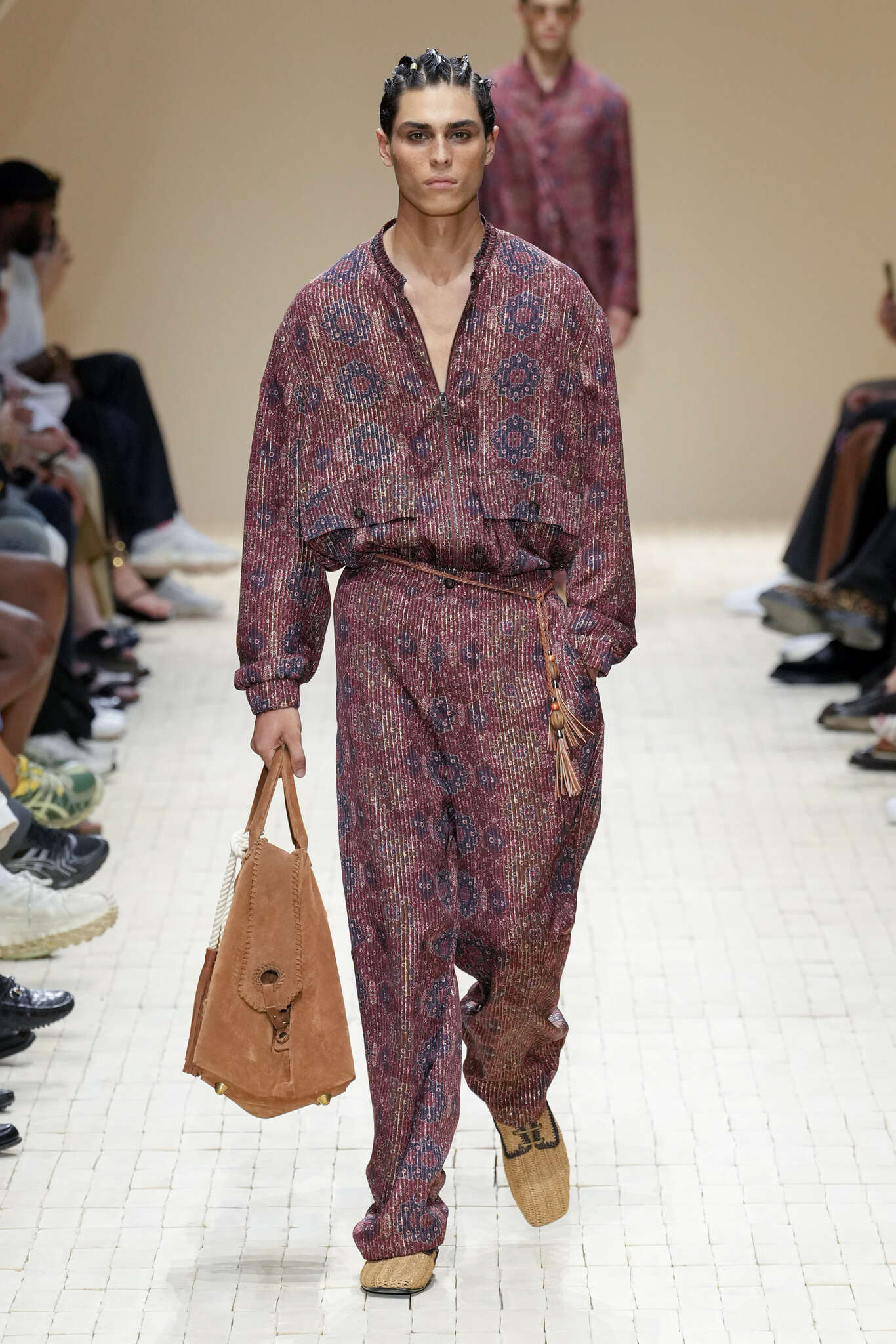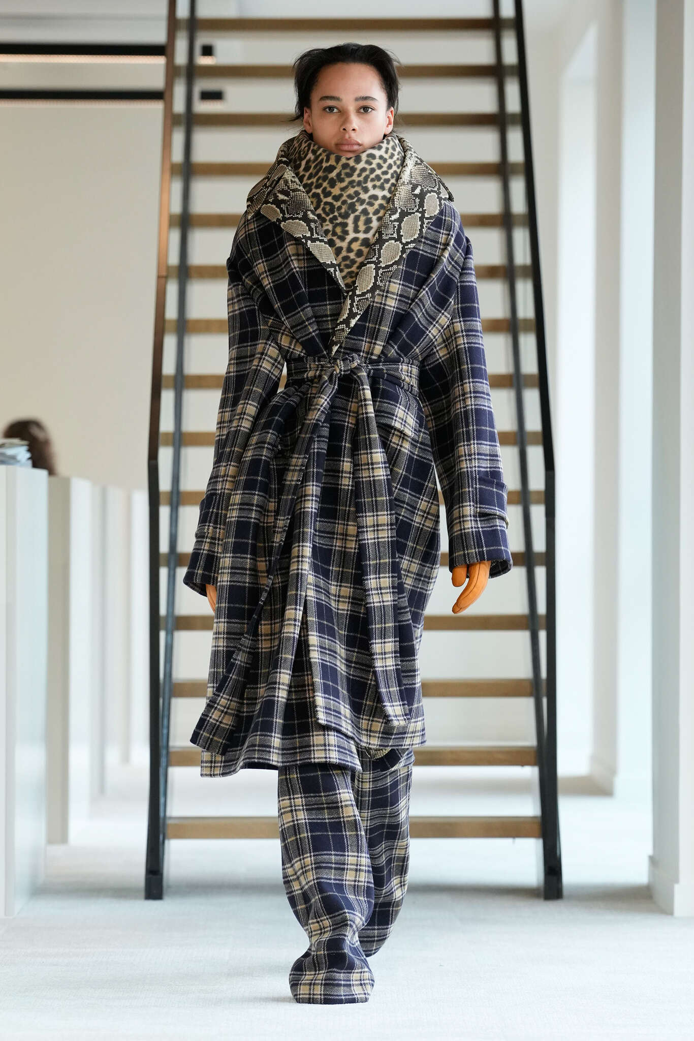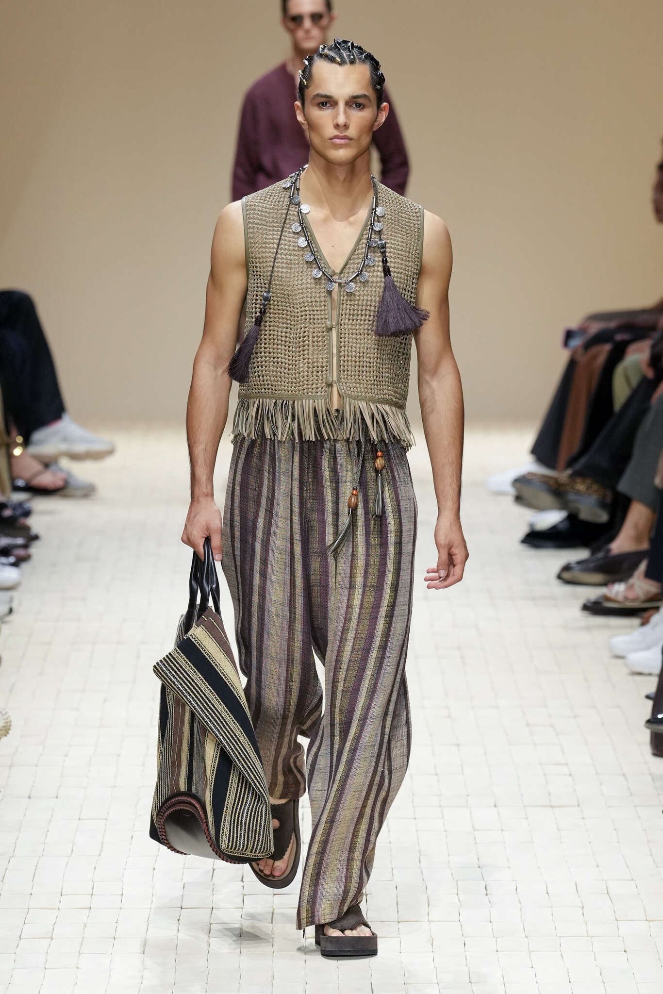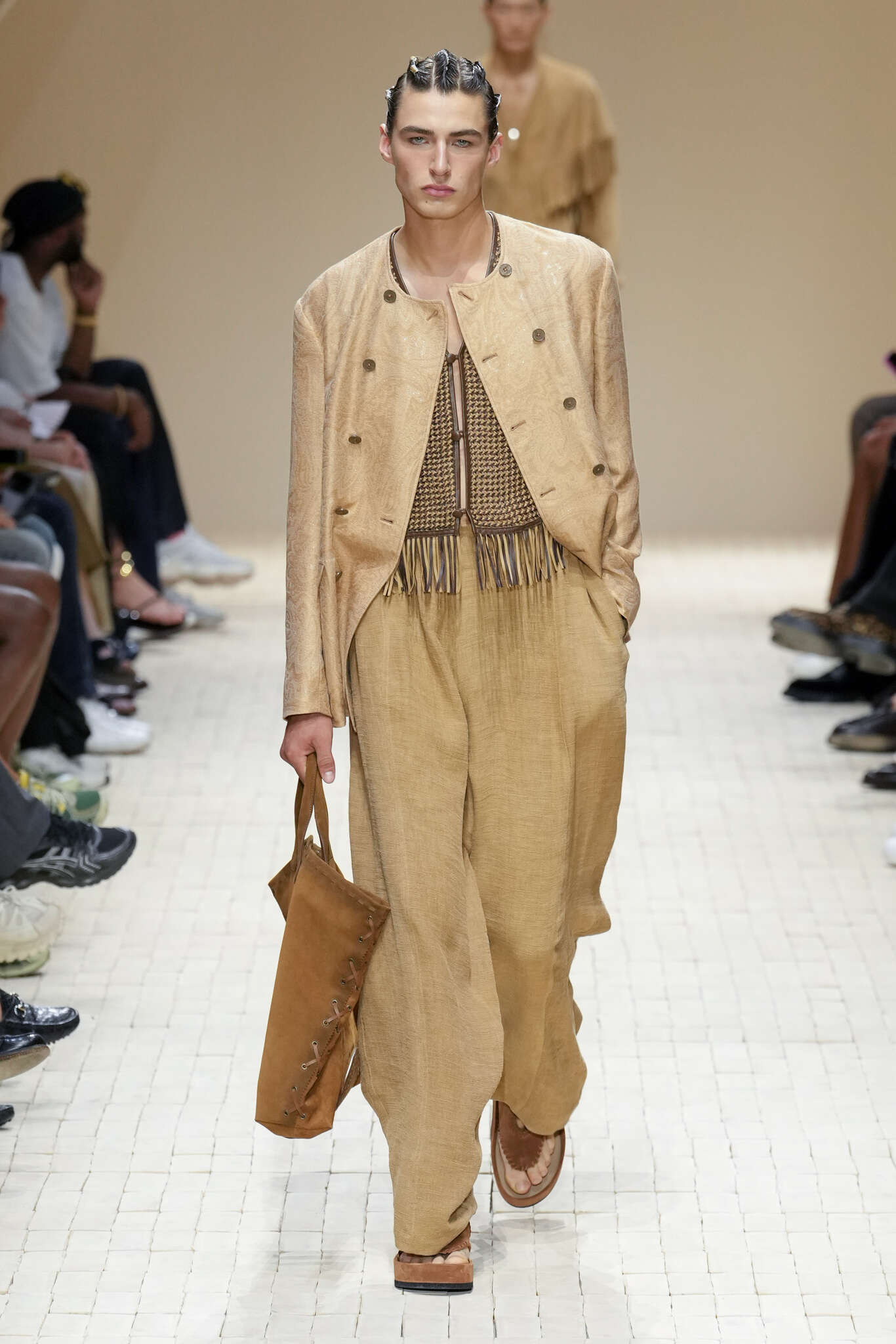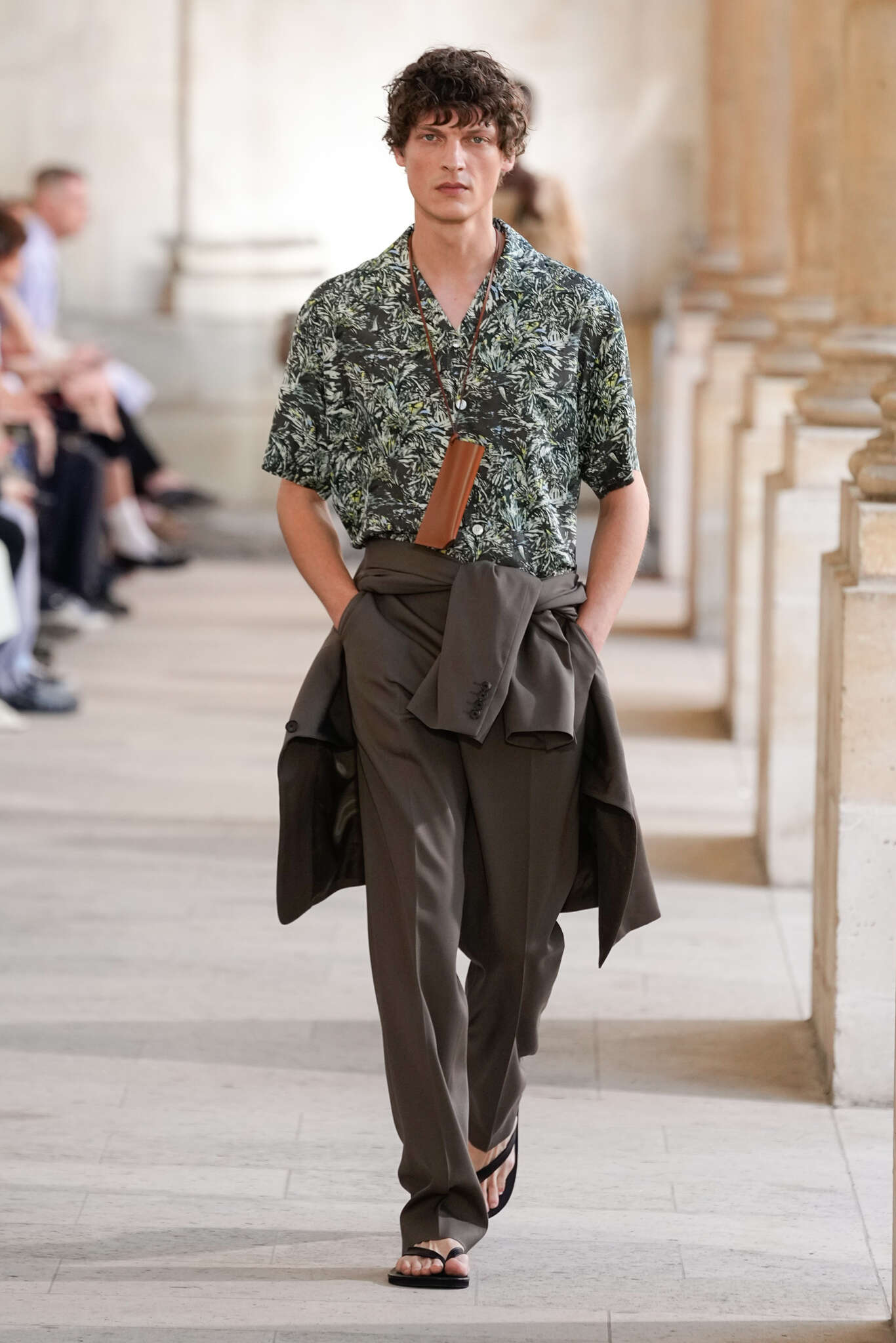 On évoquait un aspect loungewear ci-dessus pour Zegna. Chez D&G, c’est carrément le thème central de la collection, intitulée « Pyjama Boys ». Bien sûr, il ne s’agit pas de simples pyjamas. Les tissus sont ornés, brodés, décorés, rappelant ce que font certaines marques indiennes à l’aide d’artisanats traditionnels. Conformément à leur goût typique pour l’opulence et le glamour, D&G complètent les ensembles par de la fourrure (manteaux, mules), du cuir, des motifs animaliers, et des colliers ostentatoires. En fin de compte, cette collec cherche à brouiller la frontière entre vêtements d’intérieur et d’extérieur, entre l’intime et le public ; cela fonctionne assez naturellement pour certaines tenues ; et, quand cela échoue, le pyjama y gagne tout de même en charisme et raffinement.