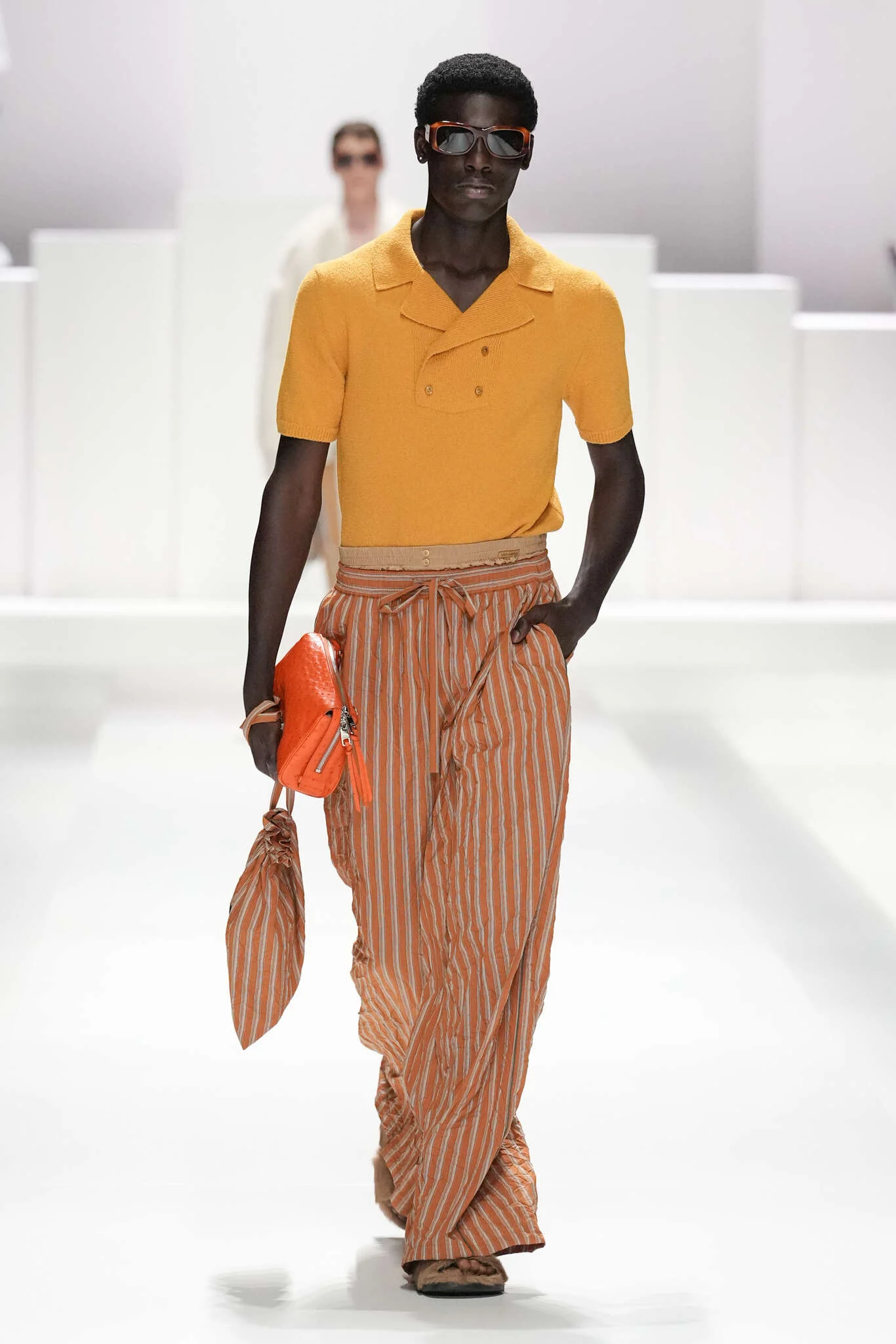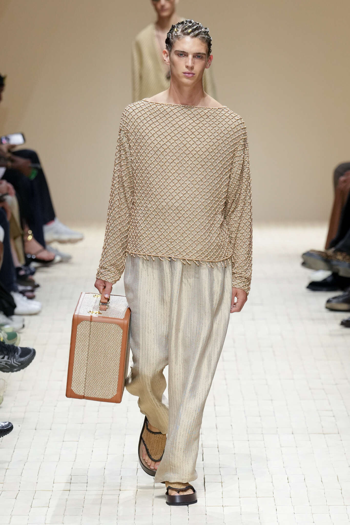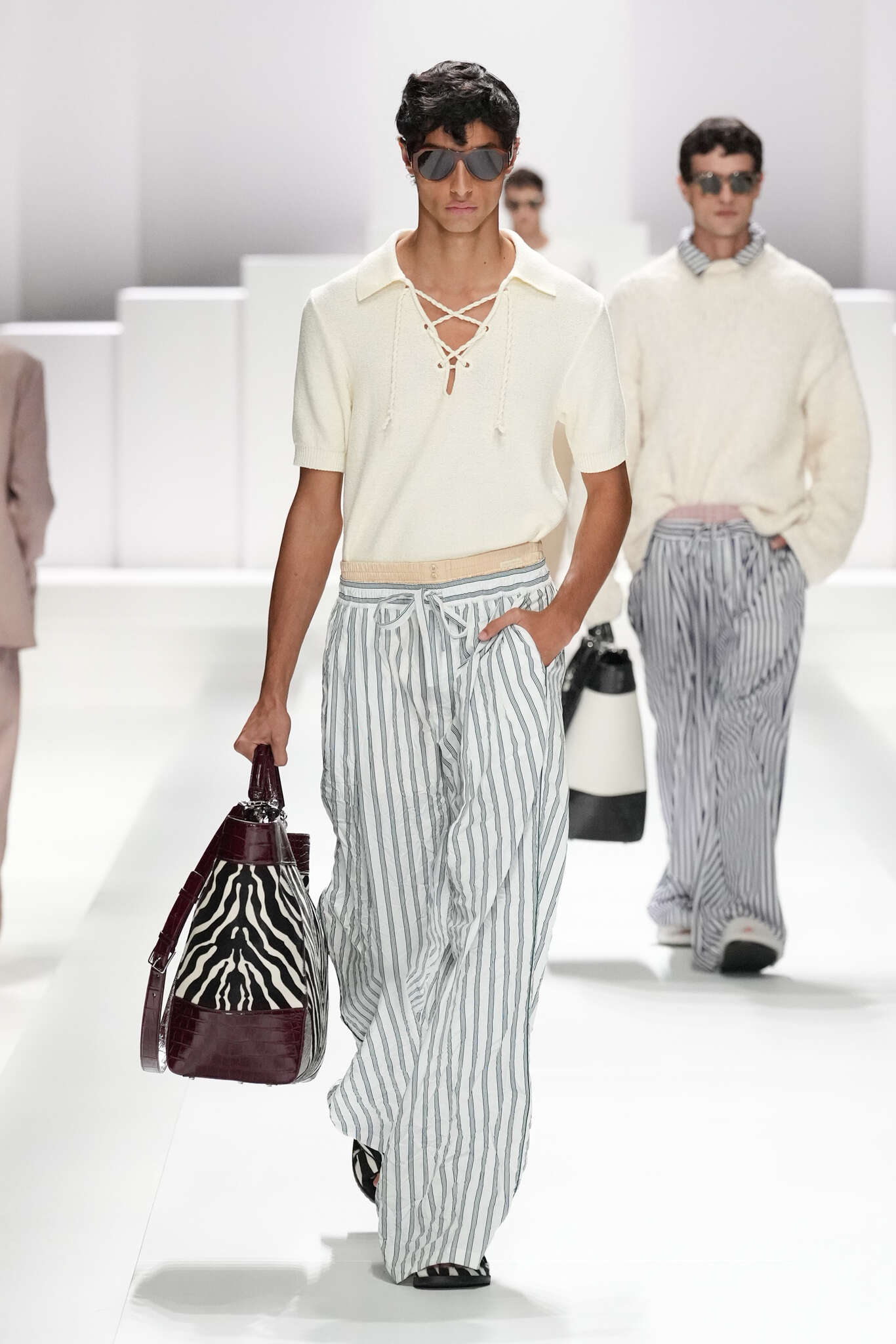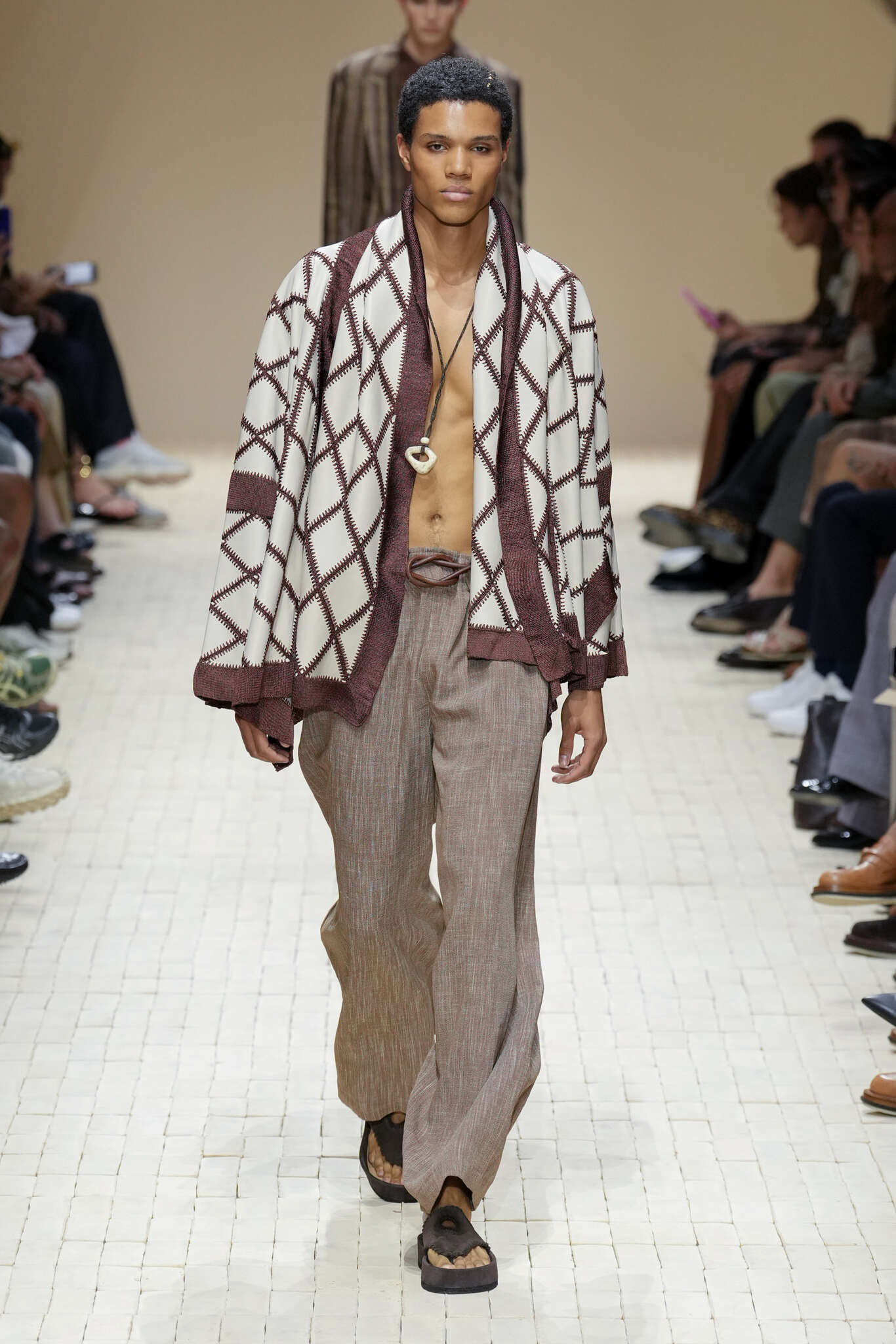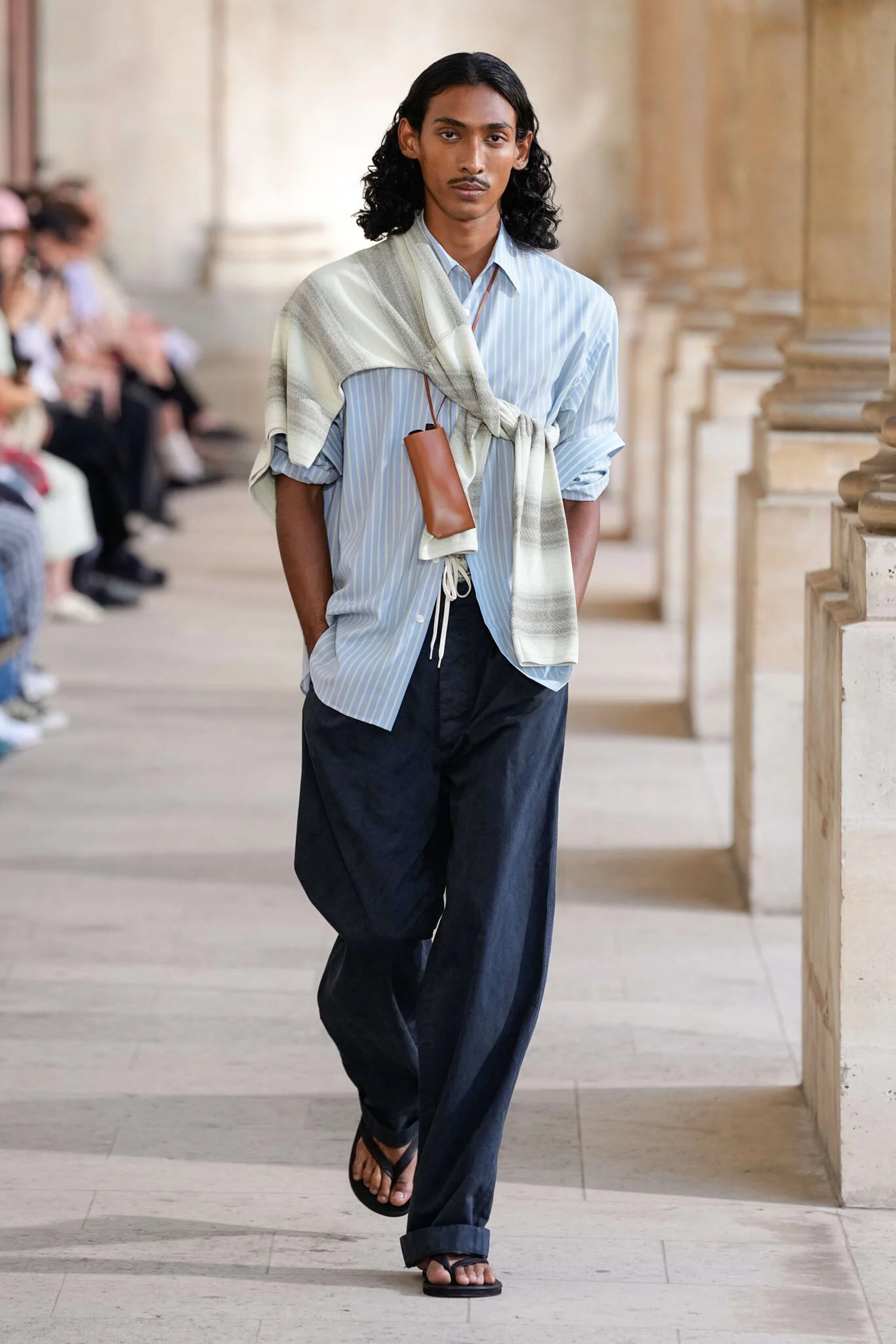 On évoquait un aspect loungewear ci-dessus pour Zegna. Chez D&G, c’est carrément le thème central de la collection, intitulée « Pyjama Boys ». Bien sûr, il ne s’agit pas de simples pyjamas. Les tissus sont ornés, brodés, décorés, rappelant ce que font certaines marques indiennes à l’aide d’artisanats traditionnels. Conformément à leur goût typique pour l’opulence et le glamour, D&G complètent les ensembles par de la fourrure (manteaux, mules), du cuir, des motifs animaliers, et des colliers ostentatoires. En fin de compte, cette collec cherche à brouiller la frontière entre vêtements d’intérieur et d’extérieur, entre l’intime et le public ; cela fonctionne assez naturellement pour certaines tenues ; et, quand cela échoue, le pyjama y gagne tout de même en charisme et raffinement.