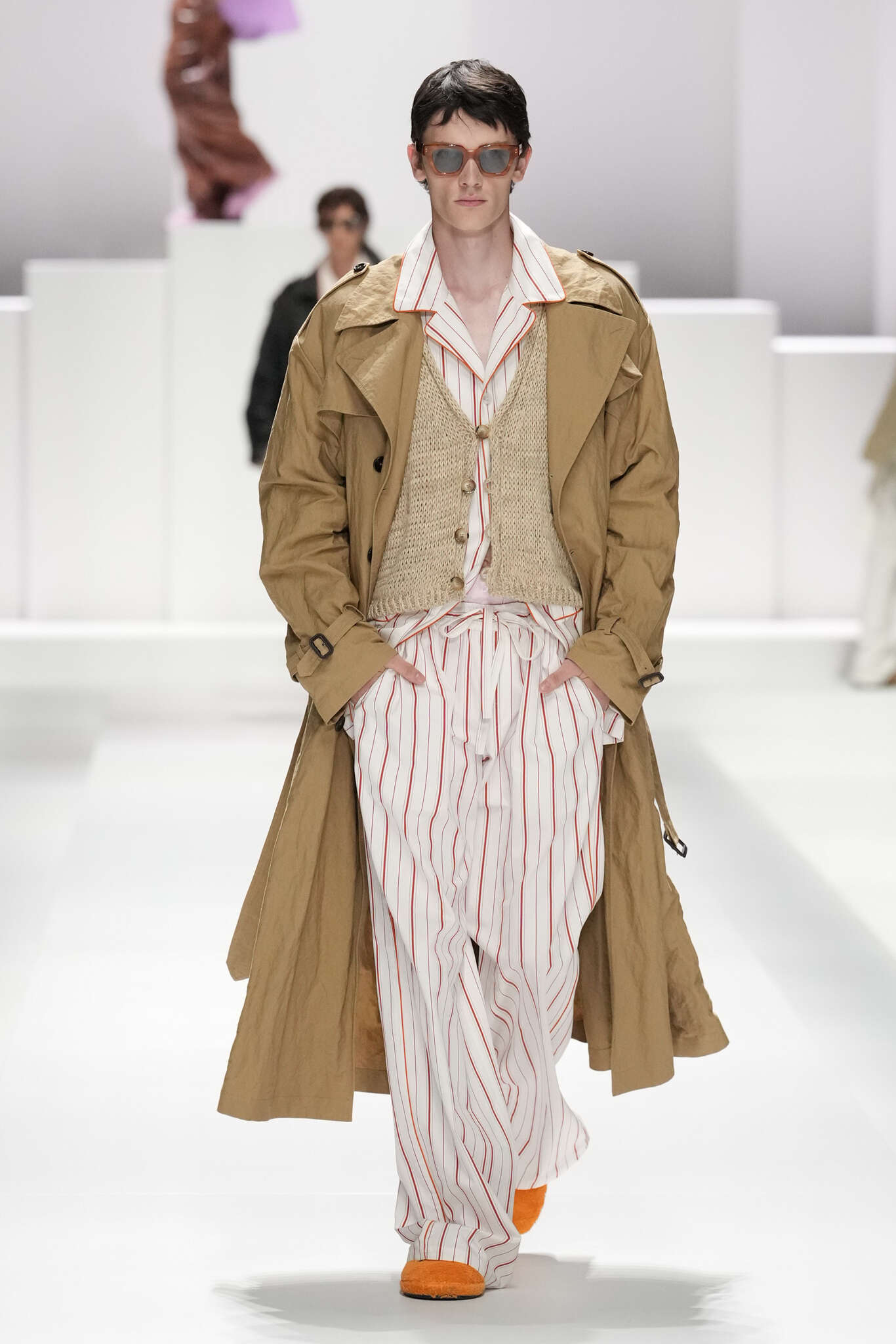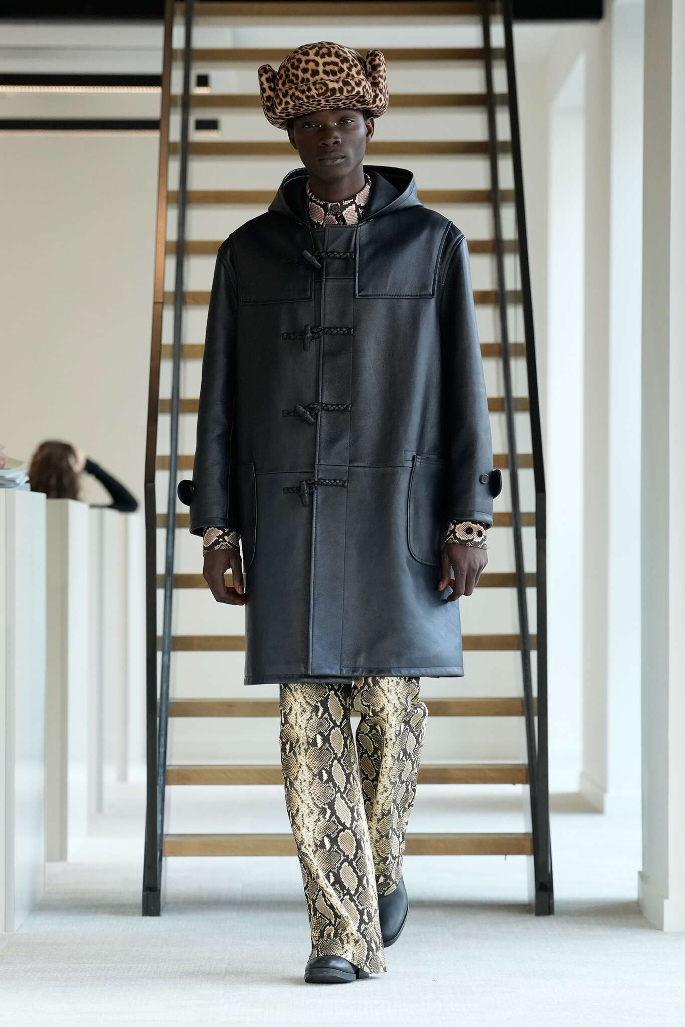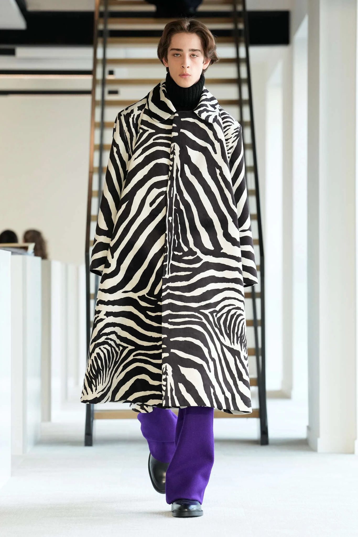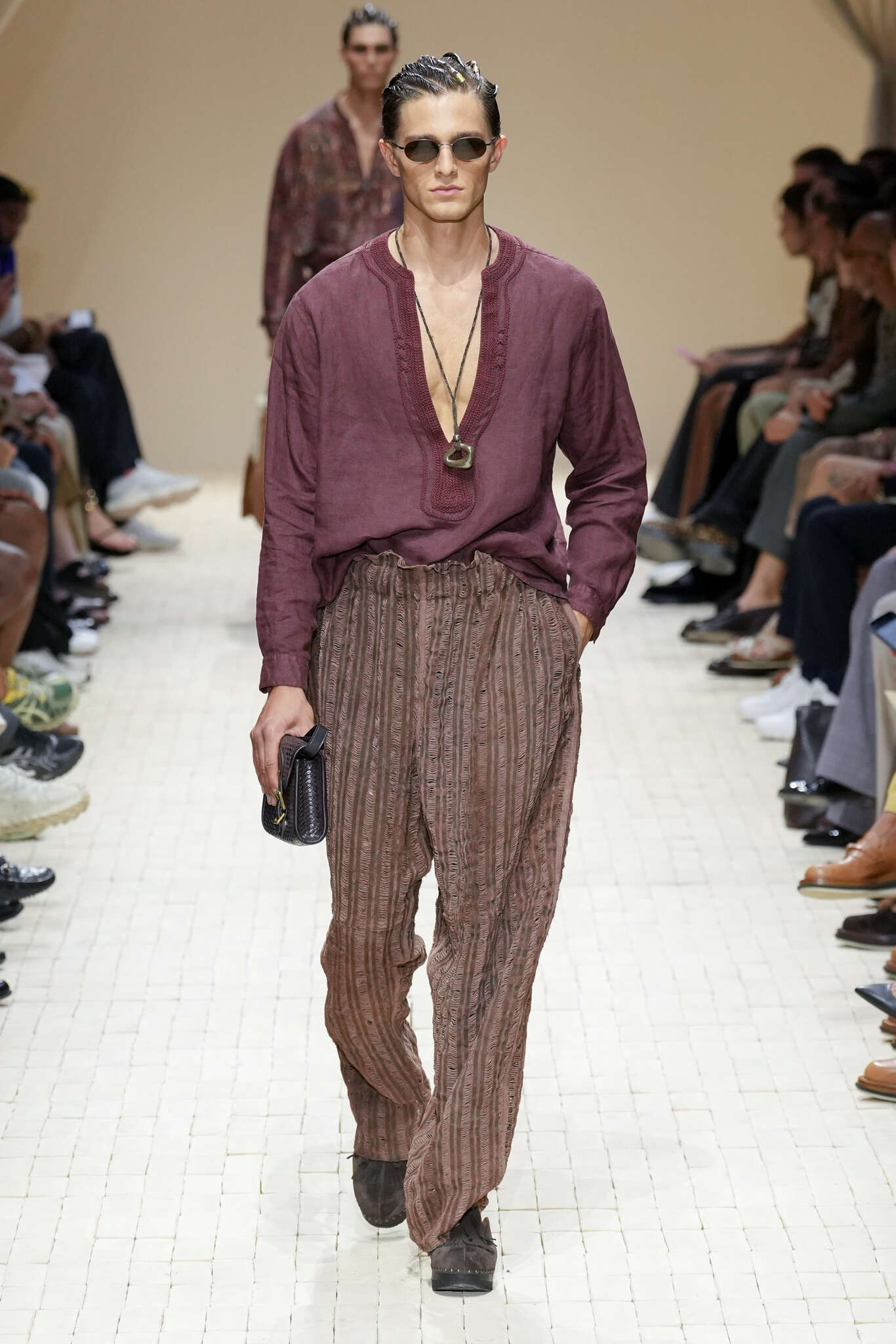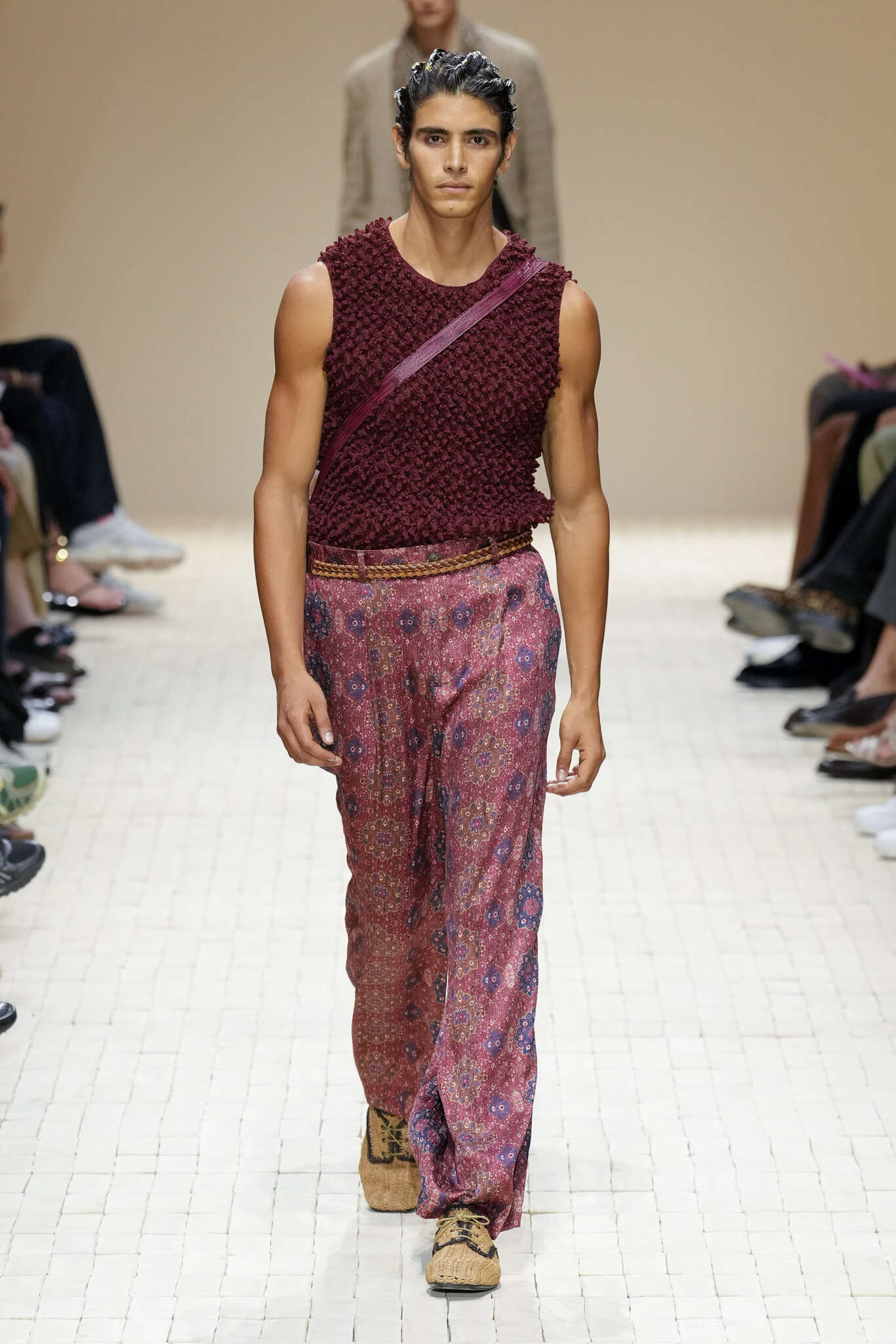 On évoquait un aspect loungewear ci-dessus pour Zegna. Chez D&G, c’est carrément le thème central de la collection, intitulée « Pyjama Boys ». Bien sûr, il ne s’agit pas de simples pyjamas. Les tissus sont ornés, brodés, décorés, rappelant ce que font certaines marques indiennes à l’aide d’artisanats traditionnels. Conformément à leur goût typique pour l’opulence et le glamour, D&G complètent les ensembles par de la fourrure (manteaux, mules), du cuir, des motifs animaliers, et des colliers ostentatoires. En fin de compte, cette collec cherche à brouiller la frontière entre vêtements d’intérieur et d’extérieur, entre l’intime et le public ; cela fonctionne assez naturellement pour certaines tenues ; et, quand cela échoue, le pyjama y gagne tout de même en charisme et raffinement.