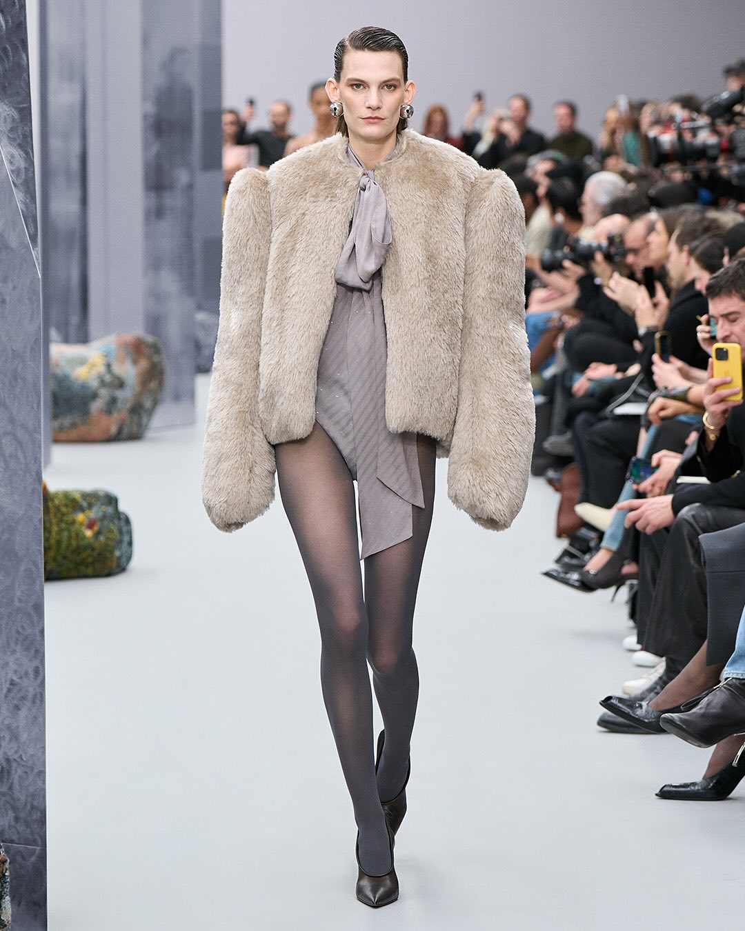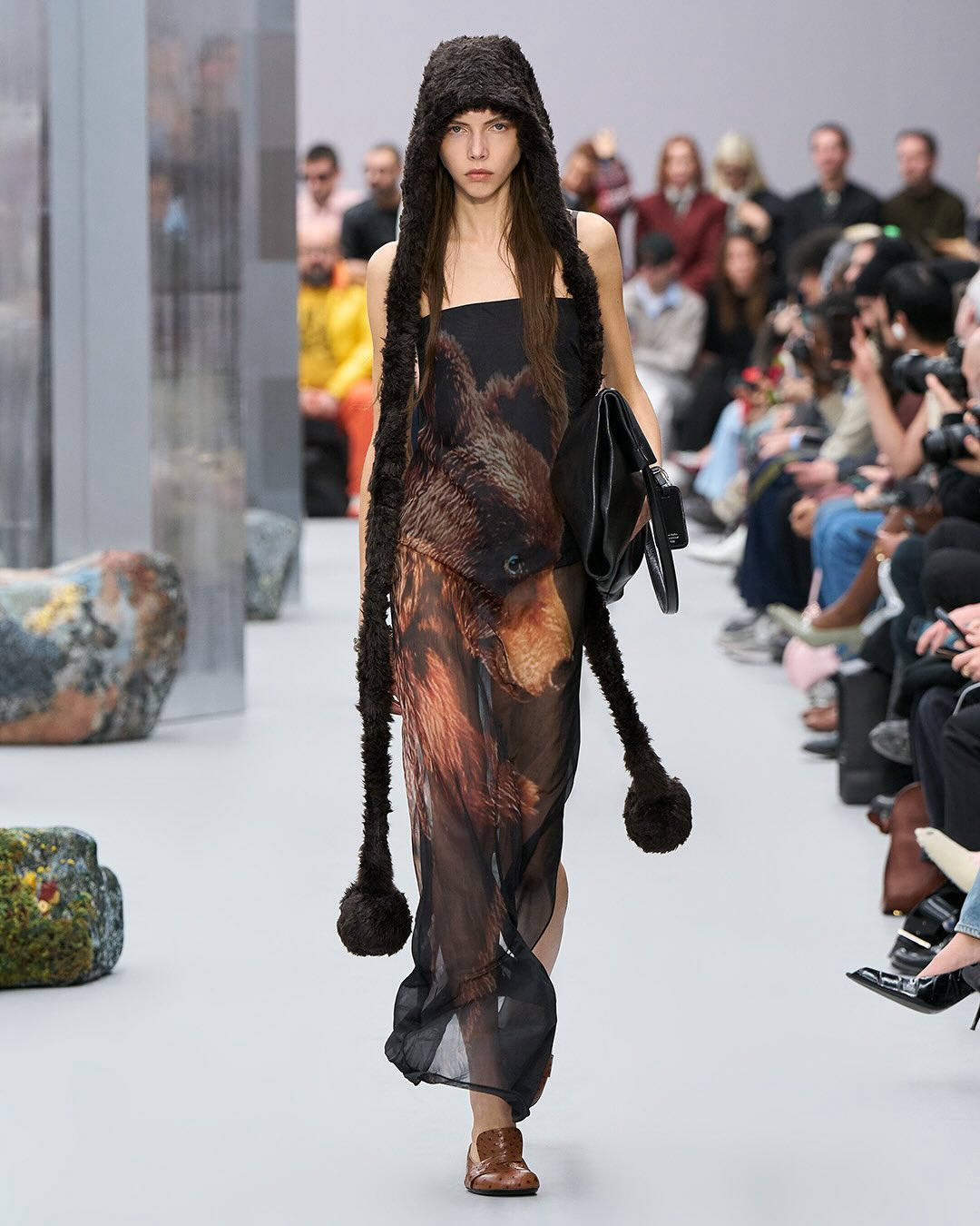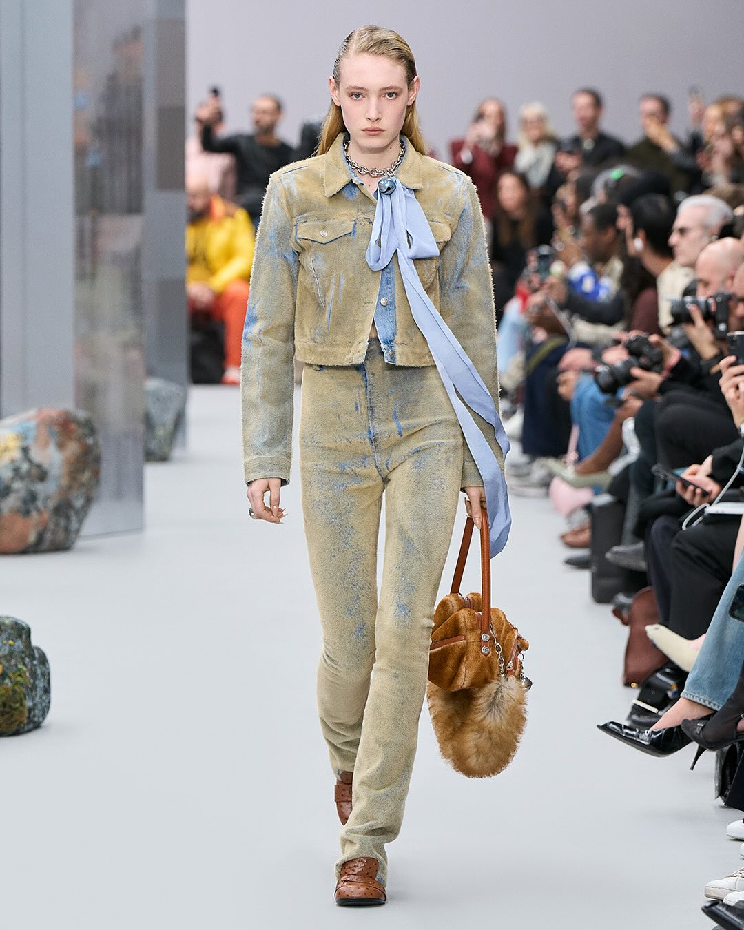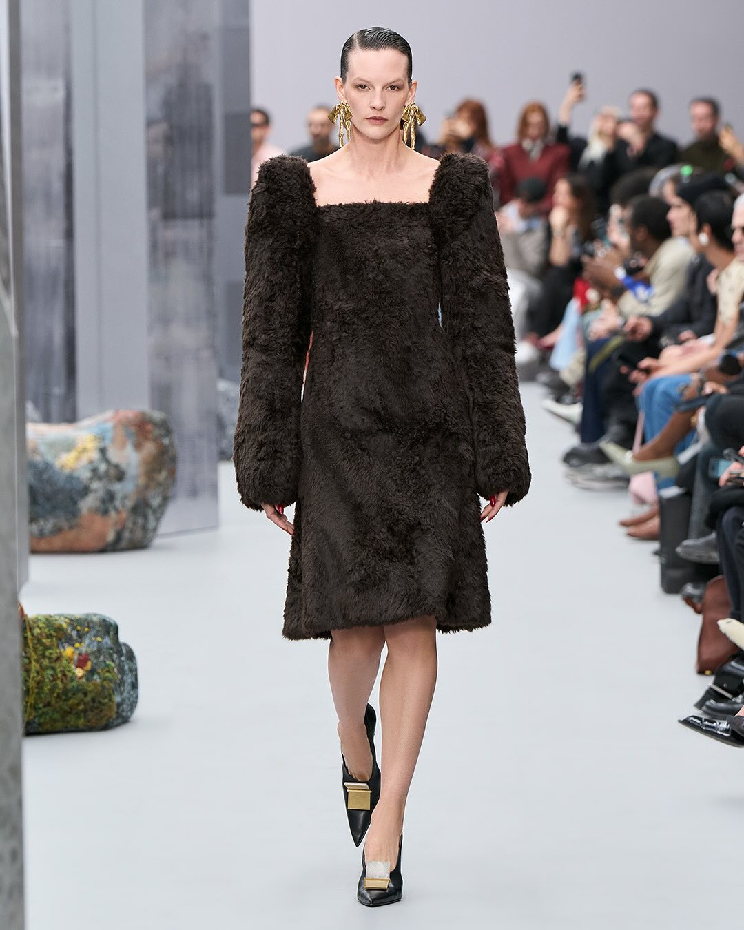 ACNE femme FW2025, le retour du mohair et quelques silhouettes qui me font penser au défilés dans les années 80 avec les vestes costumes épaules larges, ici même oversize et d’autres dingueries en fourrure / cuir / transparent. En gros pas mal de diversité, des trucs intéressants et des trucs qui sont clairement juste pour du catwalk. J’ai pas tout mis :