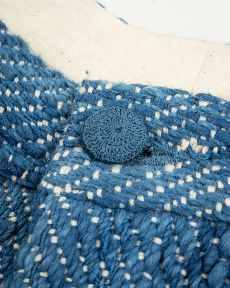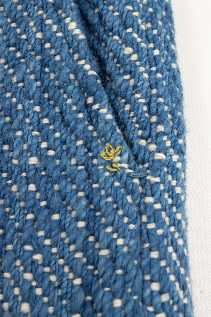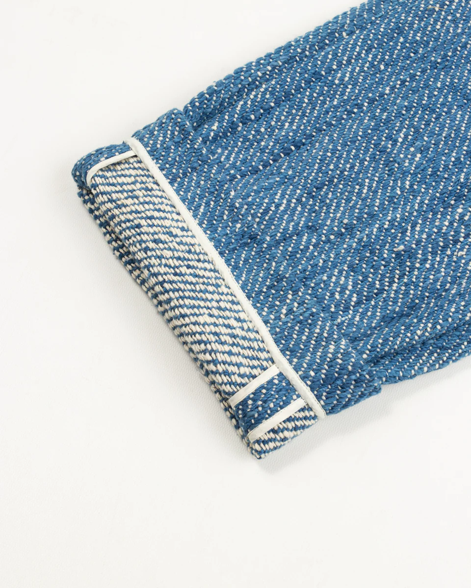 Theyâre made from a thick and chunky cotton twill weave, so thick and loosely woven it feels more adjacent to knitwear than a woven fabric, with a plush and uneven face texture that combines the natural irregularities of the weave with a tonally varied « mid blue » indigo dye. Itâs a very soft fabric, with an airiness to the weave and a lot of pretty substantial neps and quirks throughout its face.