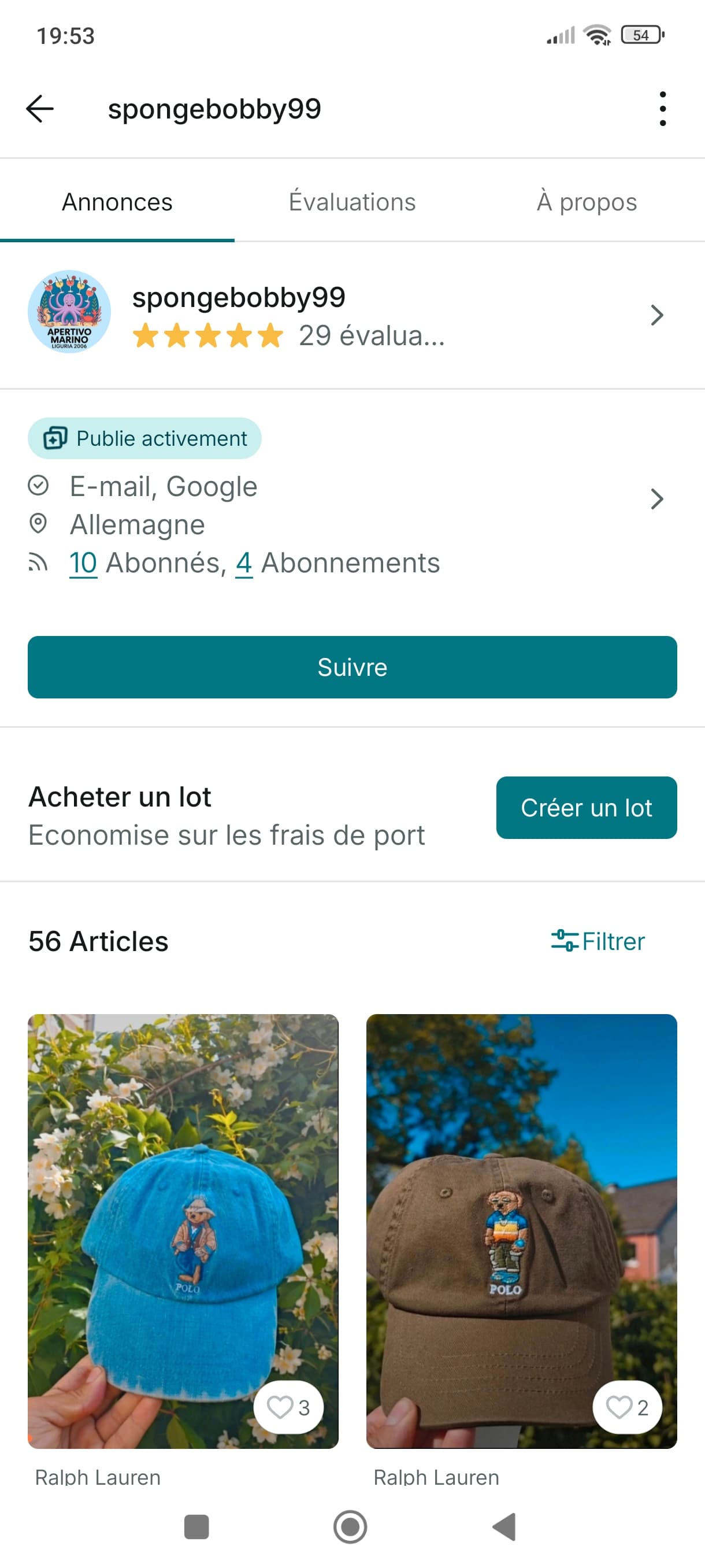 Profil qui vend rĂ©guliĂšrement des casquettes Ralph Lauren neuves, Ă lâinstant T, quatre.