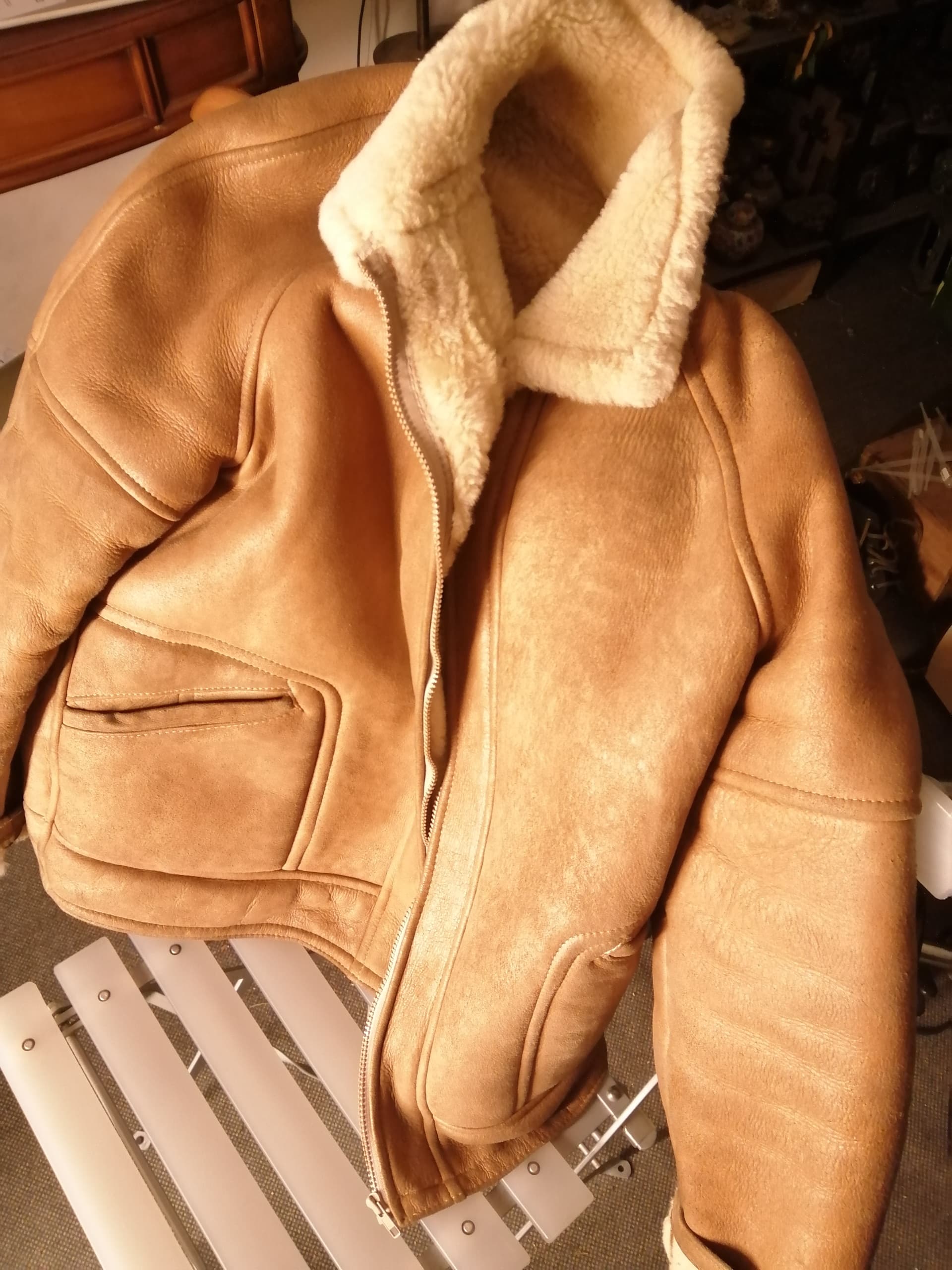 Un blouson en agneau retourné à manches raglan. Je demande le prix au vendeur ; il me répond « 40 euros ».