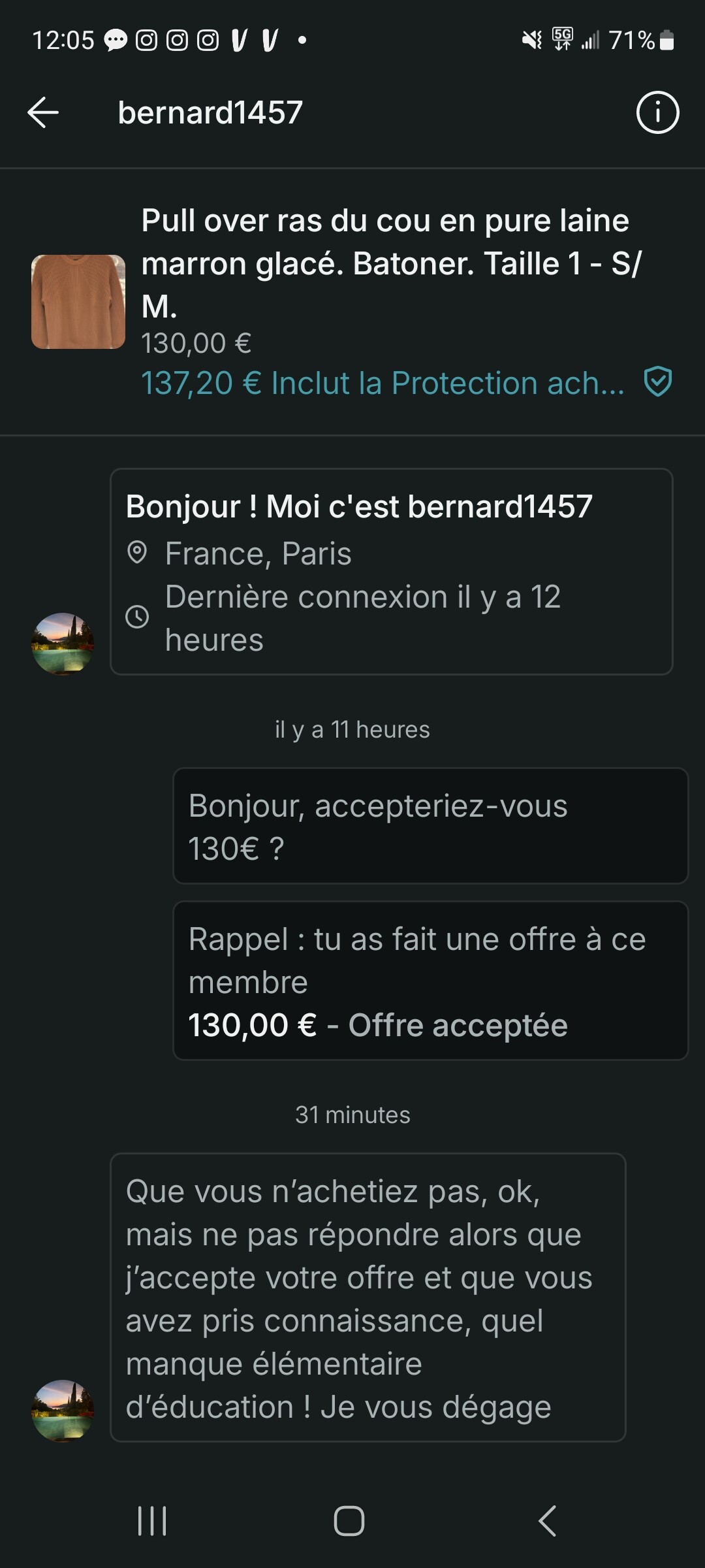 RĂ©cemment sur une sape Ă moi il y a un mec qui mâa fait une offre basse et je lui ai promis de lui vendre dâici la fin de semaine. Il mâa Ă©crit chaque jour « alors câest quand la fin de semaine ? » « donc dimanche sĂ»r ? » des messages avec juste des emojis chaque jour⊠le jour J Ă©videmment je tiens ma parole et le mec disparaĂźt de la circulation aprĂšs me les avoir brisĂ© chaque jour de la semaine pour son offre. CâĂ©tait mĂȘme pas un gosse.