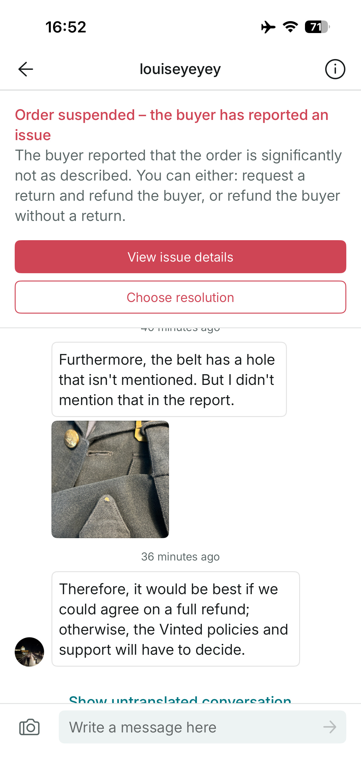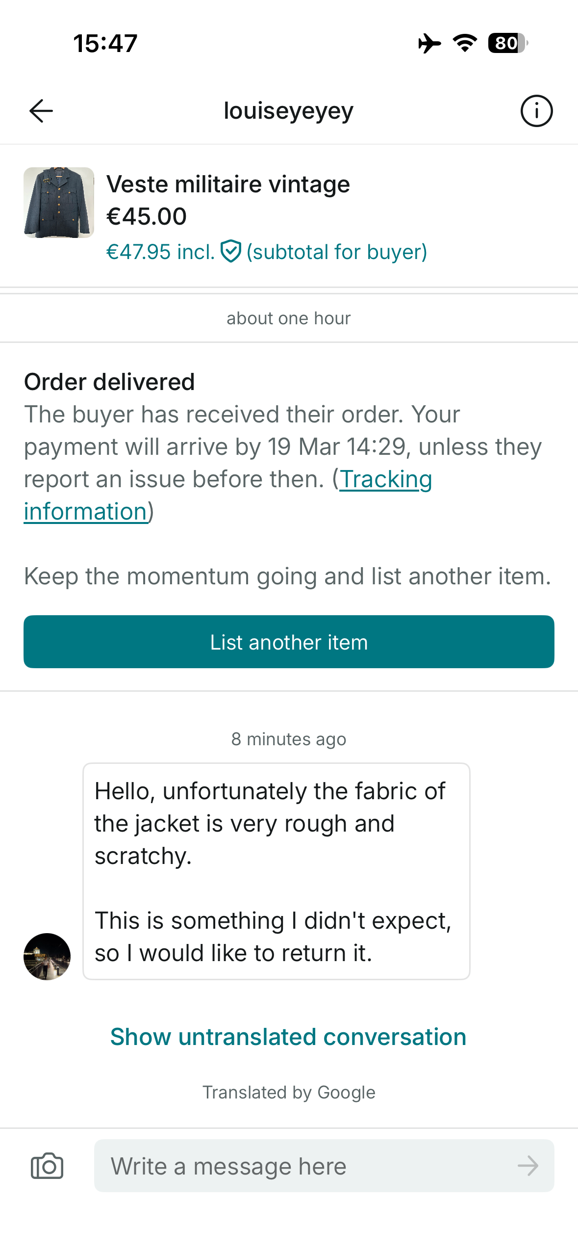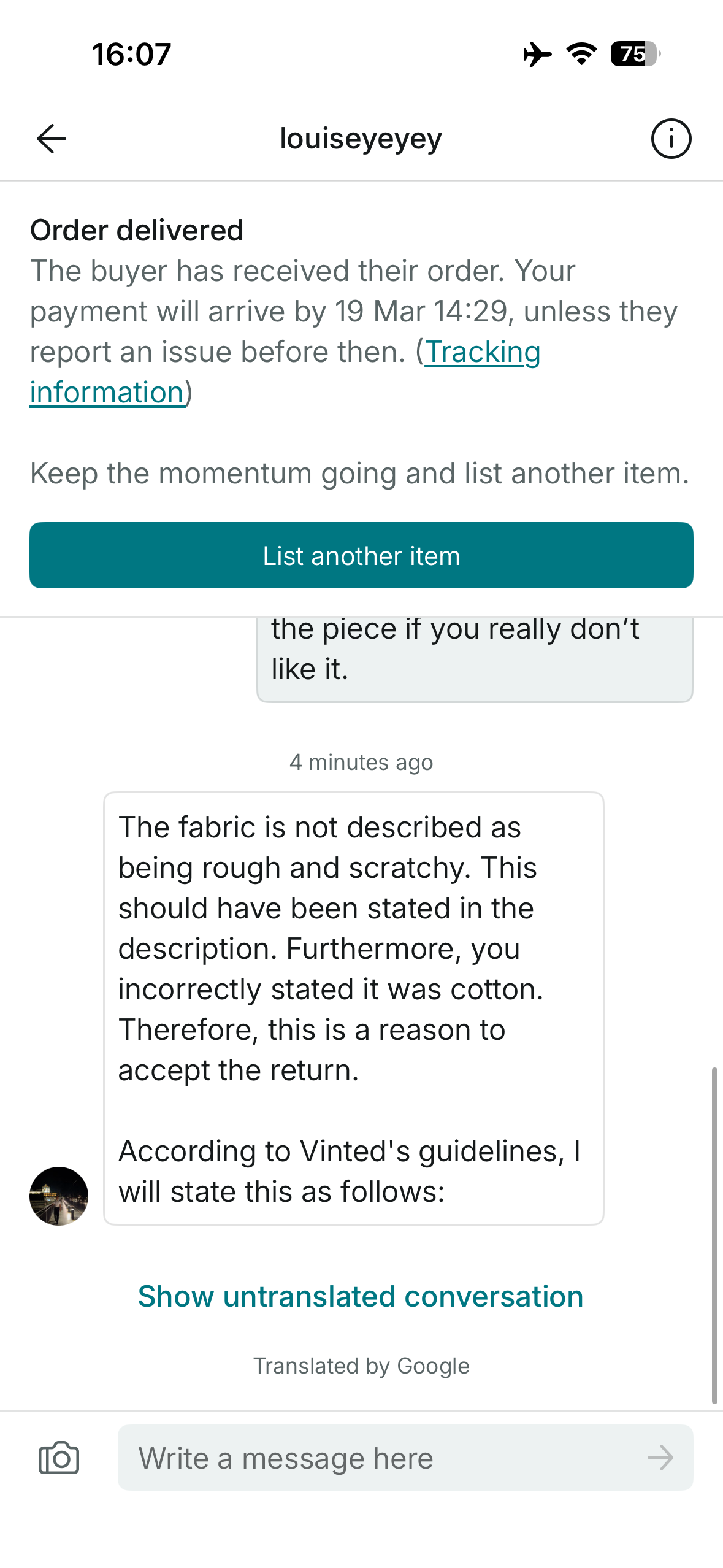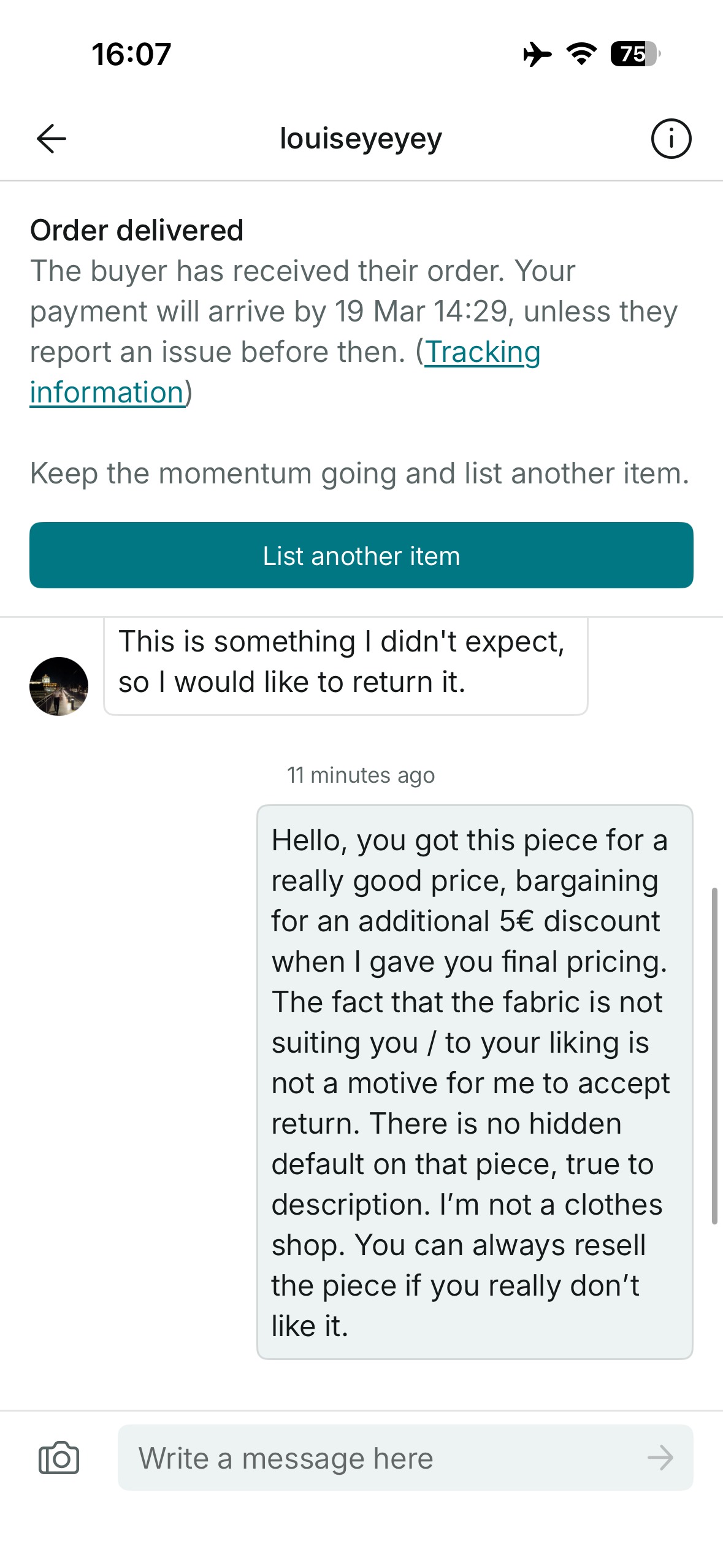 Bonsoir, jâai un cas sur Vinted. Je me permets de publier le dĂ©tail de la conversation. Jâai lâimpression dâĂȘtre dans mon bon droit quant Ă ne pas accepter le retour. Je nâai Ă©galement pas chercher Ă duper lâacheteur Ă aucun moment. Je mâen remets Ă vos avis. Et comme par hasard lâacheteur a ouvert un litige suite au fait que je nâacceptais pas de retourner lâarticle.