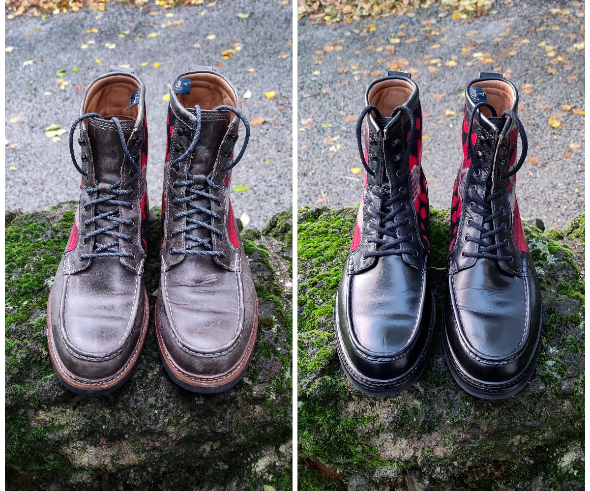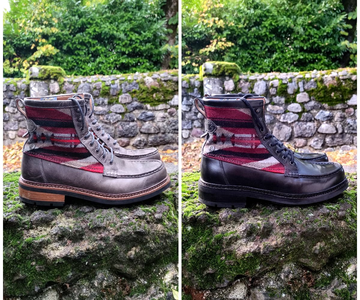 La couleur d’origine était un gris meh, peu polyvalent, et je trouvais l’ensemble trop brouillon, avec une surcharge d’infos visuelles : le cuir gris patiné/pull up + les empiècements en laine + les multiples coutures contrastées + la trépointe et les intercalaires du talon eux aussi contrastés + les lacets bicolores.