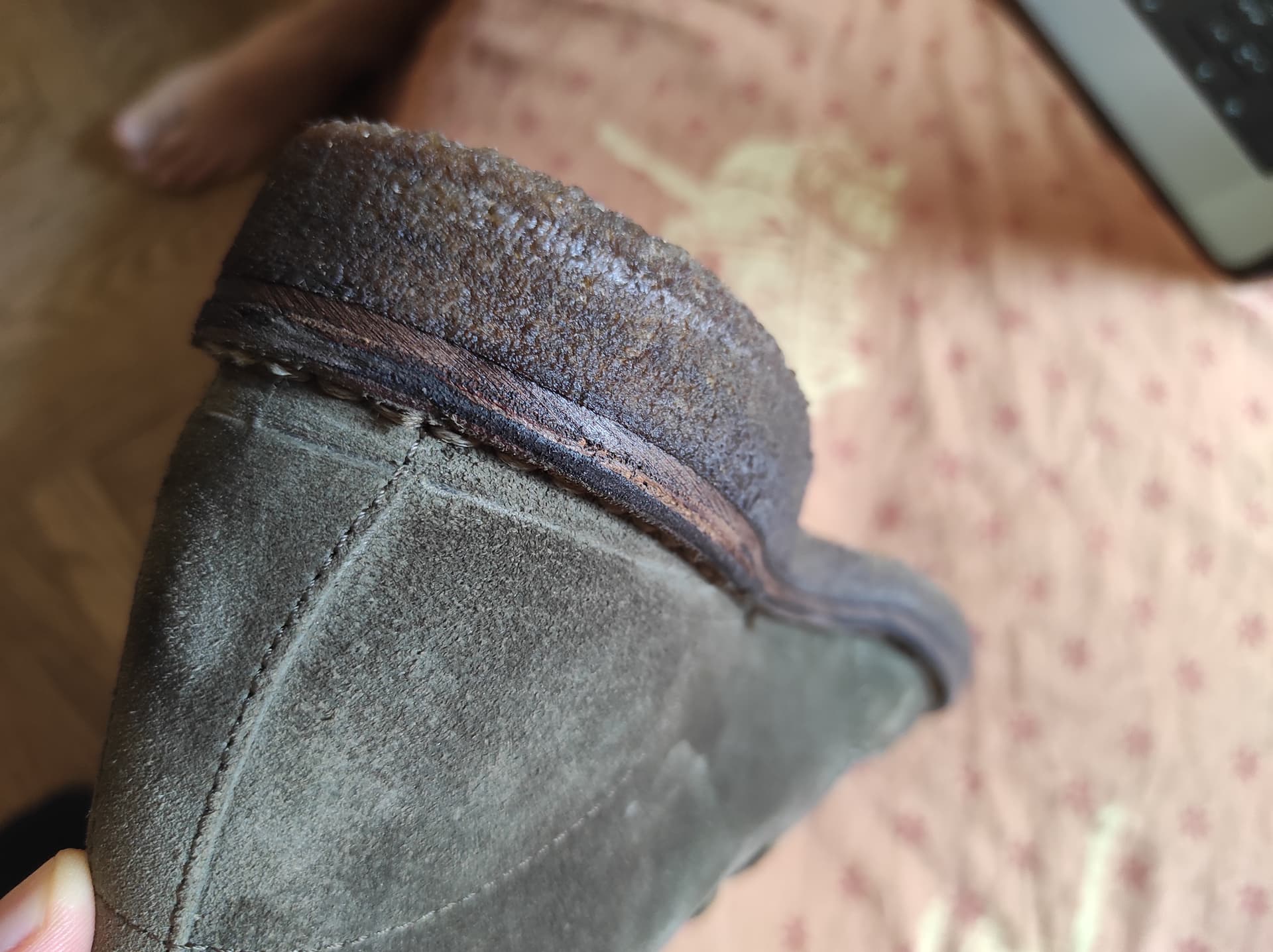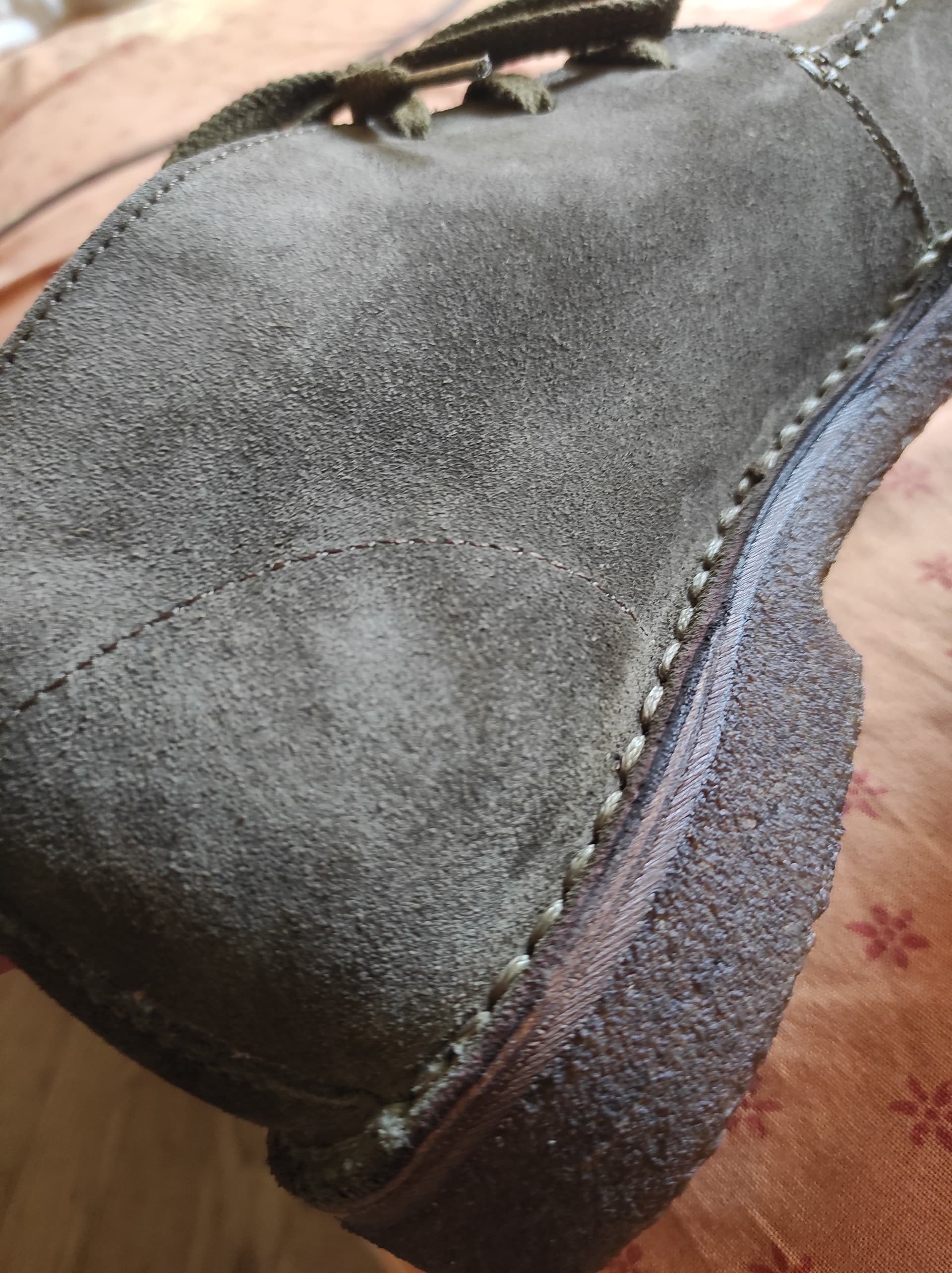 Sur une bonne partie de la chaussure, en bas, le cuir a été comme creusé. Ce n’est pas un effet du suédé, ça fait un bon creux :