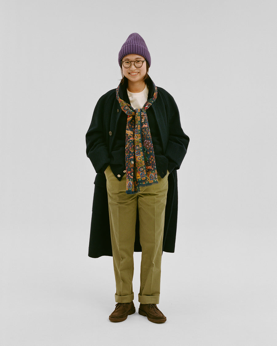 Le même look, manteau fermé et écharpe nouée autour, c’est un banger. La sobriété du manteau + association olive du pantalon + bonnet violet, rappel de couleur dans l’écharpe ![]()