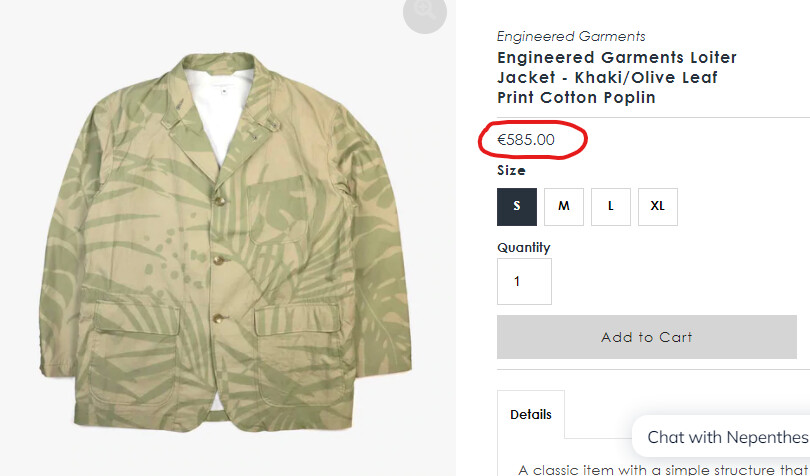 Bah là l’exemple de @SimonTheDuck est intéressant. Si je dis pas de conneries il en a déjà une vert olive, « classique », qui chiffre a 380€ cette saison chez rendez vous. Alors ok tu peux craquer pour le nouveau print de la saison, mais bon, ça reste une veste olive, ça fait un peu double emploi dans un dressing, alors quand en plus tu sais que tu dois rajouter 200€…