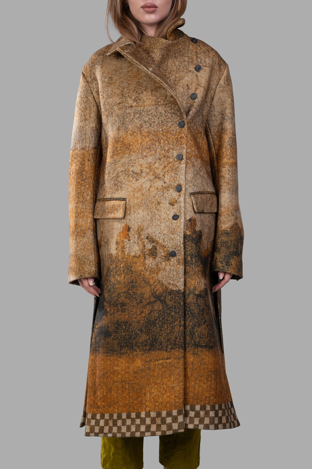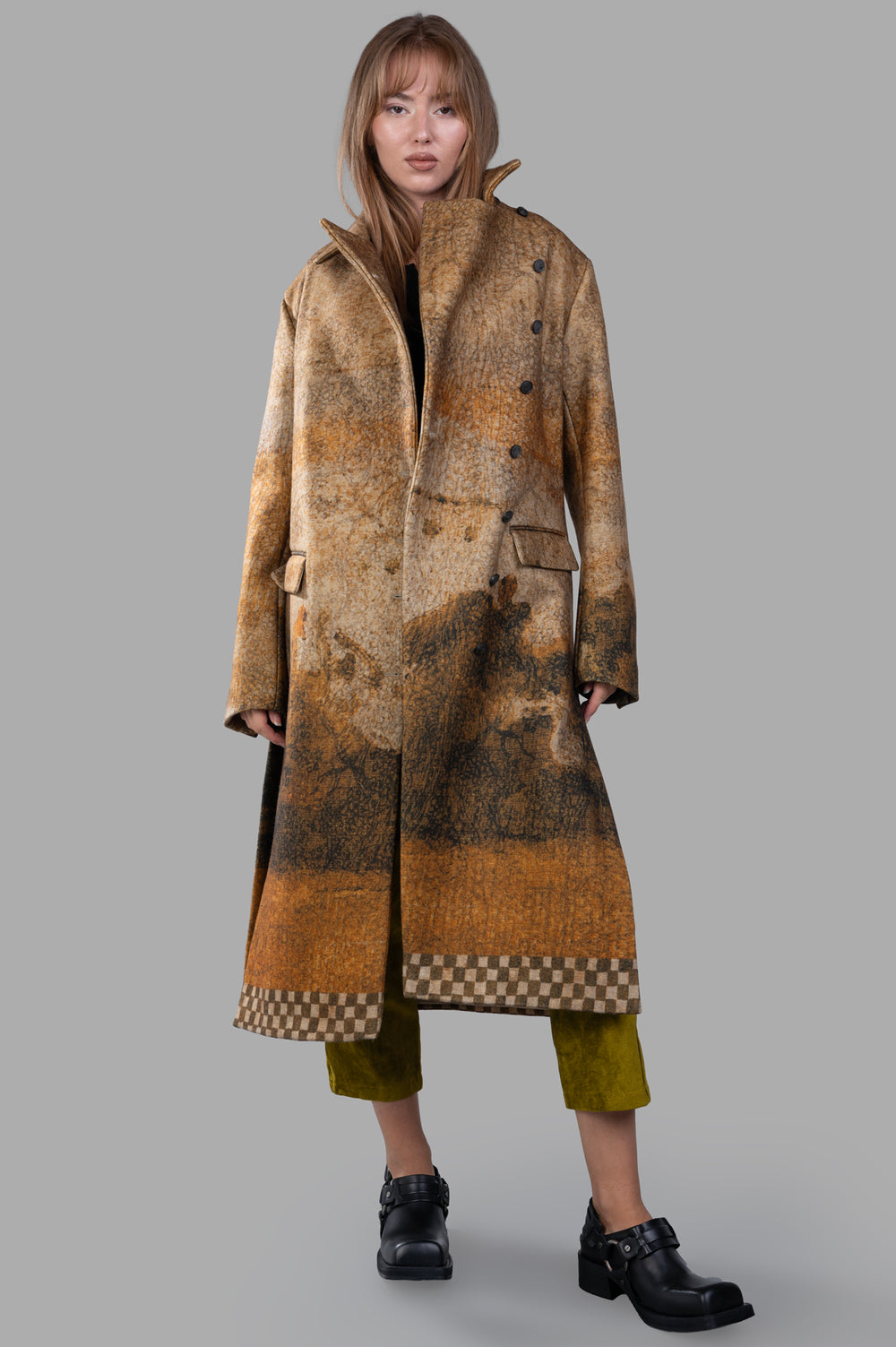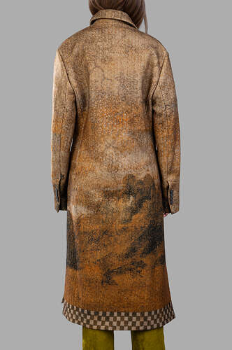 Le manteau en vrai est trop beau aussi, la matière est légèrement brillante et ne fait pas plastique (alors qu’il y en a 23%). L’imprimé n’est pas baveux flou, alors que ça pourrait l’être sur une matière texturée comme la laine. les couleurs sont profondes et pas ternes comme à leur habitude. Les boutons ont des machins métalliques en-dessous. L’intérieur a un beau tissu comme mon manteau Uma Wang, et c’est propre.
