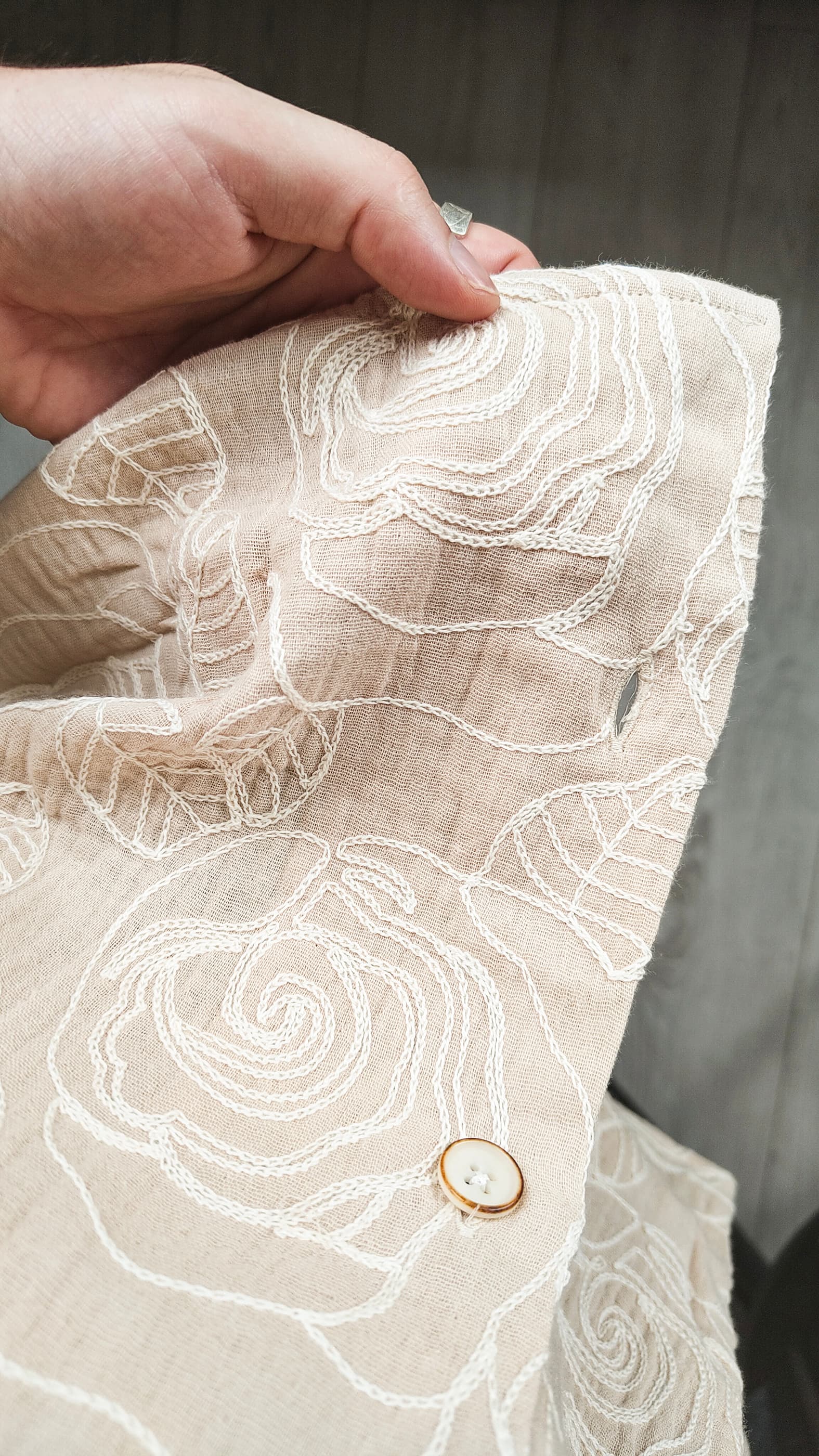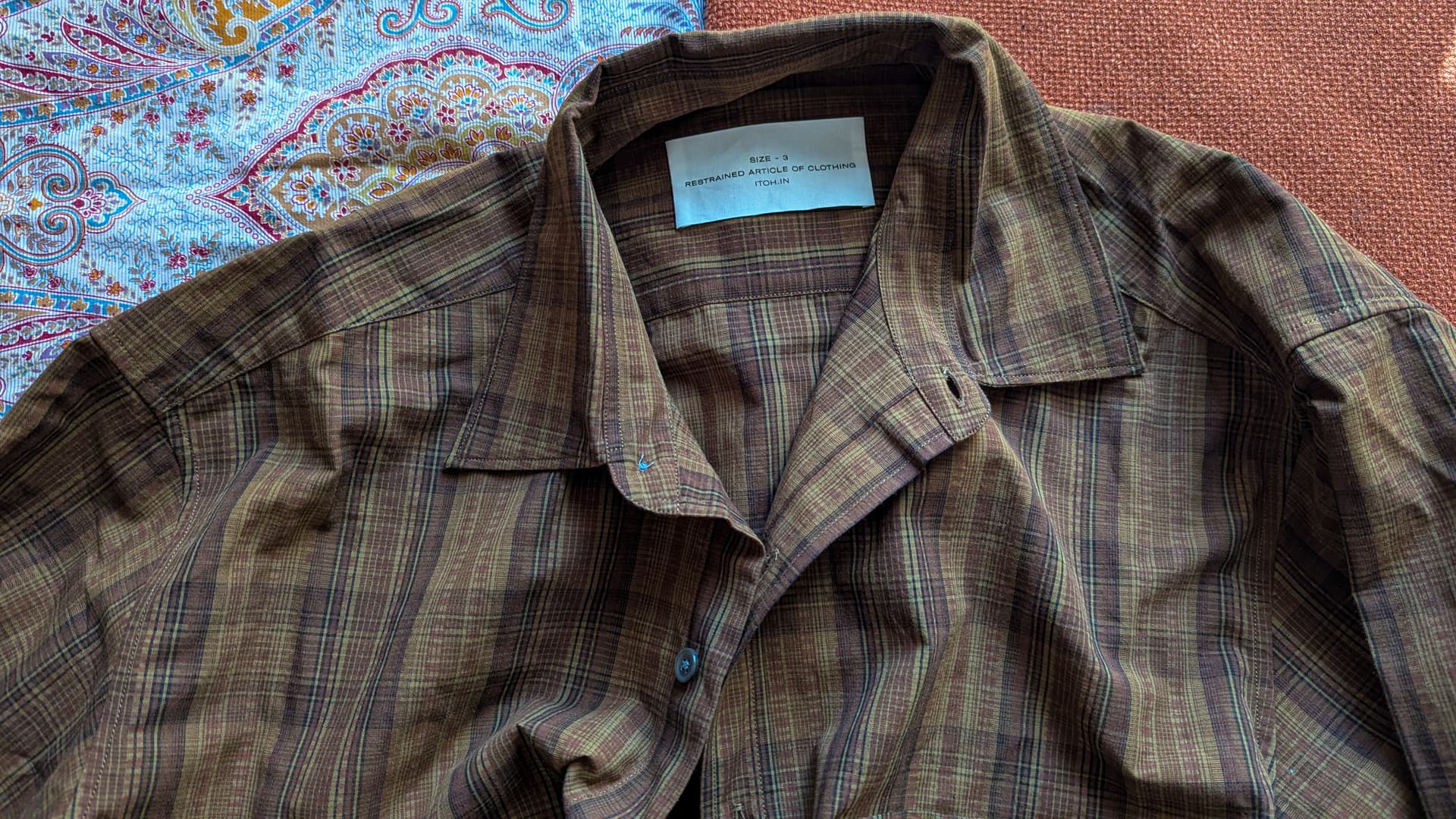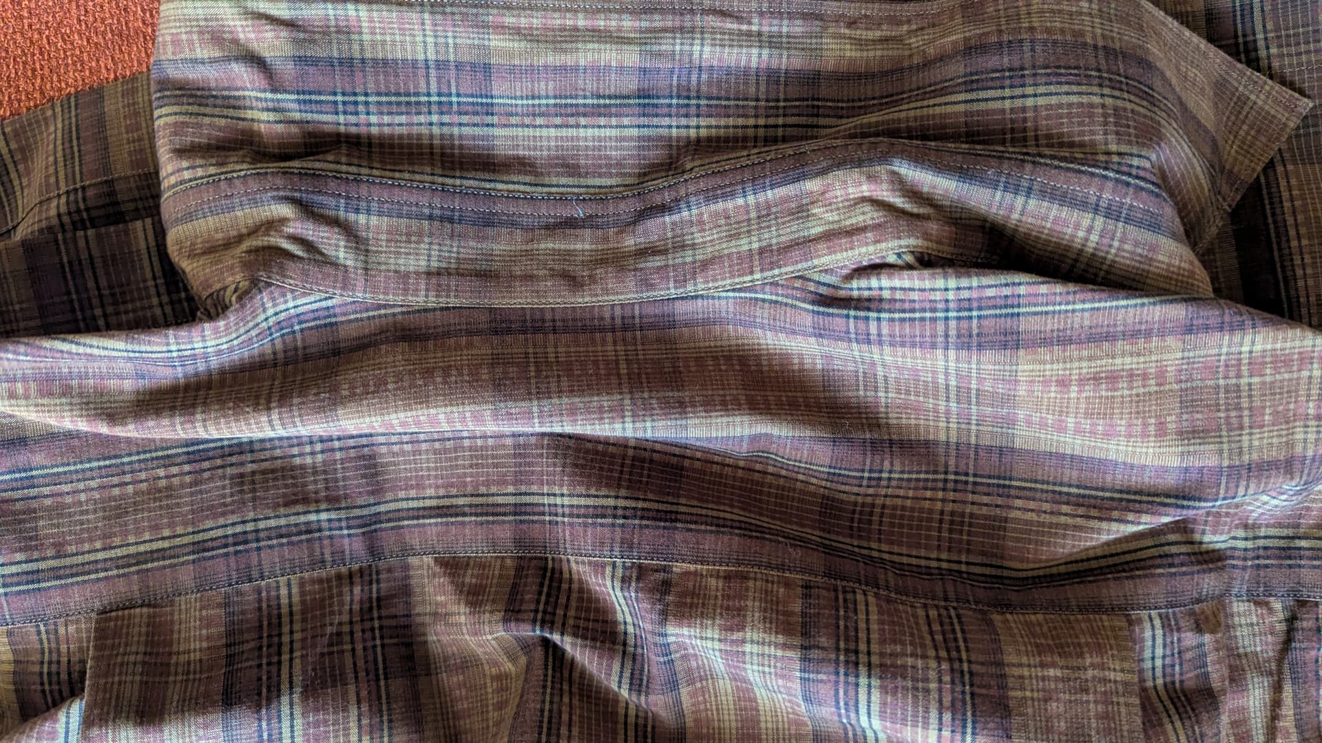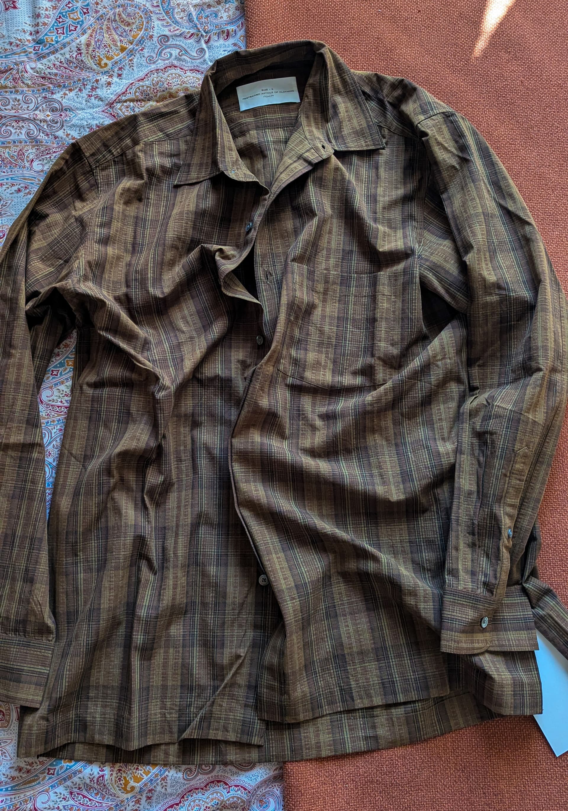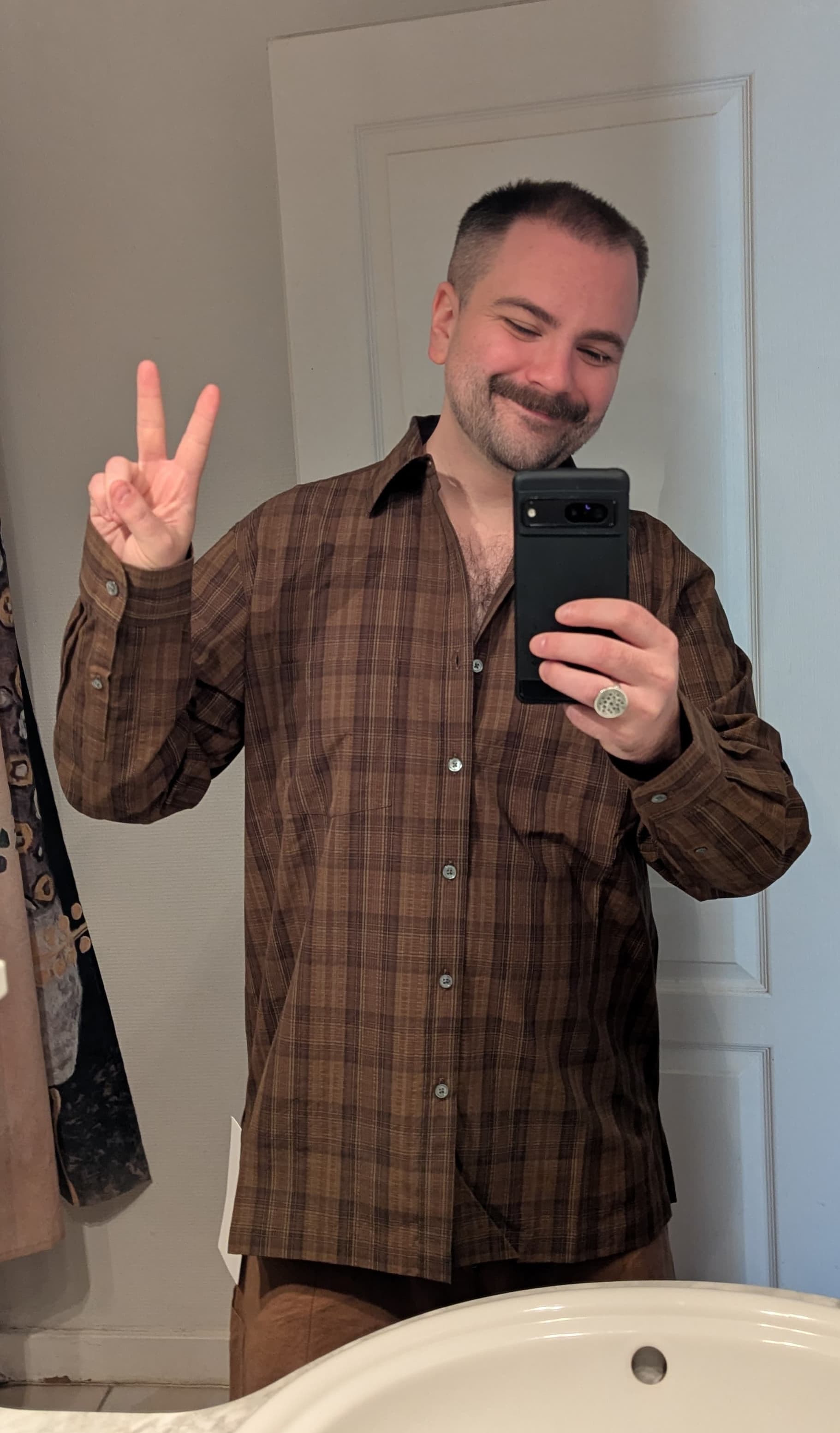 Je ferais une meilleur fit pic une fois les manches retouchées et surtout ailleurs que dans mon couloir mais je suis super content. D’ailleurs je ne m’attendais pas à ça pour la matière. On est sur une sorte de gaze de coton super agréable à porter et respirant, parfait pour l’été :