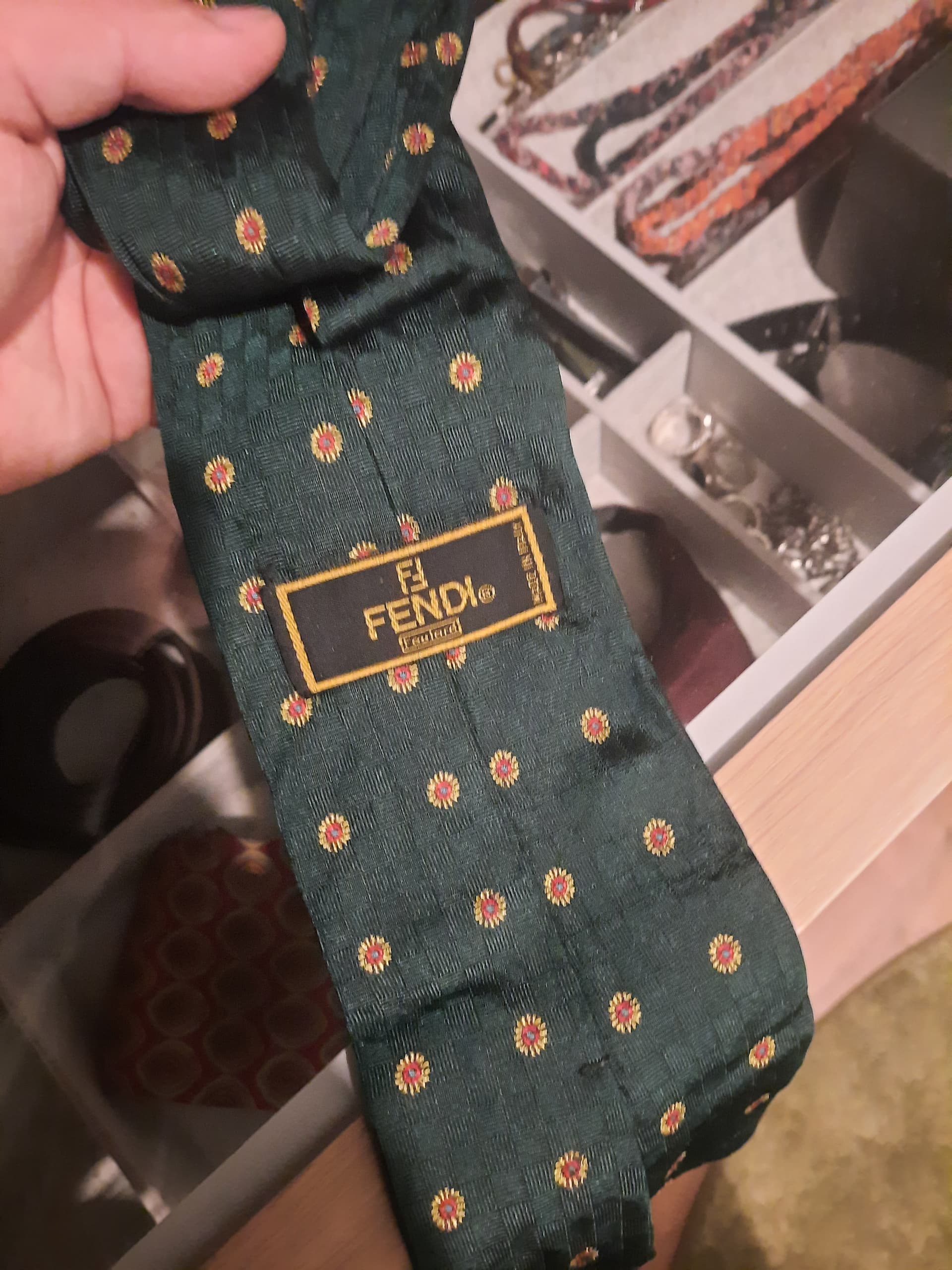 Pour la cravate, jâavais topĂ© cette Fendi vintage sur Vinted pour 20 balles, 100% soie, ça a bien fait le job. Elle est bien verte, la lumiere ne lui rend pas hommageâŠ