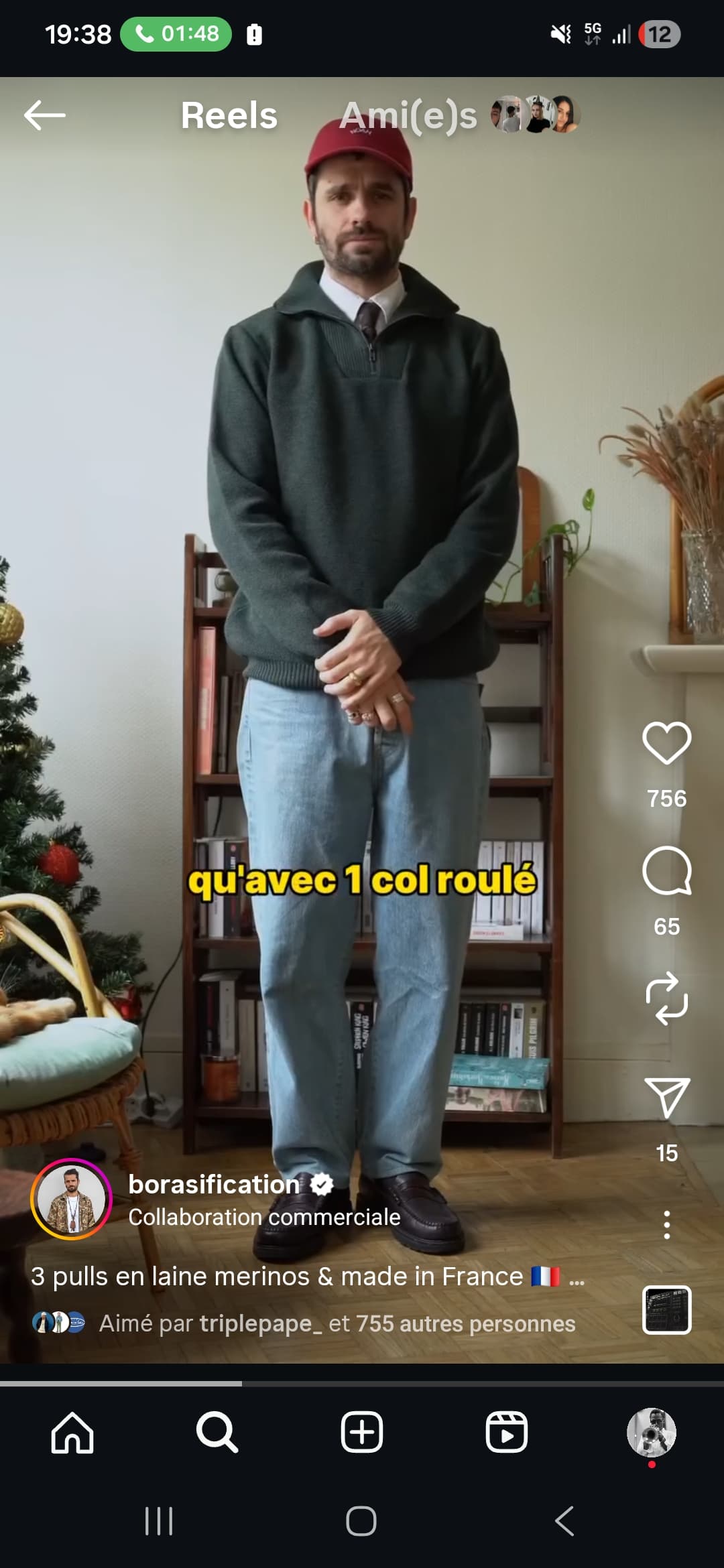 - pull vert sapin, cravate bordeaux sur chemise blanche, jean brut, mocassins aubergine.