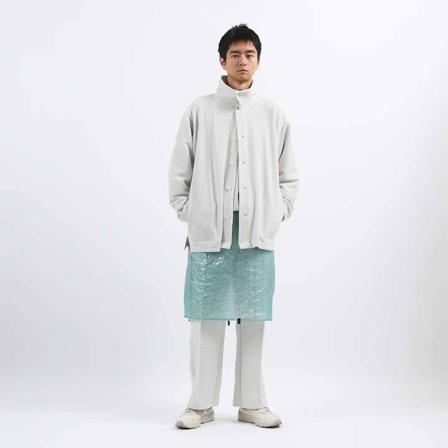 Prenez les pantalons, par exemple. Presque chaque modĂšle est cropped et ajustable, ce qui permet Ă ceux qui les portent de choisir entre des silhouettes larges ou effilĂ©es. La collection revisite Ă©galement lâengagement de Jan-Jan en faveur de lâartisanat. Une fois de plus, nous voyons de la soie Eri tissĂ©e Ă la main en Inde - une soie durable qui permet au papillon de sortir du cocon sans le faire bouillir, ce qui donne un tissu plus solide et plus Ă©thique.