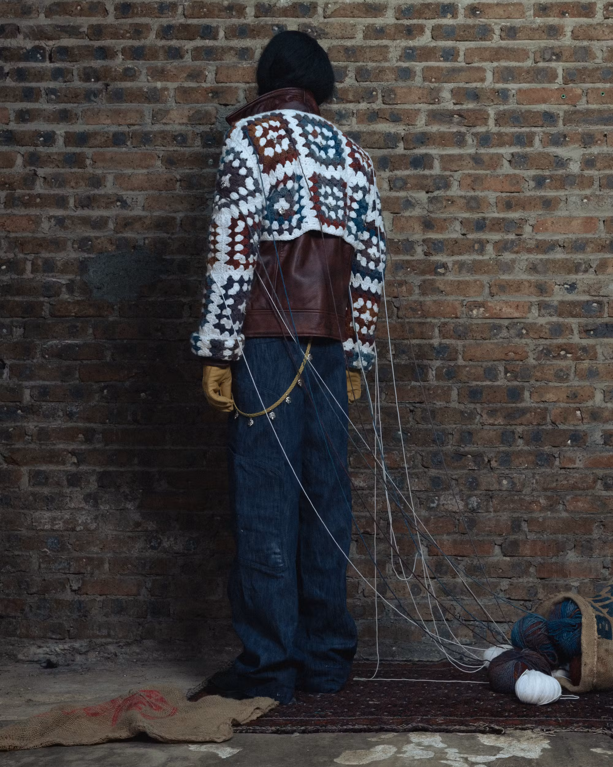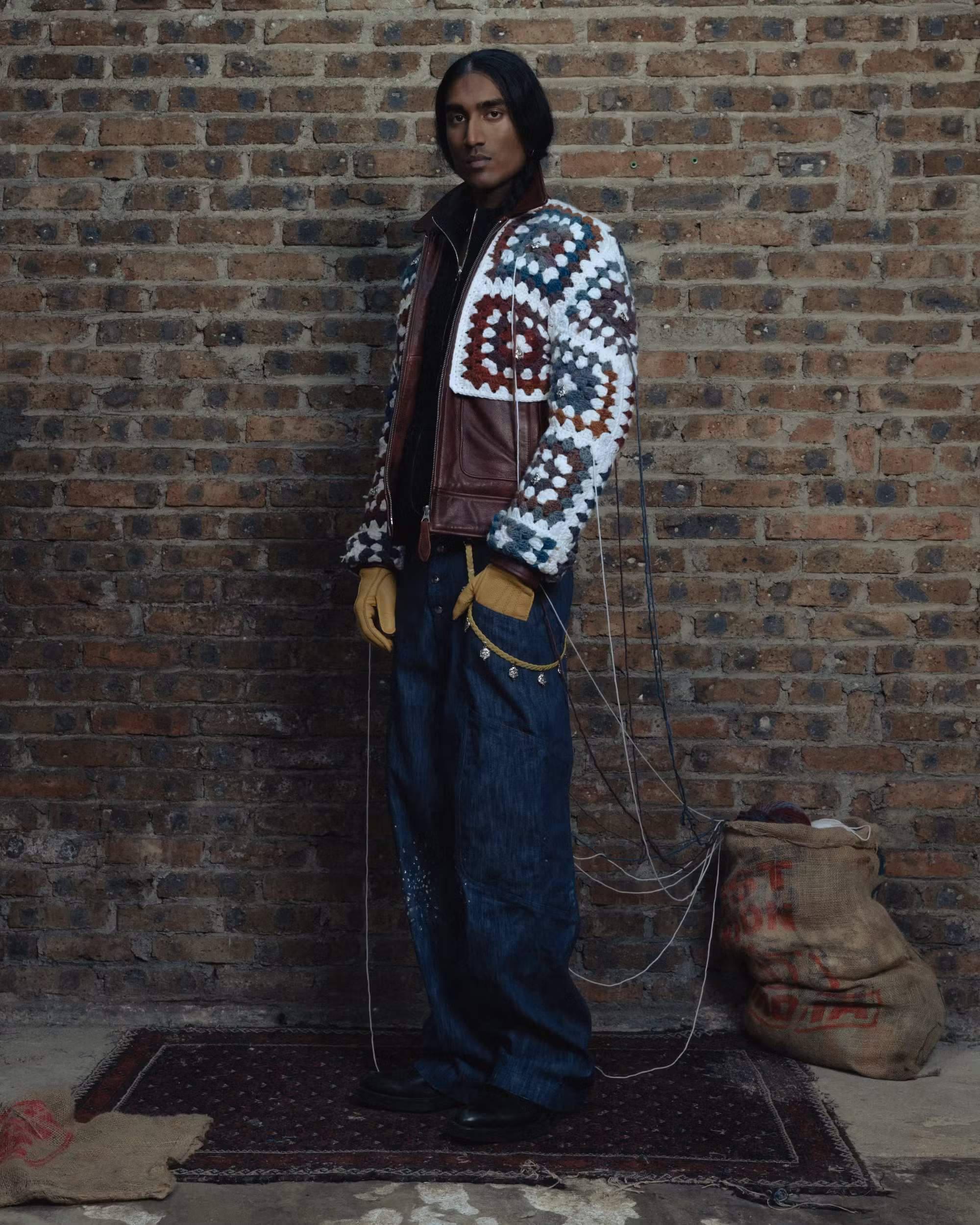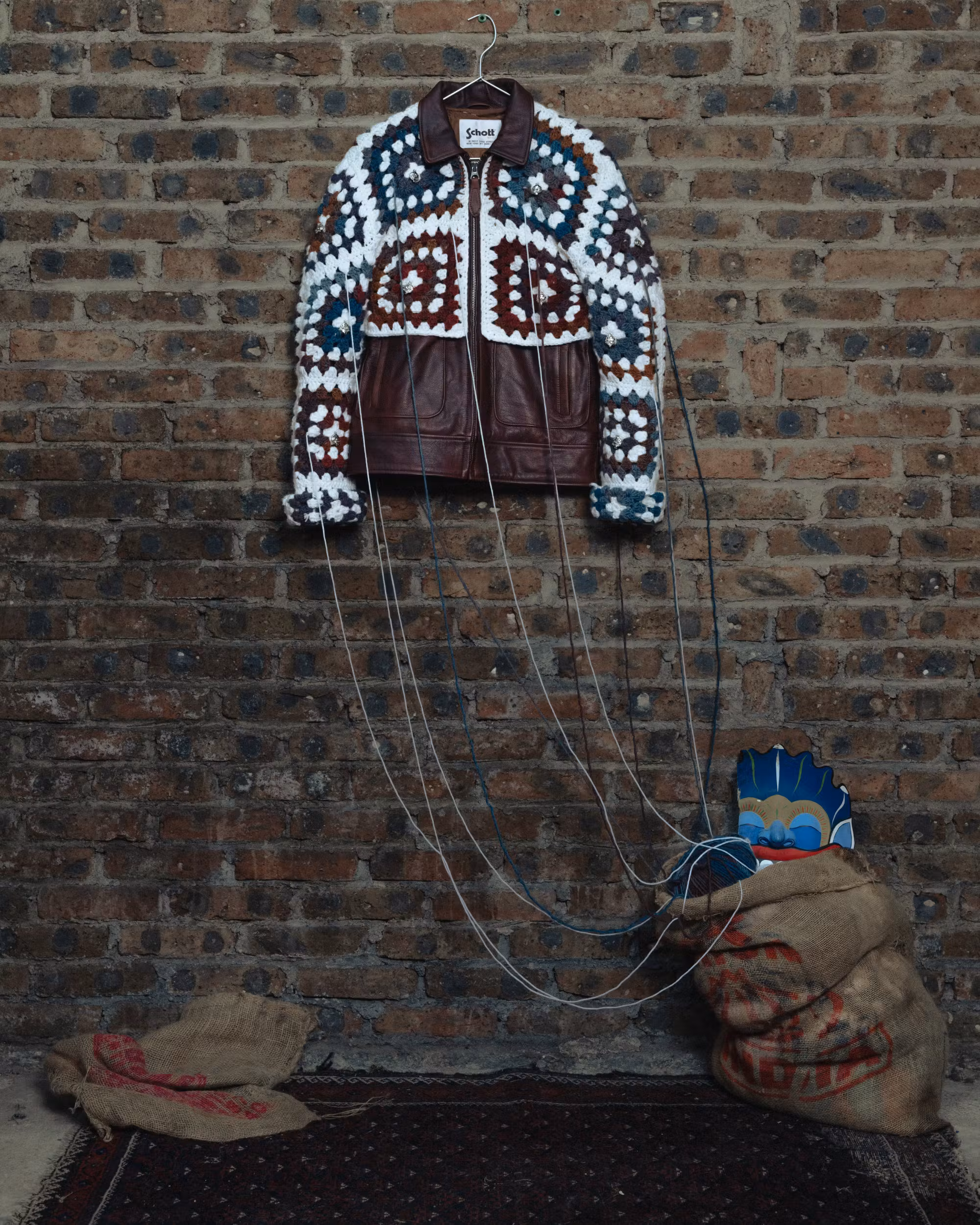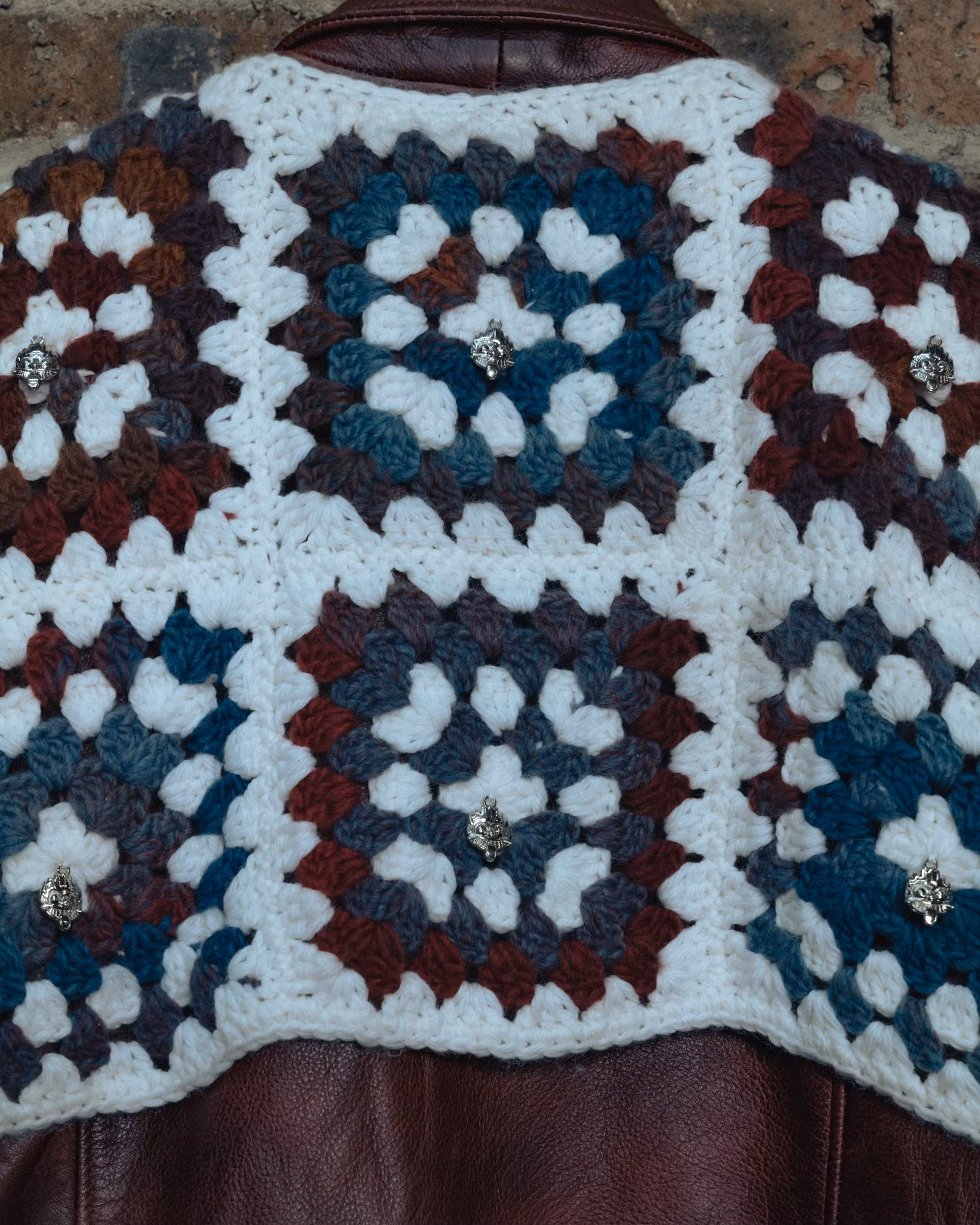 Le produit final prĂ©sente un contraste saisissant : le cuir solide dâun blouson de moto amĂ©ricain rencontre le crochet rustique, multicolore et Ă motifs. Câest un blouson robuste avec une touche artisanale et sri-lankaise.