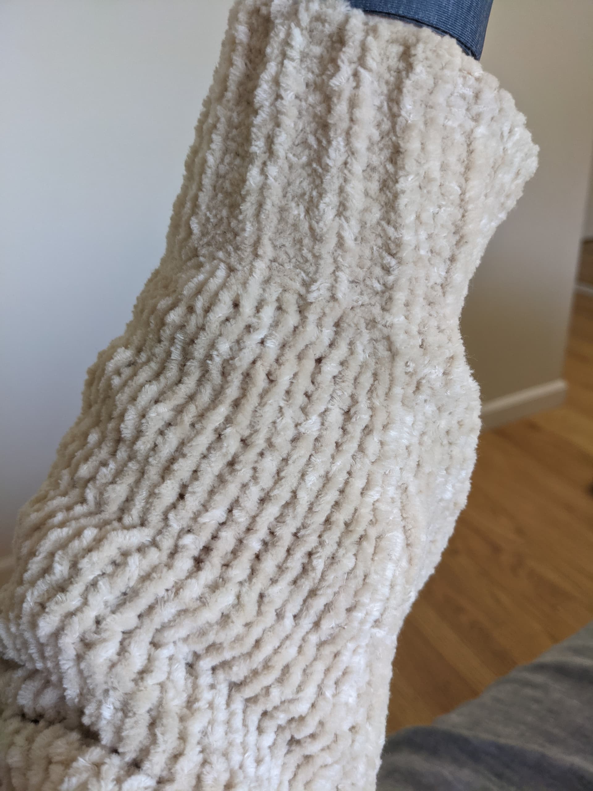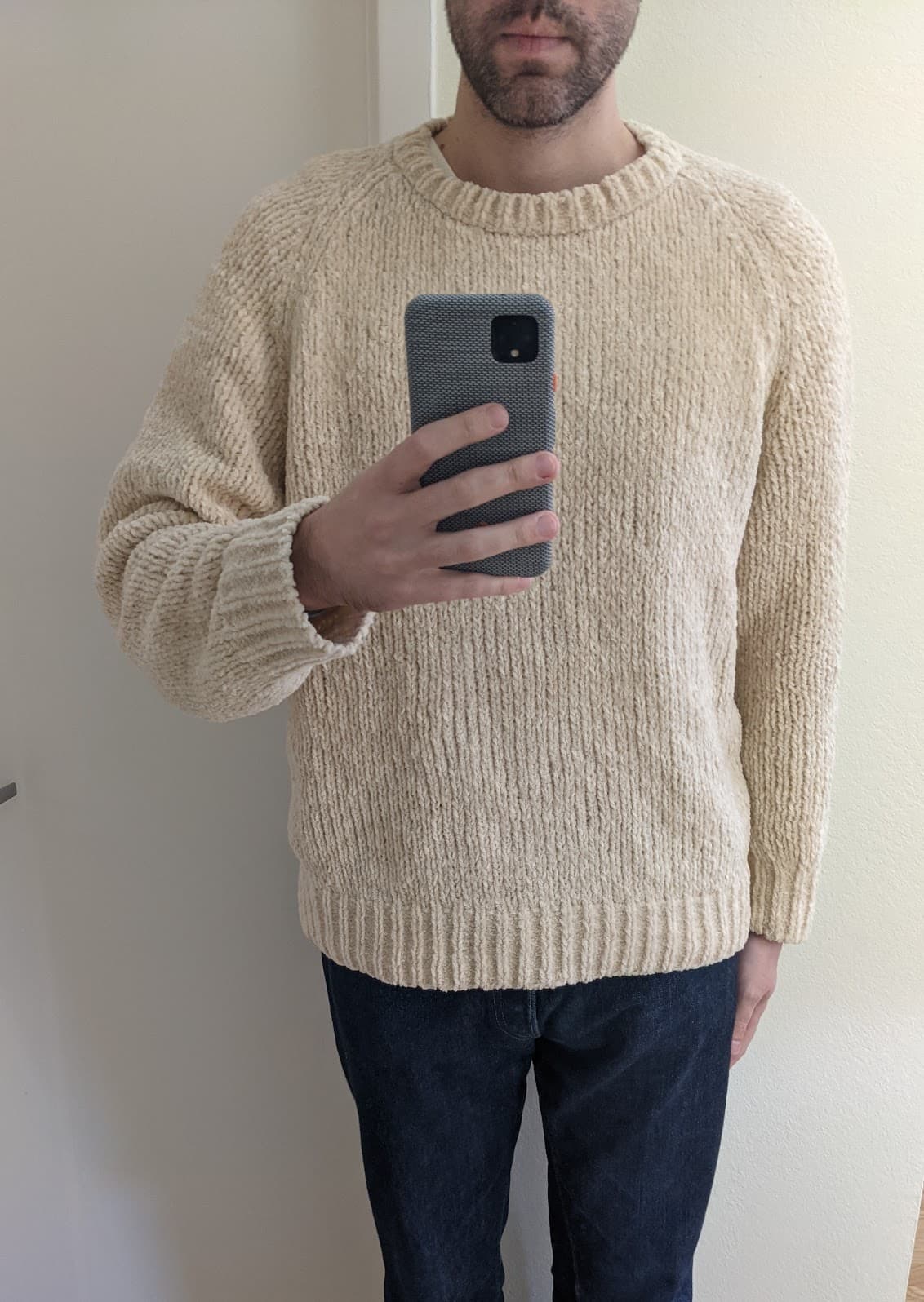 matière très sympa. Je pensai que ce ne serait pas trop chaud vu que c’est à 90% du coton (et 10% de poly, surement pour accomplir cette texture ?)… j’avais tord il tient ultra chaud. Dommage ça veut dire qu’il fait un peu doublon dans ma garde robe.