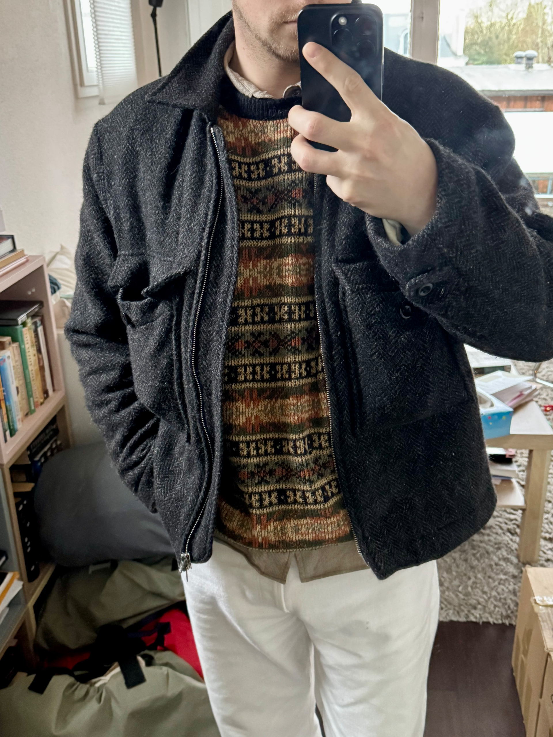 Câest pas un achat mais câest techniquement un last pick up : un vieux pull de mon daron qui dormait dans mes cartons depuis 7-8 ans, et qui fonctionne enfin avec mon style : coupe ample, drop shoulder, cropped. Et en plus ça a lâair de revenir Ă la mode ces motifs.
