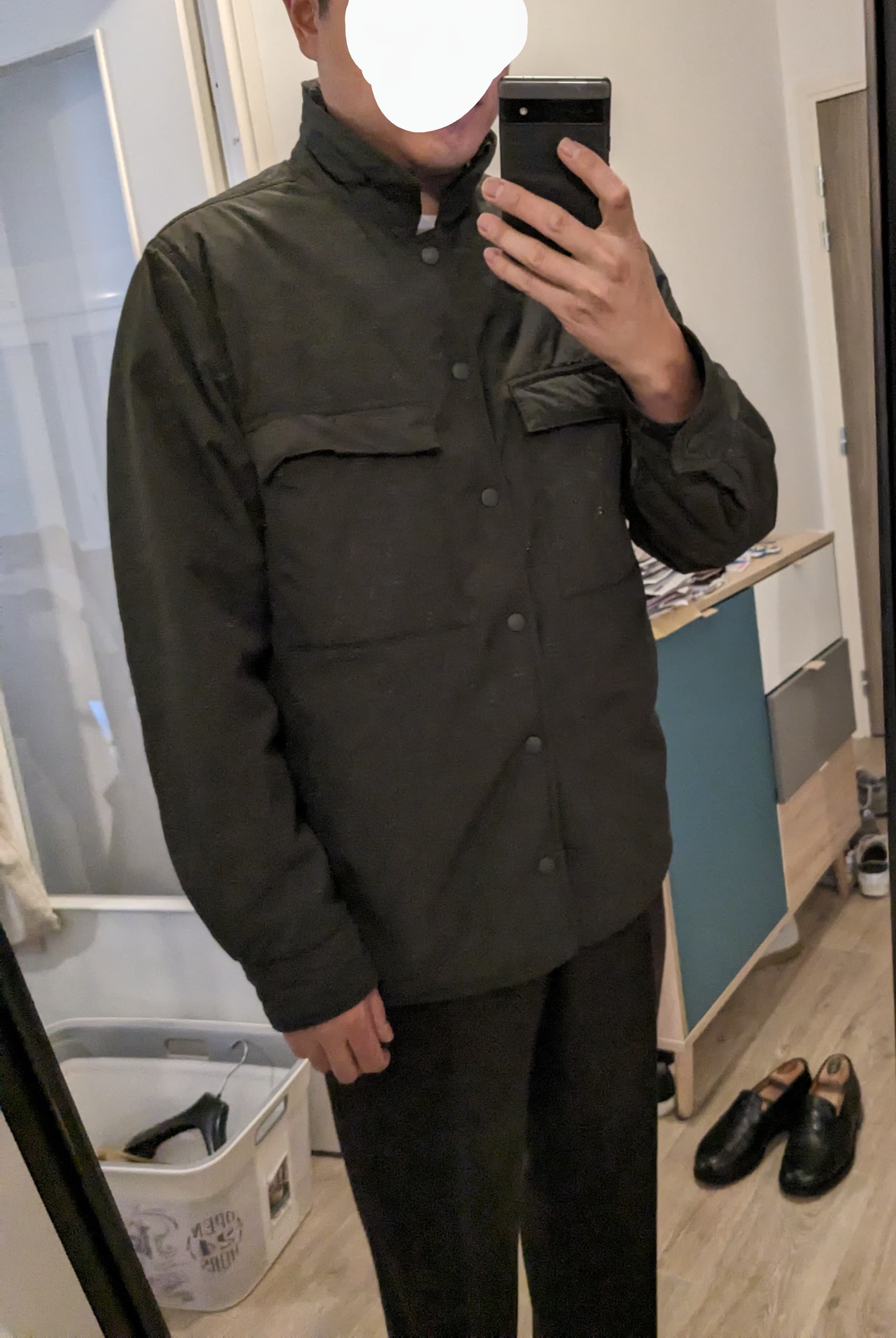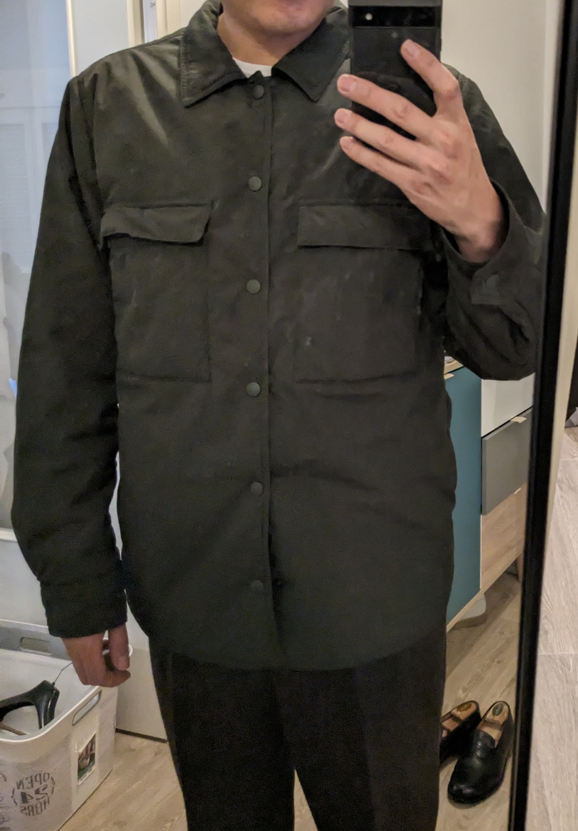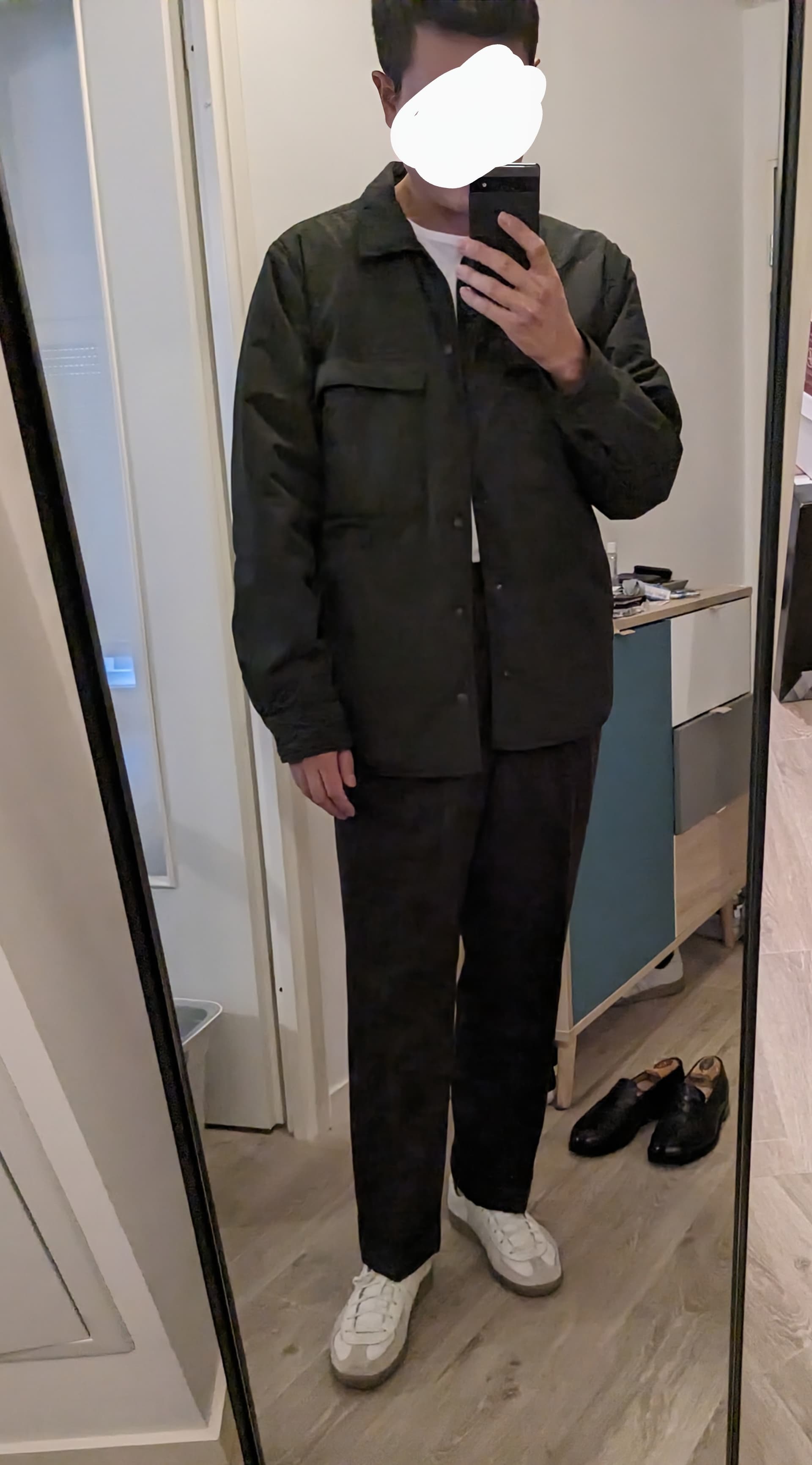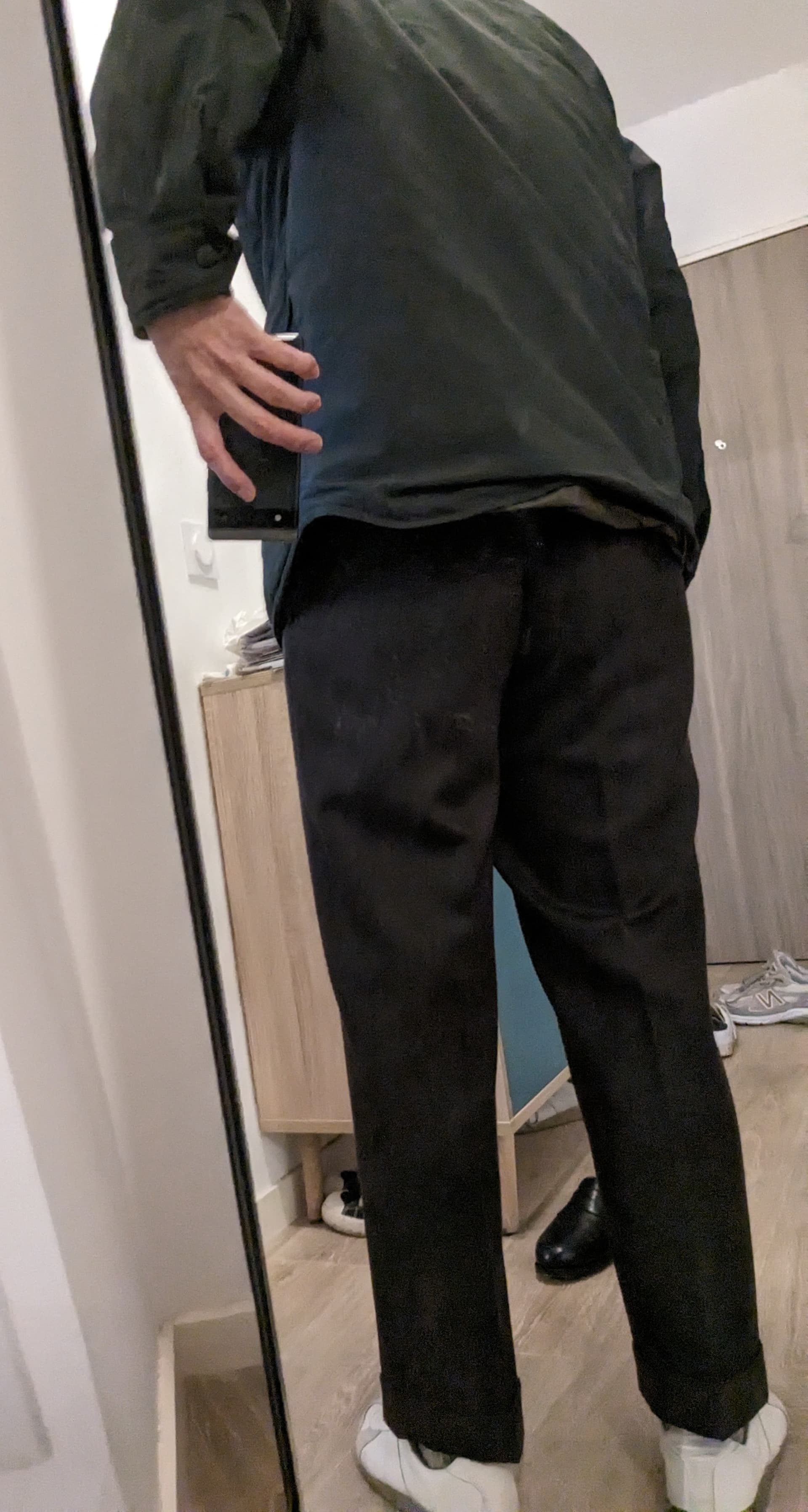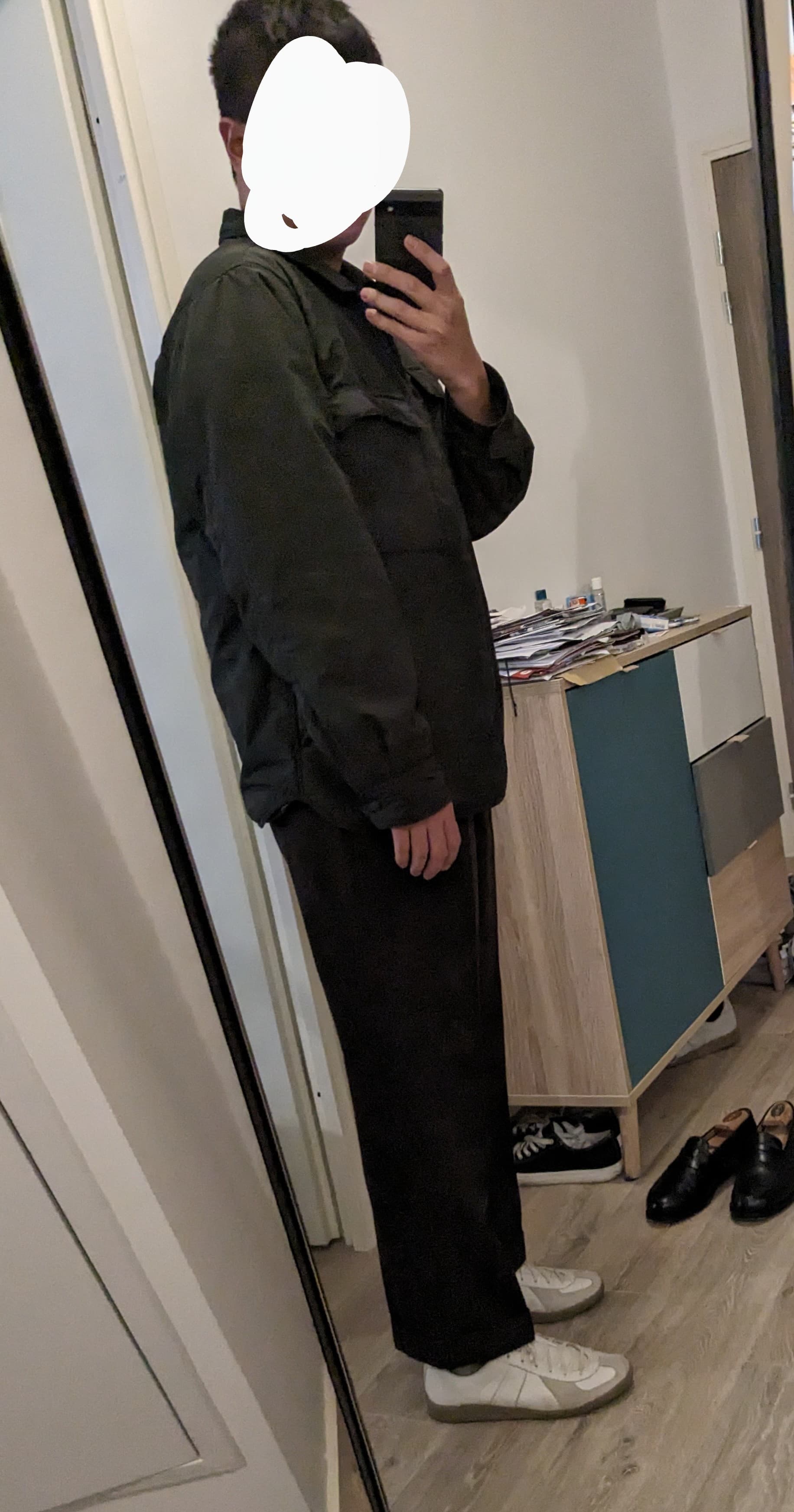Voici quelques photos prises rapidement, avec un pantalon à pinces et un simple t-shirt ça passe très bien, le fit convient bien. Possibilité de mettre une chemise ou un pull en dessous pour plus de chaleur. Pour me taille le layering est peut être compliqué car la veste n’est pas courte non plus, ou alors avec du taille haute et la veste non boutonnée jusqu’en bas, avec un manteau long par dessus.